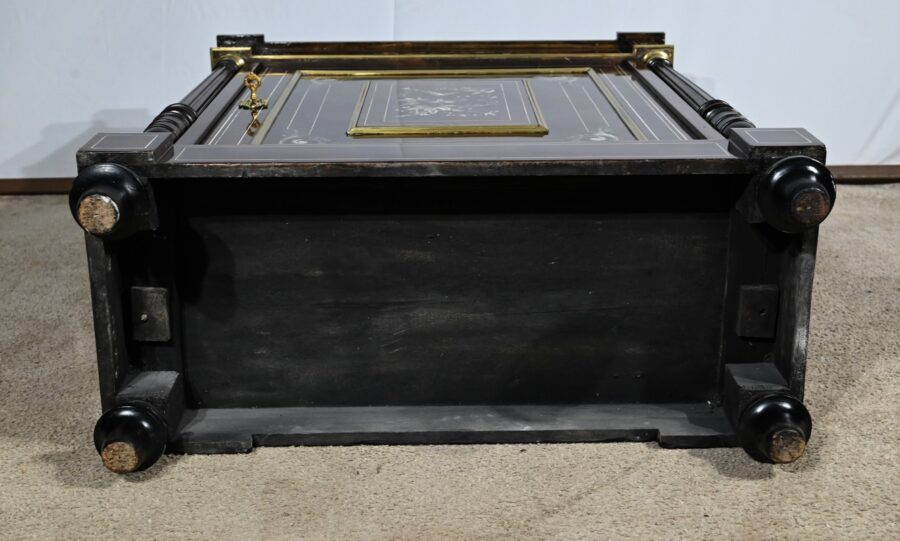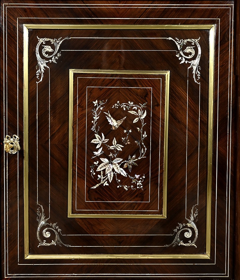 Ce meuble ouvre par une porte décorée d’une marqueterie composée de nacre et d’os représentant un oiseau et des papillons virevoltants autour de branchages sinueux.