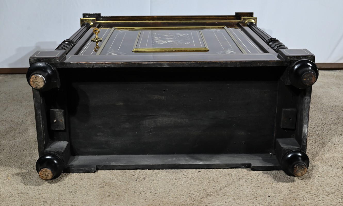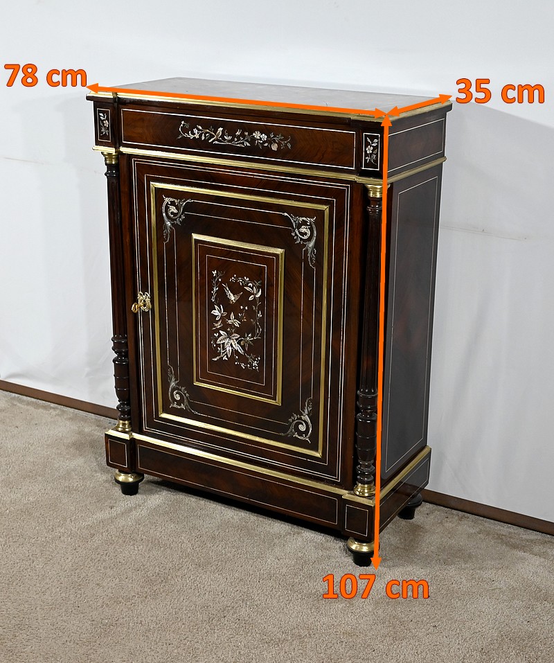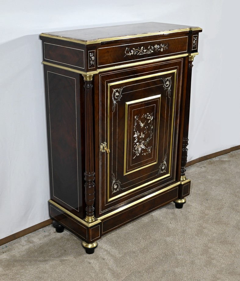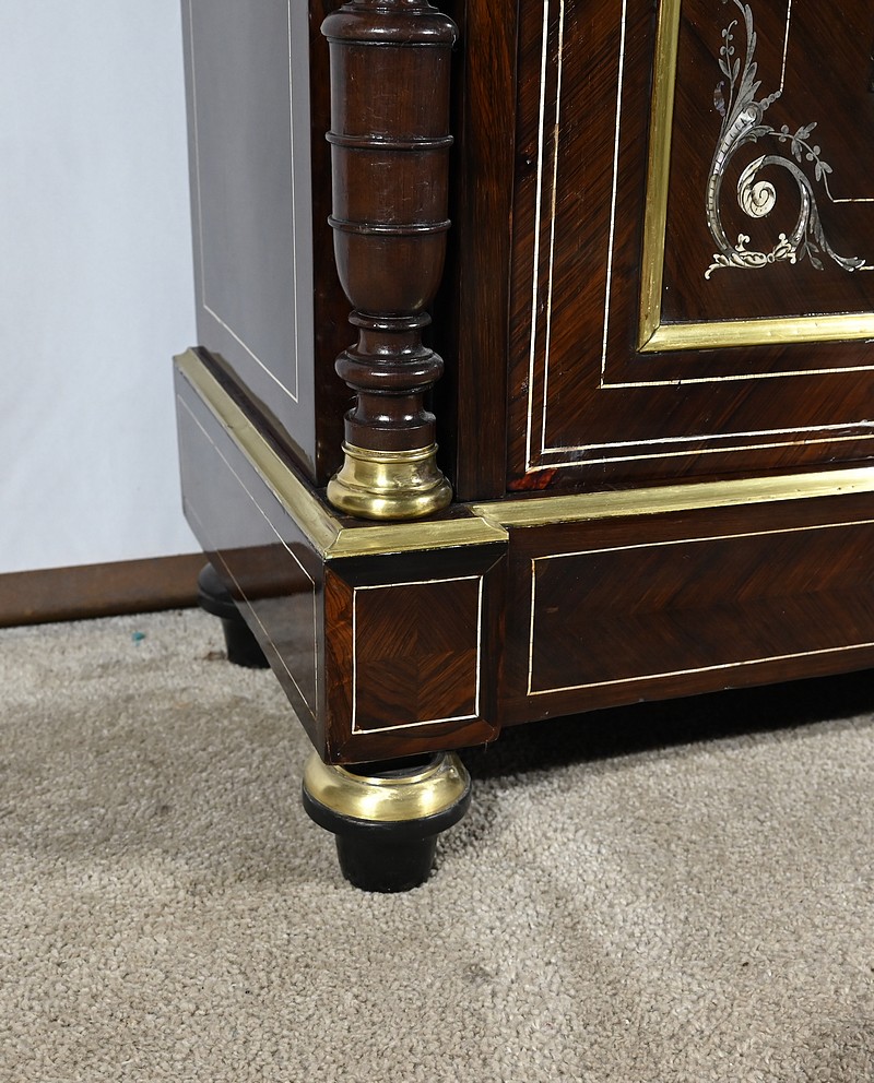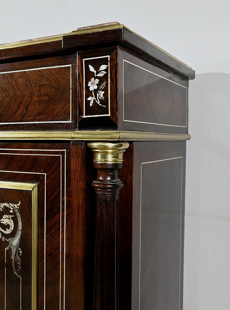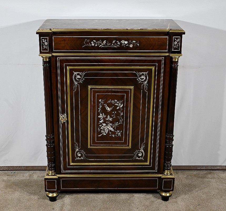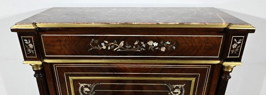 Mobilier Napoléon III en placage de palissandre de Rio, agrémenté de marqueteries de nacre et d’os, et sommé d’un marbre rouge de Monjoi.