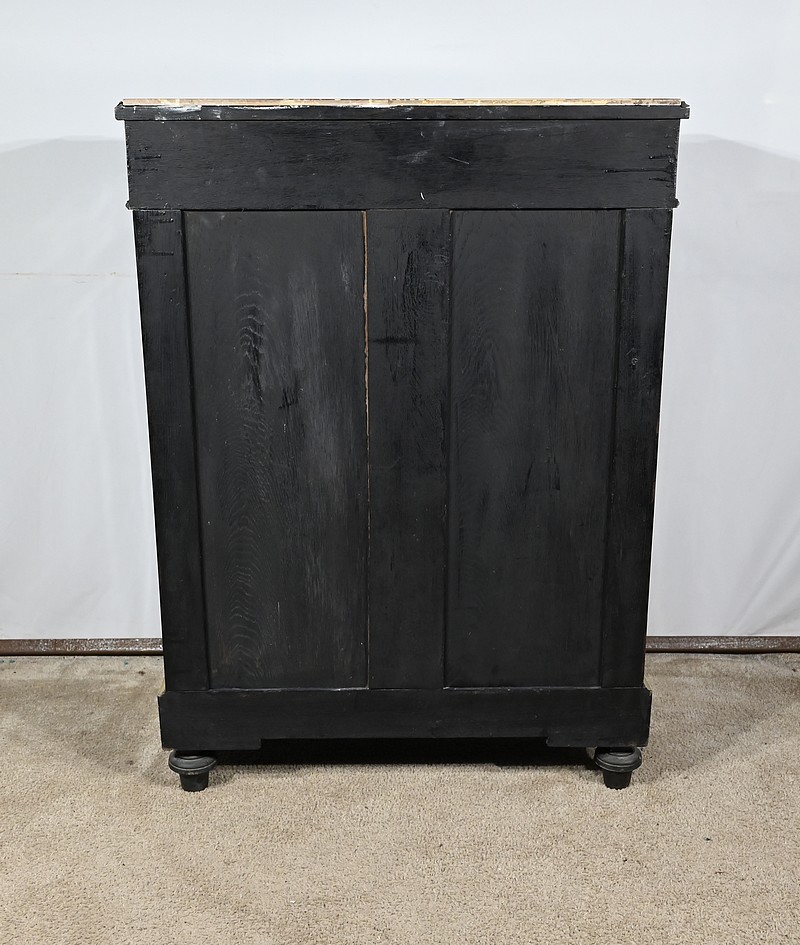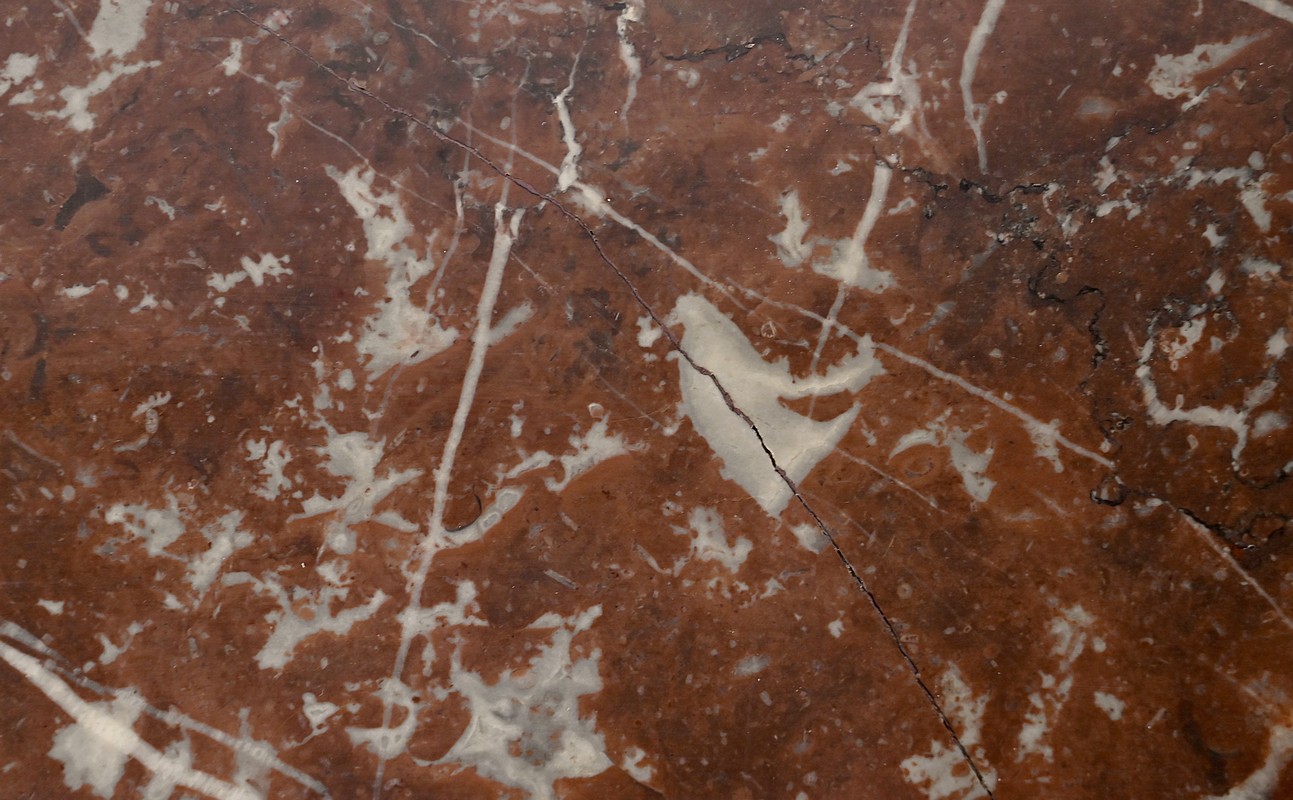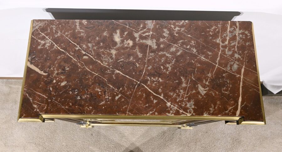 Ce meuble est sommé d’un marbre rouge de Montjoi présentant des fissures peu visibles.