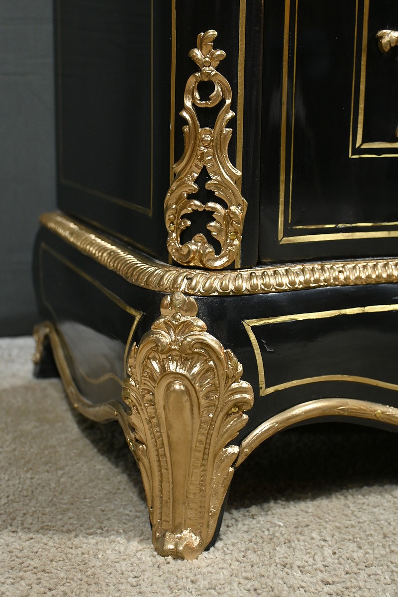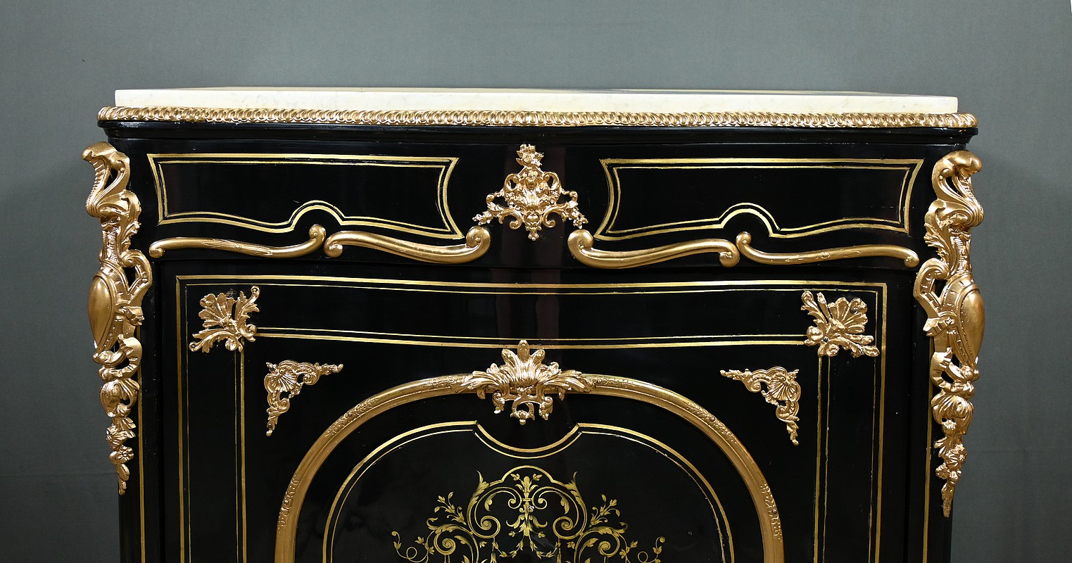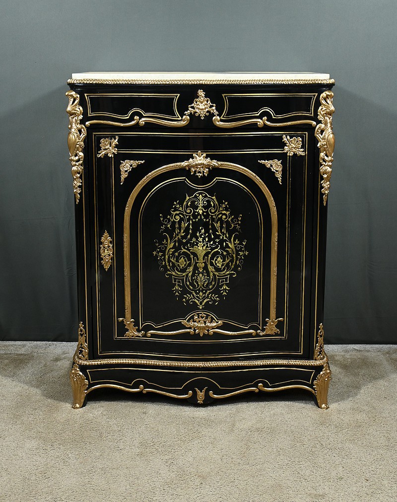 Il s’ouvre par une porte à encadrement, ornée d’une belle composition de laiton ciselé formant rubans, guirlandes de fleurs et feuilles d’acanthe entourant un vase. Celle-ci est entourée de filets de laiton incrustés et d’une arche en bronze festonné. Cette porte est dotée d’une clé ouvragée accompagnant la serrure d’origine en état de fonctionnement. De chaque côté de ce meuble, les montants sont dotés de chutes en bronze doré. En partie basse, des baguettes godronnées en bronze font le pourtour du meuble en décrochement. L’ensemble repose sur quatre pieds volutés. La partie supérieur de ce meuble d’appui est ornementée d’une frise florale entourée de filets de laiton incrustés. Au dessus, un marbre blanc de Carrare veiné de gris est encastré et ceint de lingotières bronze façonné.