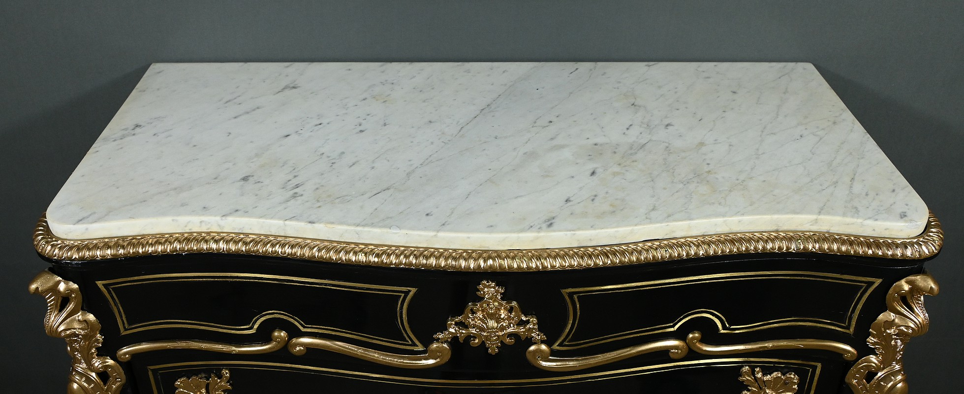 Élégant meuble d’appui Napoléon III en poirier noirci, sommé d’un marbre de Carrare, agrémenté d’ornementations en bronze doré et incrusté de laiton ciselé à motifs de rinceaux, de feuillage, de fleurs et de rubans.