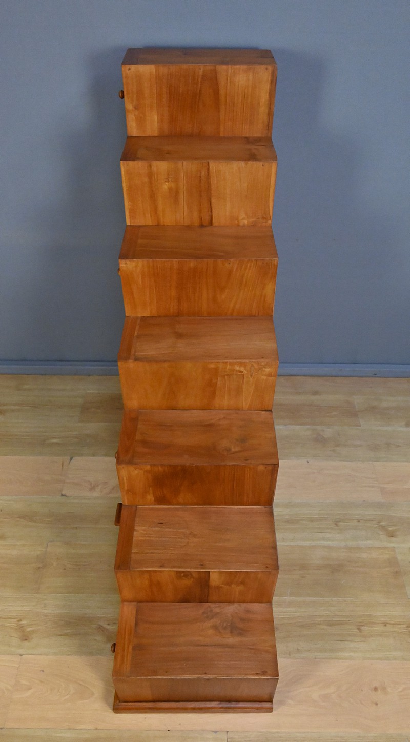 Ce meuble sculptural, à la silhouette géométrique, incarne l’ingéniosité et la poésie du mobilier traditionnel asiatique. Conçu en teck massif, il s’inspire des célèbres kaidan tansu japonais qui servaient autrefois à la fois de rangement et d’escalier dans les maisons à étages.