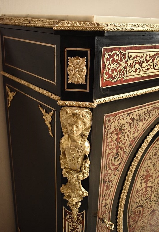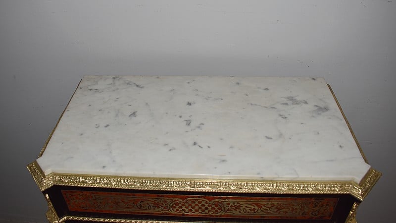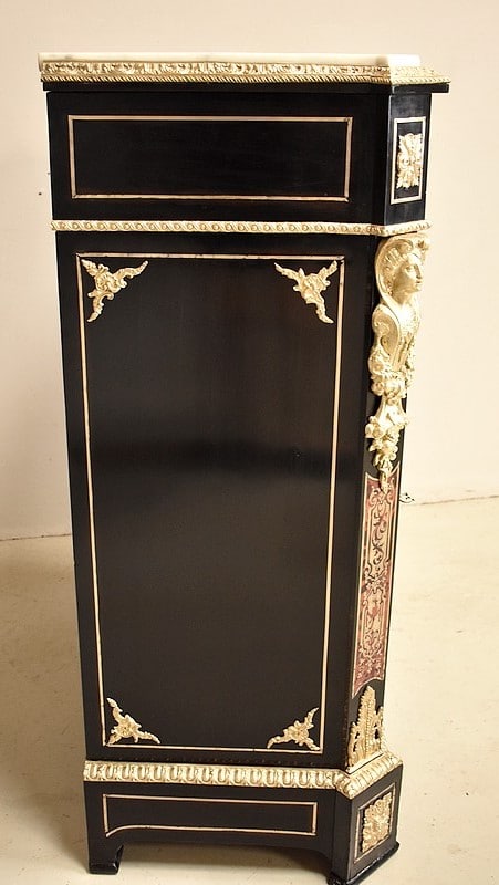 Meuble d’appui NAPOLÉON III en marqueterie ‘Boulle’ d’écaille de tortue rouge et de laiton sur bois naturel noirci. Dessus de marbre blanc (repoli) ceint d’une moulure en bronze ciselé et doré.