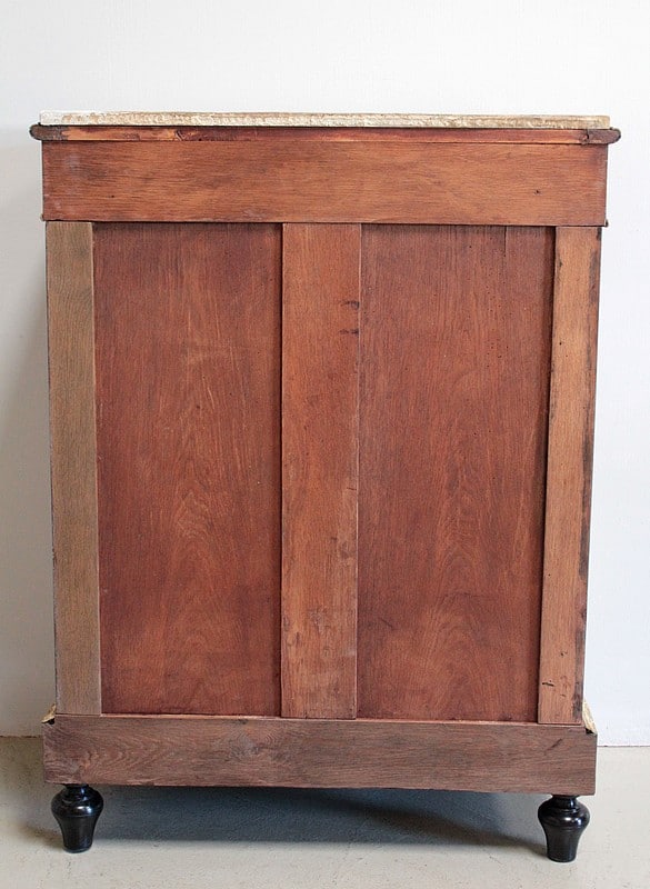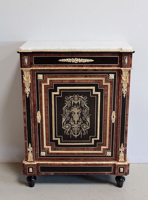 Son dessus est en marbre blanc et la porte est décorée d’une marqueterie de laiton à motifs de vase fleuri, de draperies et de rinceaux.