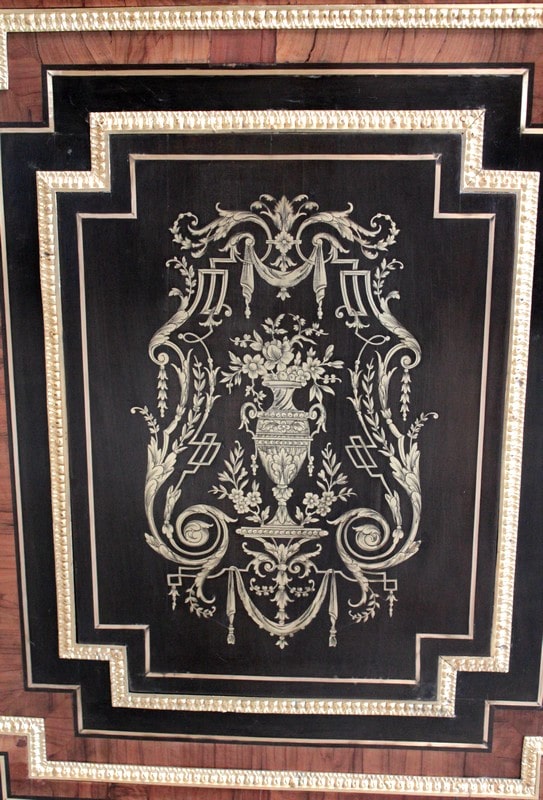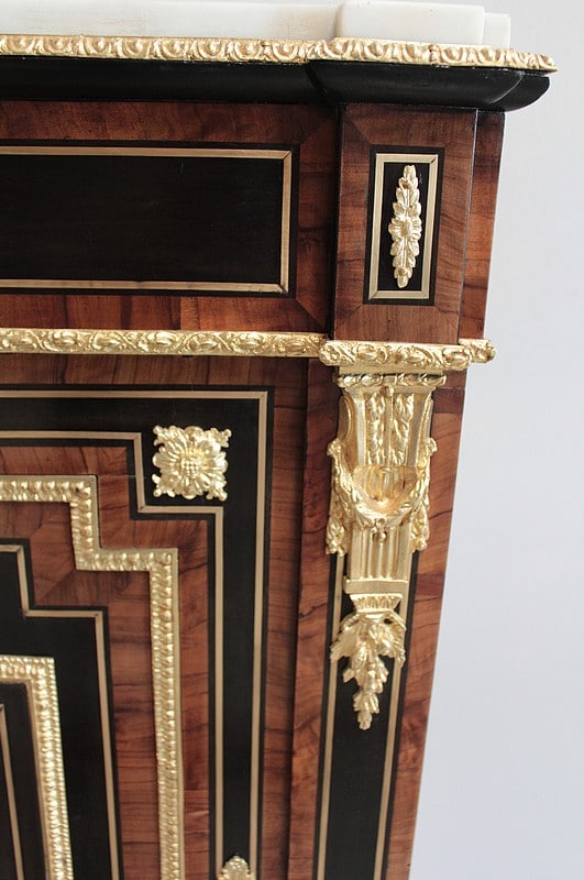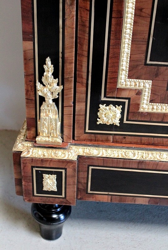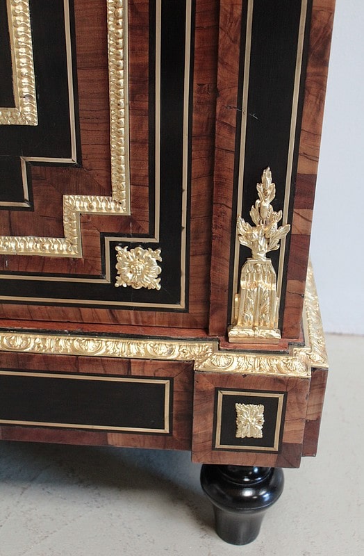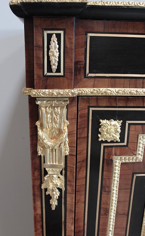 Il est richement ornementé de bronzes : entrées de serrure, palmettes, chutes, filets et moulures ciselées à découpe ‘grec’.