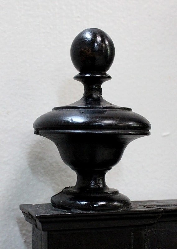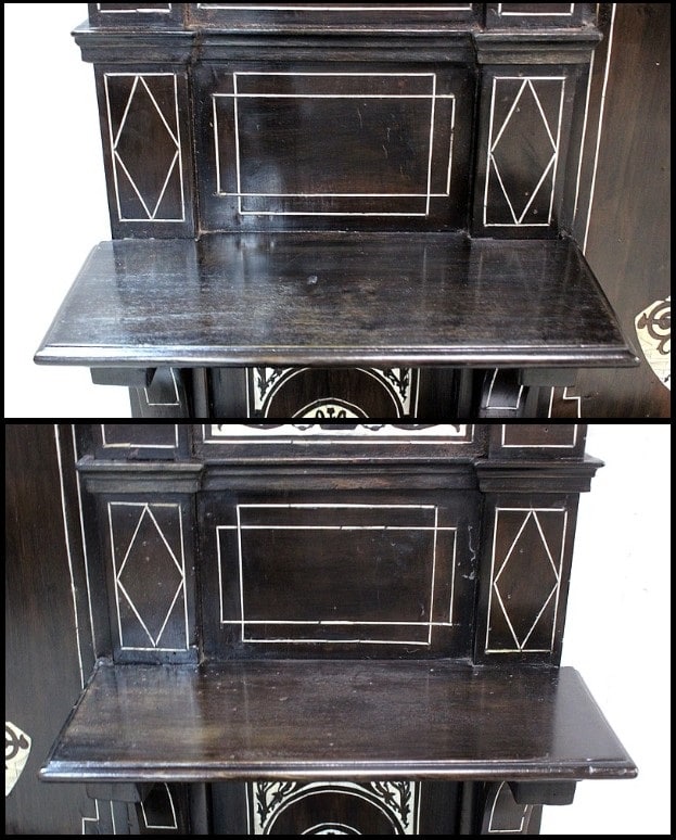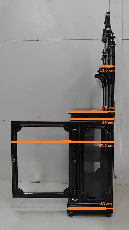 Sa partie basse ouvre par une porte vitrée, avec encadrement mouluré et angles arrondis. Elle révèle un espace d’exposition garni d’une étagère de 34.5 cm, posée sur tasseaux fixes. Ce vantail est doté d’un verrou en état de fonctionnement et de sa clé. Les côtés de cet élément inférieur sont également vitrés, et ils présentent les mêmes entourages que ceux décrits précédemment. Les angles avants de ce meuble sont en retrait, laissant place à deux colonnes tournées, enjolivées de Bagues en Ivoire hautes et basses. Outre leur aspect esthétique, ces montants servent également de supports à la ceinture de cette Vitrine, et à son plateau aux bords saillants. Cette partie basse est agrémentée d’incrustations d’Ivoire, disposées en filets et Rinceaux.