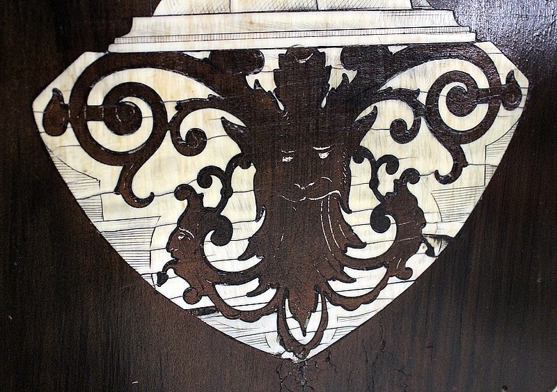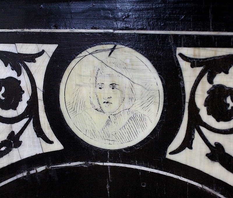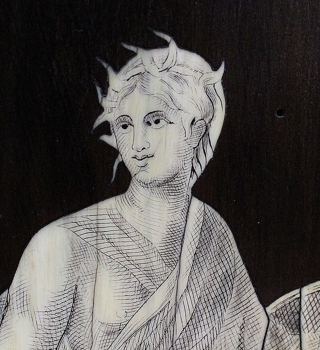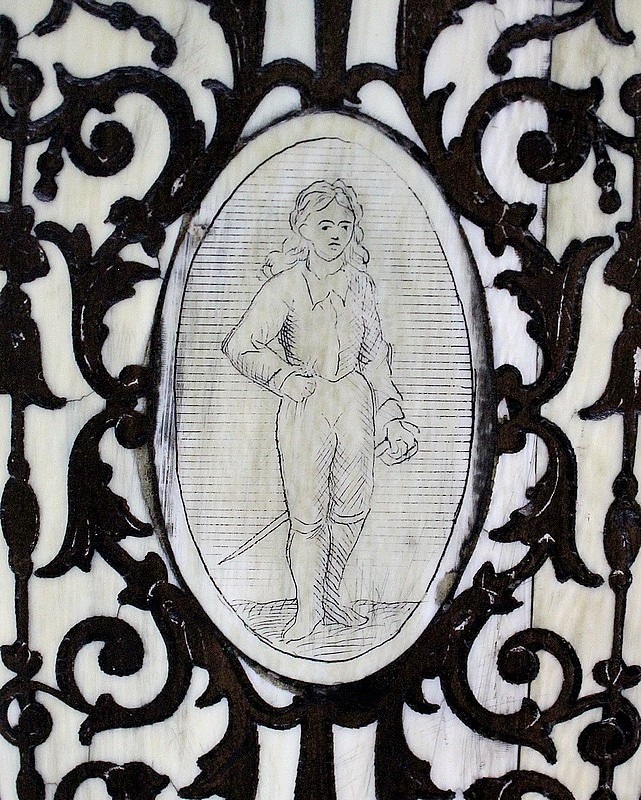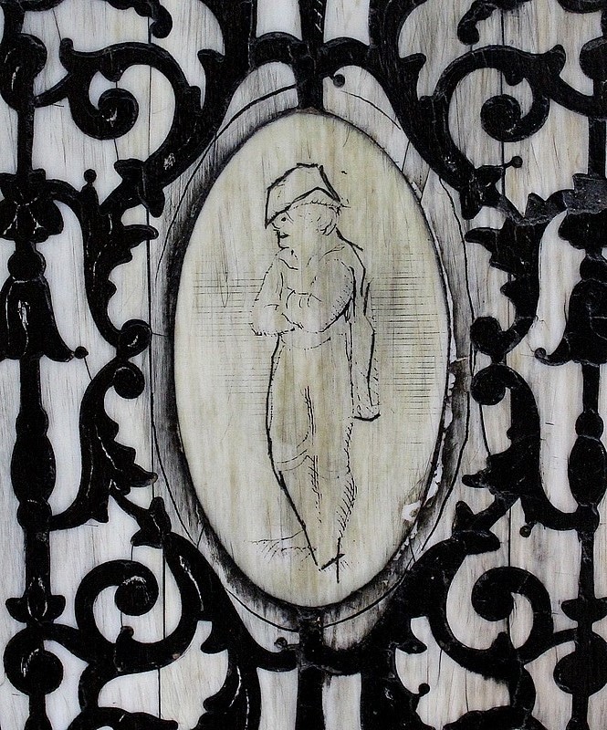 On retrouve, en plus grand nombre, des Décors similaires et autres Arabesques sur le Dosseret aux contours découpés de ce meuble. Cet élément supérieur est pourvu de petites Corniches ornementales, et de deux tablettes posées sur consoles pleines. On retiendra surtout la finesse des personnages ainsi que du Pélican présents sur ce Dosseret. Ces Marqueteries, qui semblent inspirées de l’Art Italien des années 1850, sont le résultat d’un travail minutieux et de Qualité.