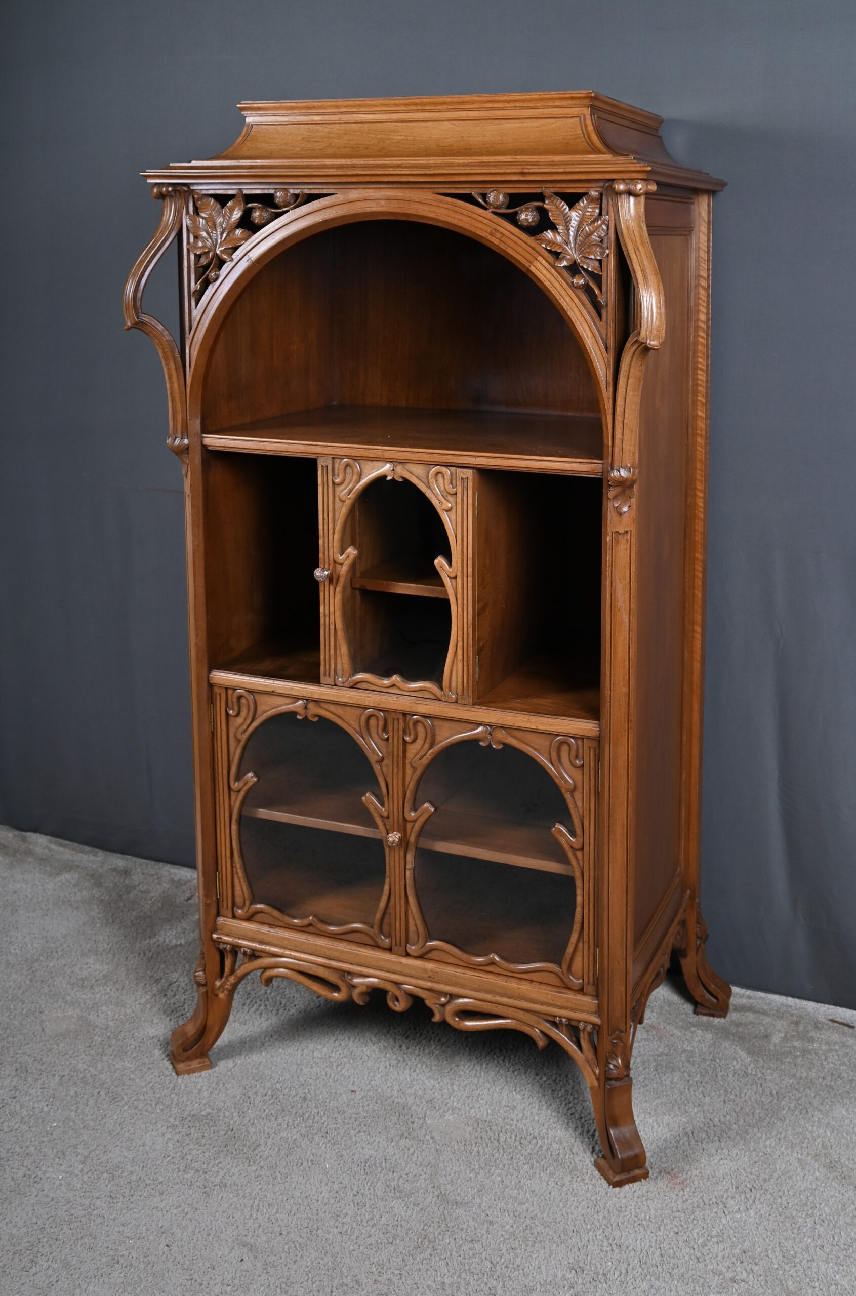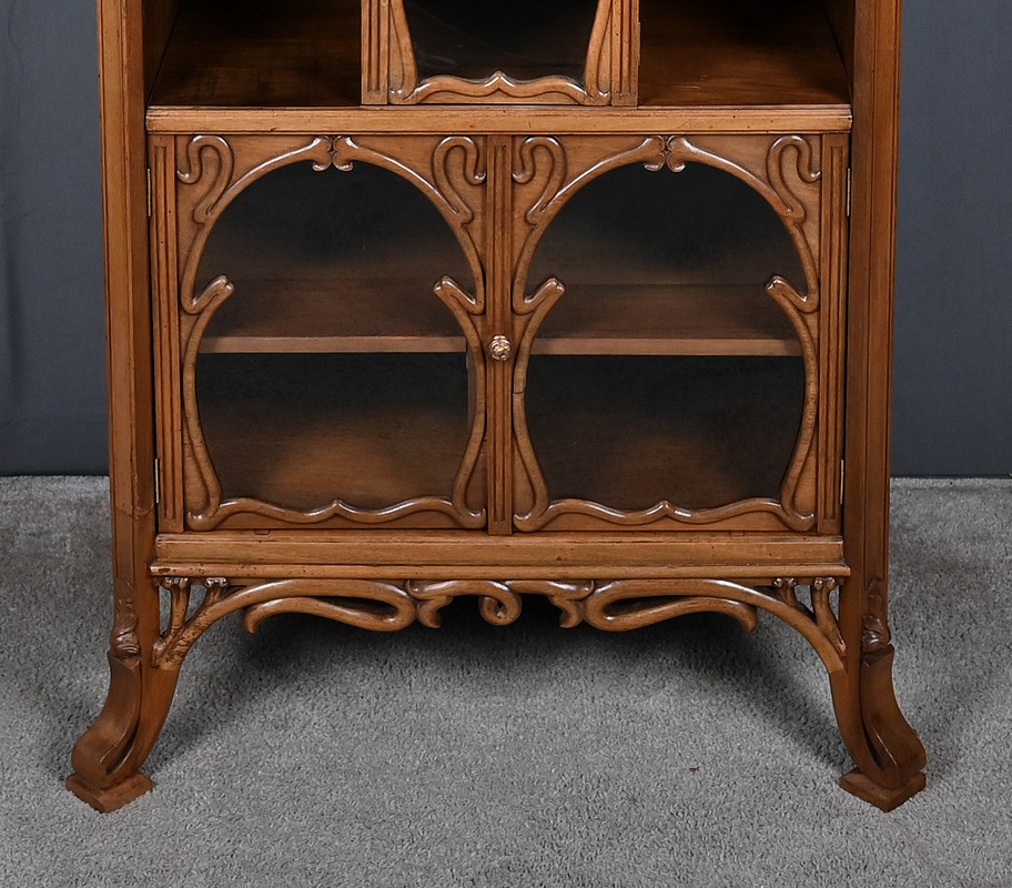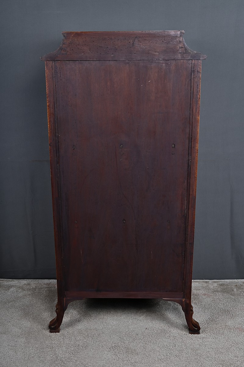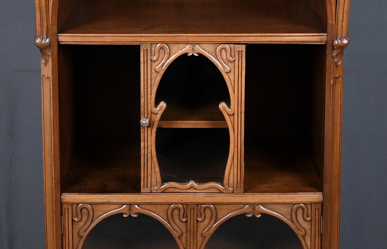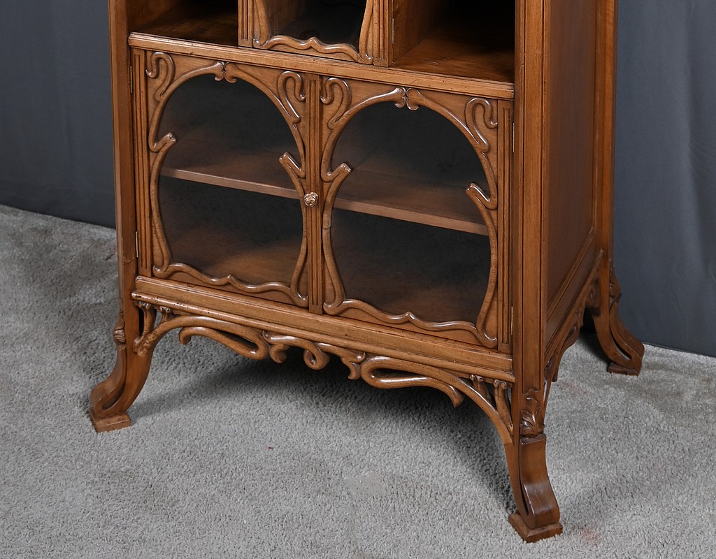 La partie centrale est composée d’une porte vitrée accompagnée de niches latérales. Enfin, la partie inférieure est composée de deux portes vitrées, encadrées de montants sculptés, permettant d’exposer avec élégance vos objets précieux.