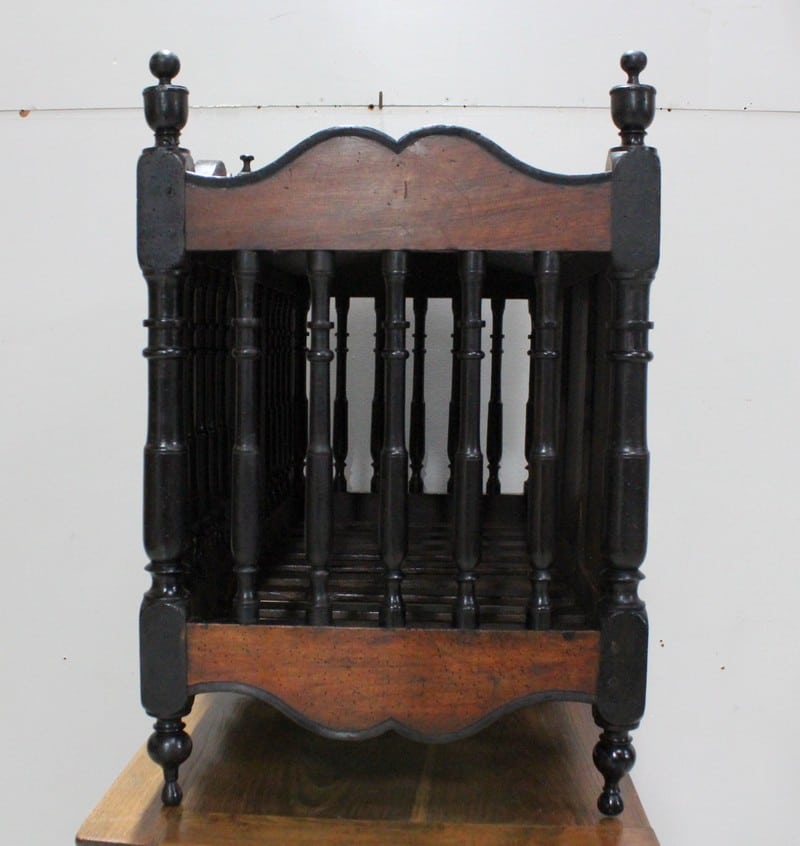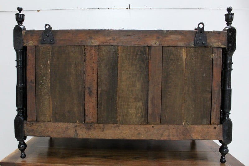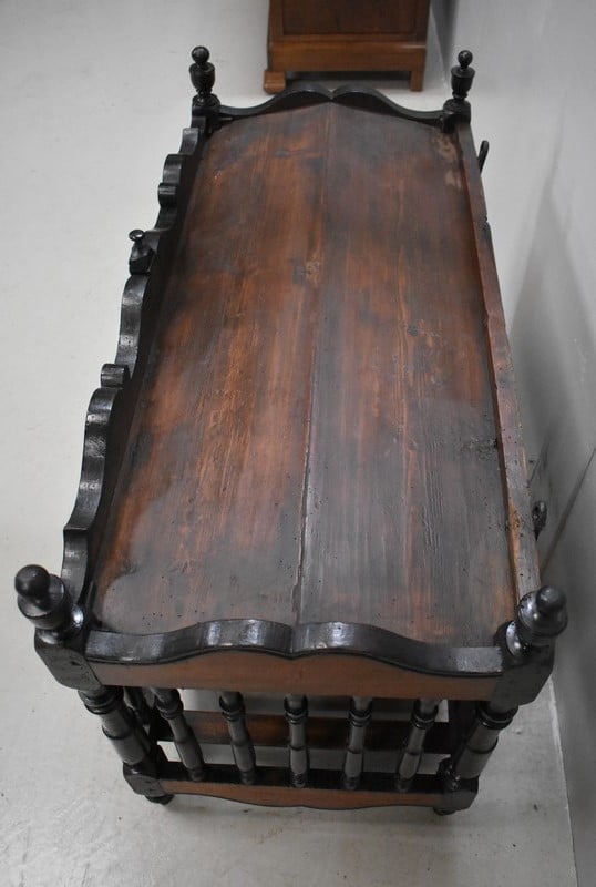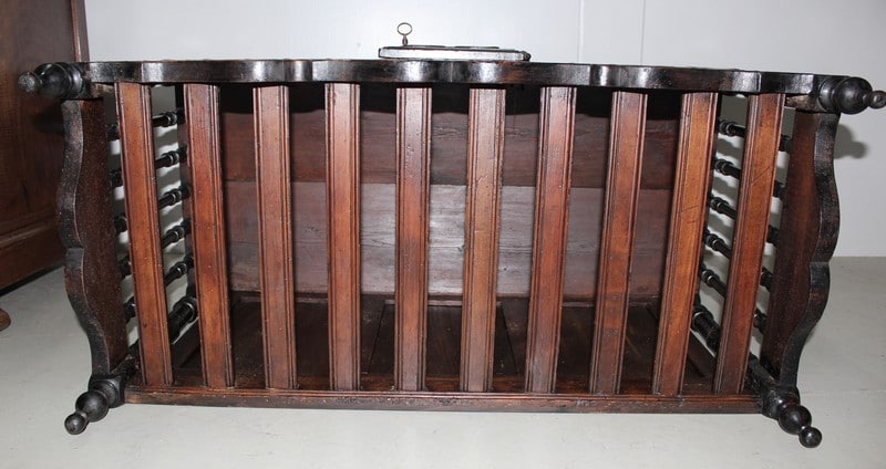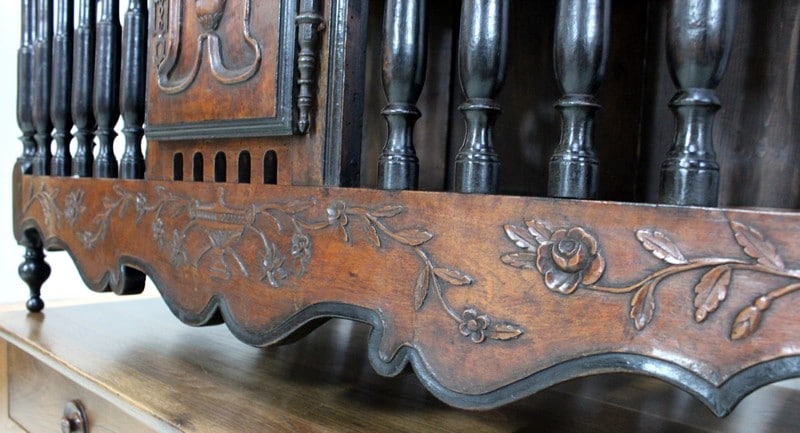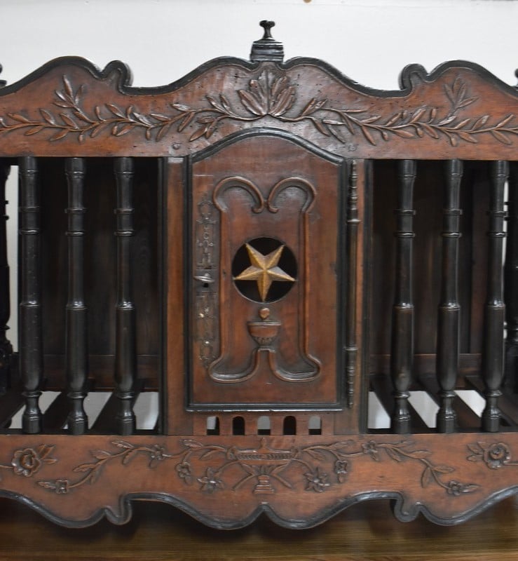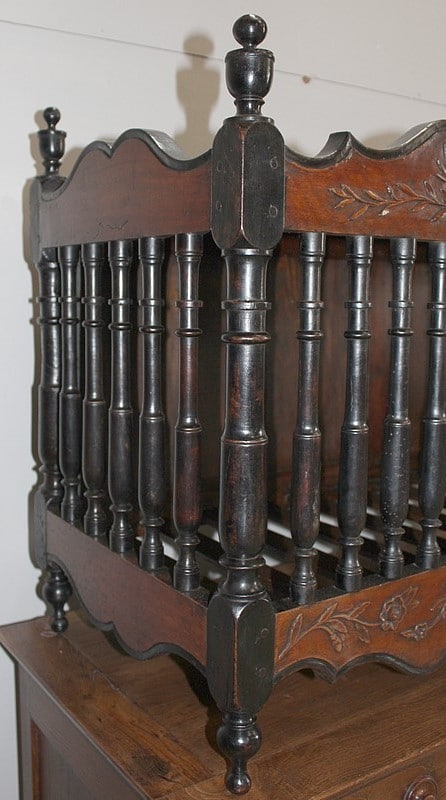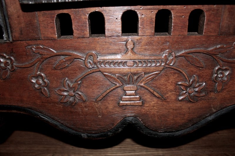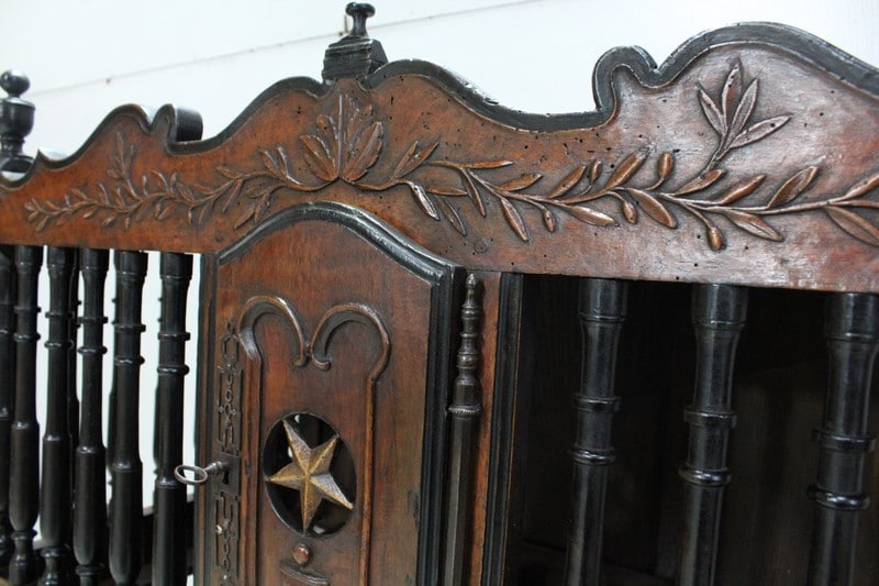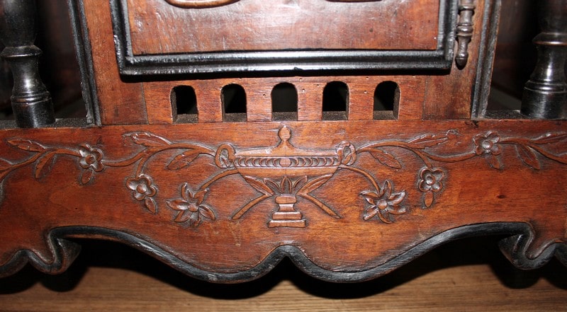 Panetière provençale en noyer, à barreautages tournés et noircis. Elle est finement sculptée d’un vase et de branches fleuries. Elle est d’une sobriété peu commune.