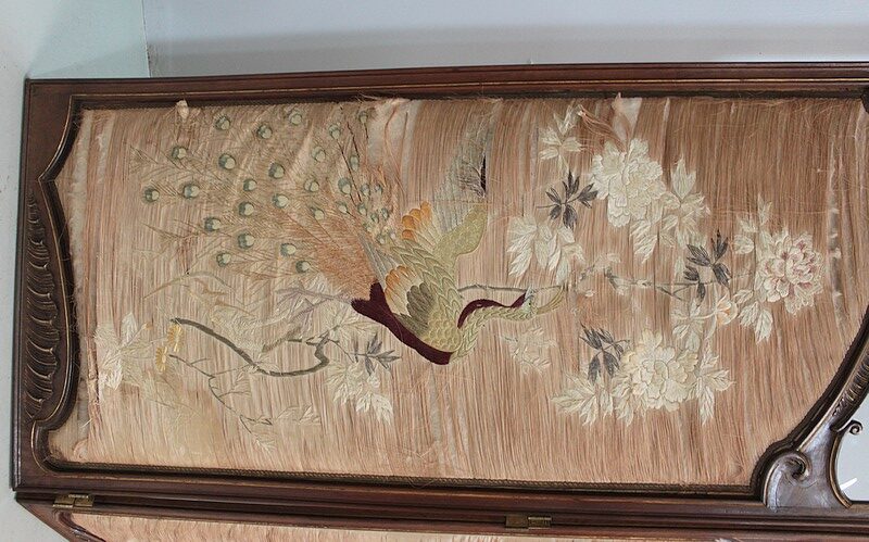 La partie basse est recouverte d’une broderie – dans l’état – à décor d’oiseaux et de fleurs.