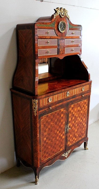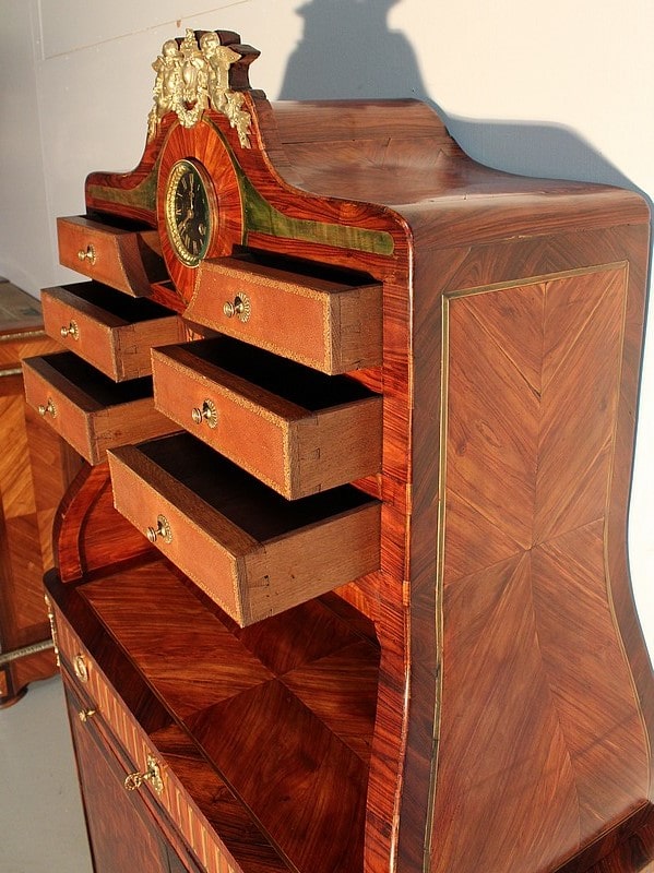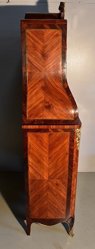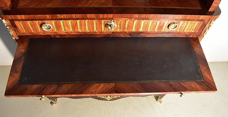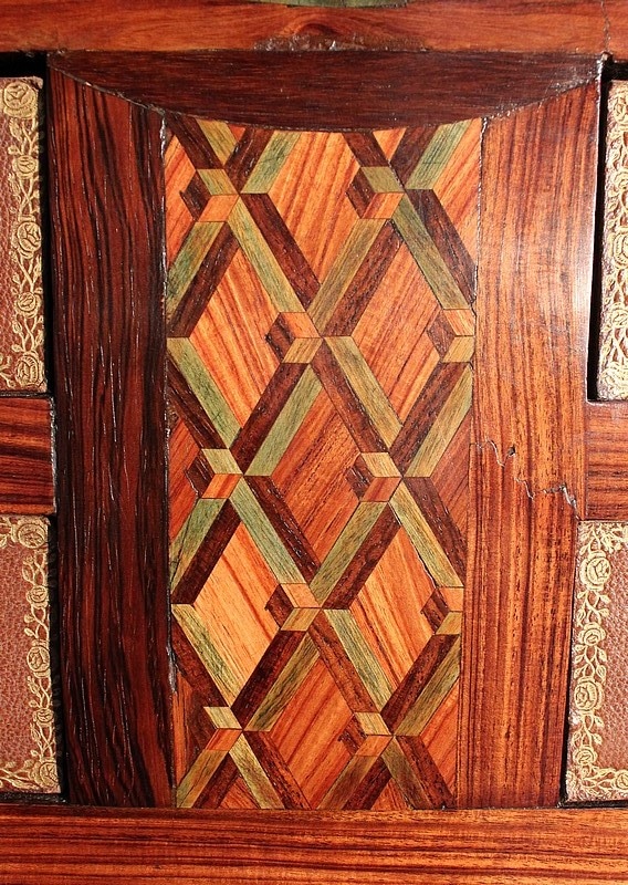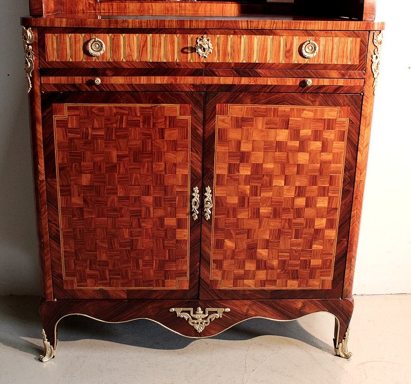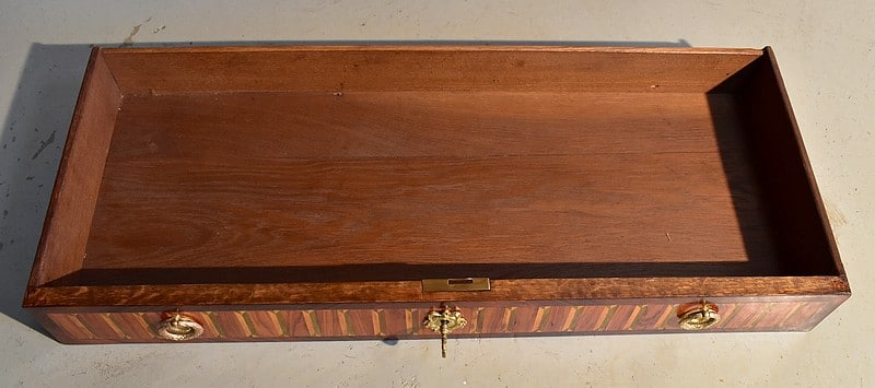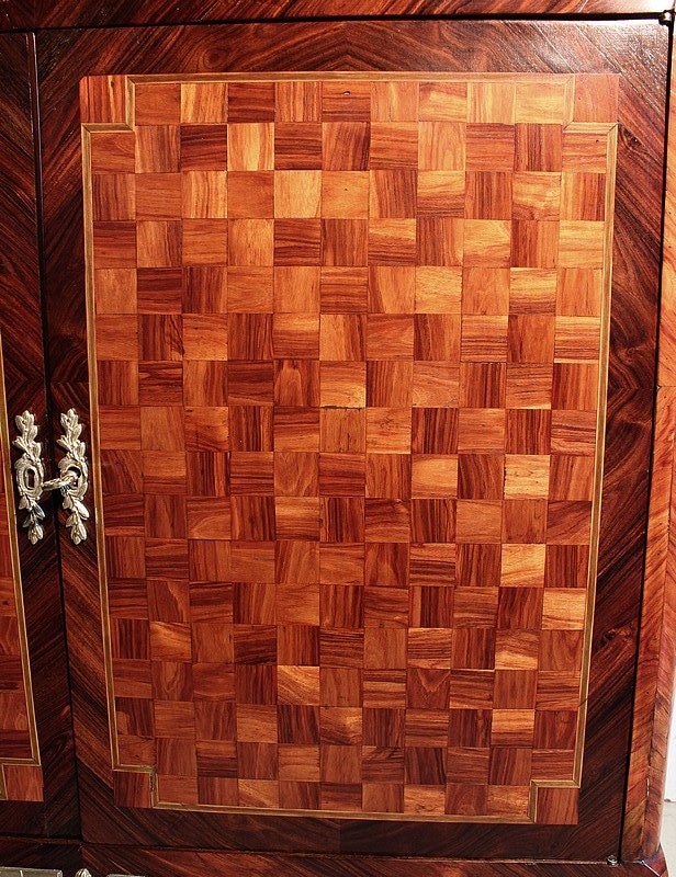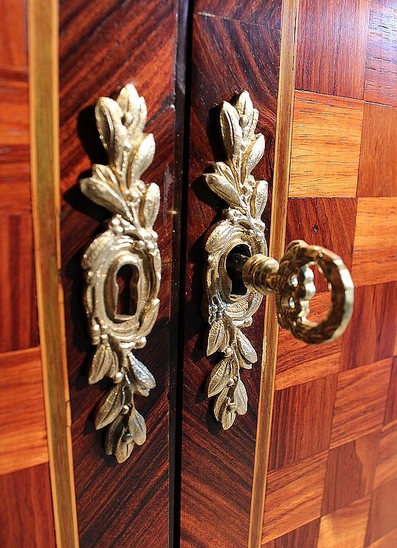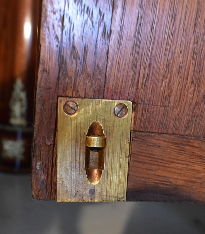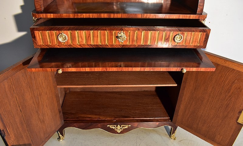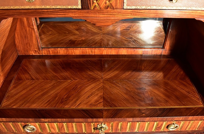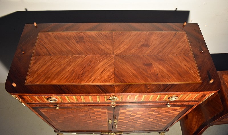 Le dessus de la partie basse de ce meuble offre une marqueterie composée de 4 rectangles encadrés d’une fine bordure. Ce 2ème corps ouvre en ceinture par un tiroir, agrémenté d’un décor marqueté rappelant celui de la partie haute. Il est orné de poignées de tirage et d’une serrure en laiton. Celle ci est en état de fonctionnement et est pourvue de sa clé. Sous ce tiroir on trouve une tablette, recouverte d’une pièce en cuir encadrée de subtils décors de fleurs. Elle s’ouvre par 2 poignées de tirage. Enfin, la dernière partie de ce 2ème corps offre 2 étagères de rangement, respectivement de 28.5 et 28 cm de hauteur et fermant par 2 portes, l’une équipée d’une serrure, l’autre d’un fermoir métallique dans le bas. Les façades de ces portes sont ornementées de marqueteries en bois de Rose représentant des damiers avec un pourtour en bois d’amarante.