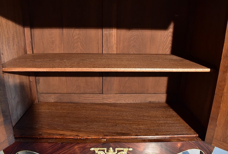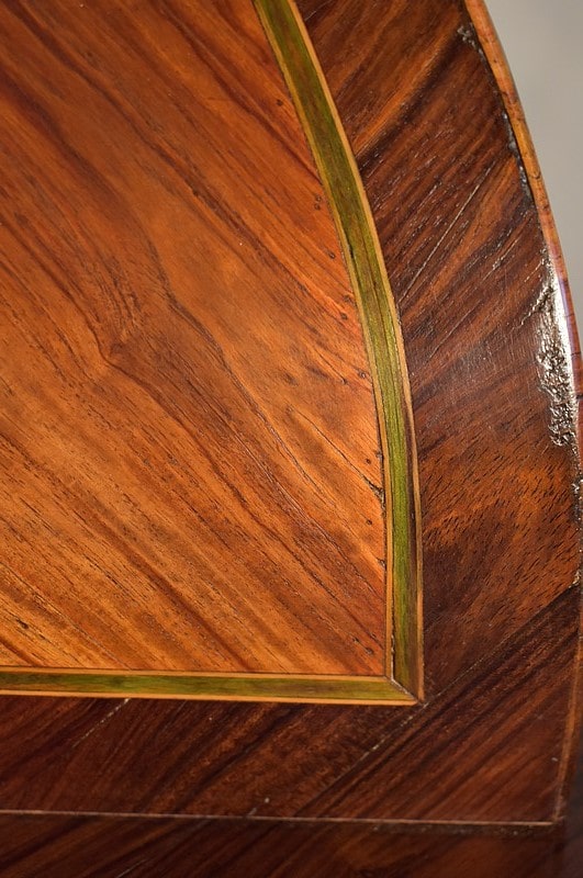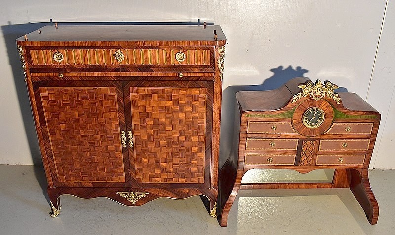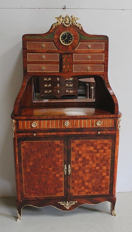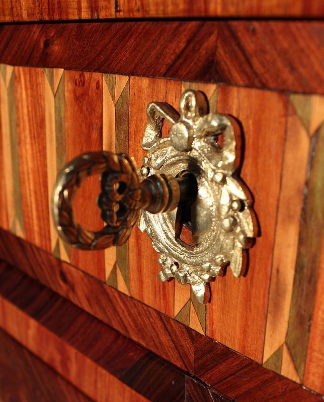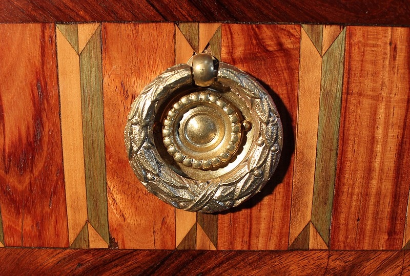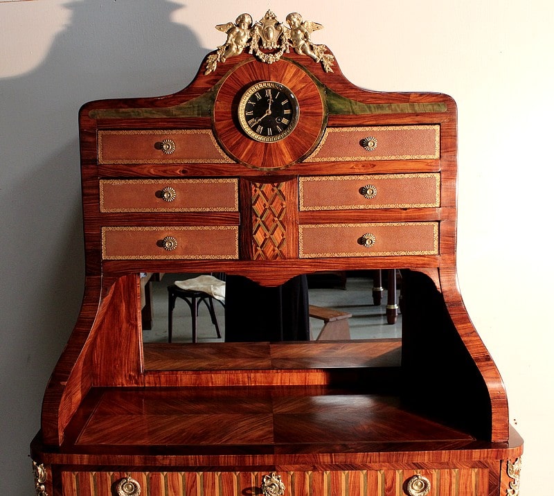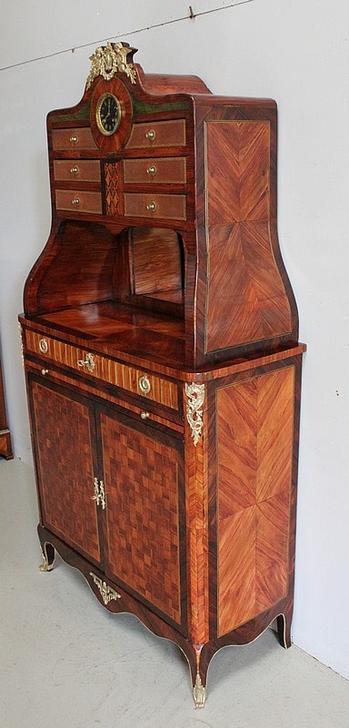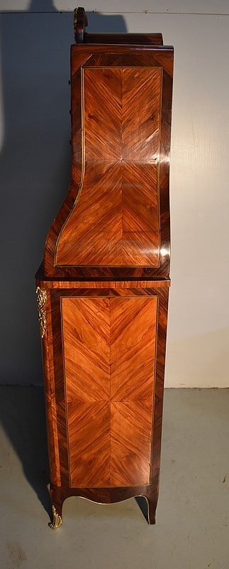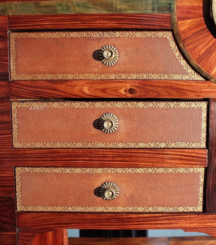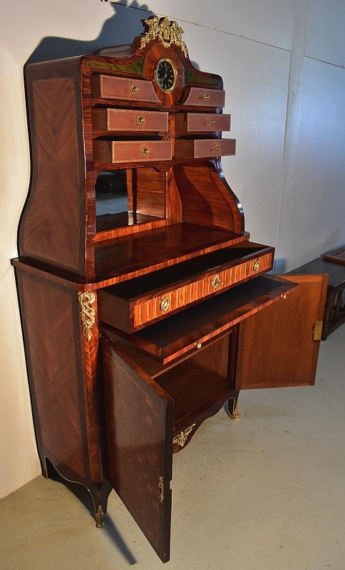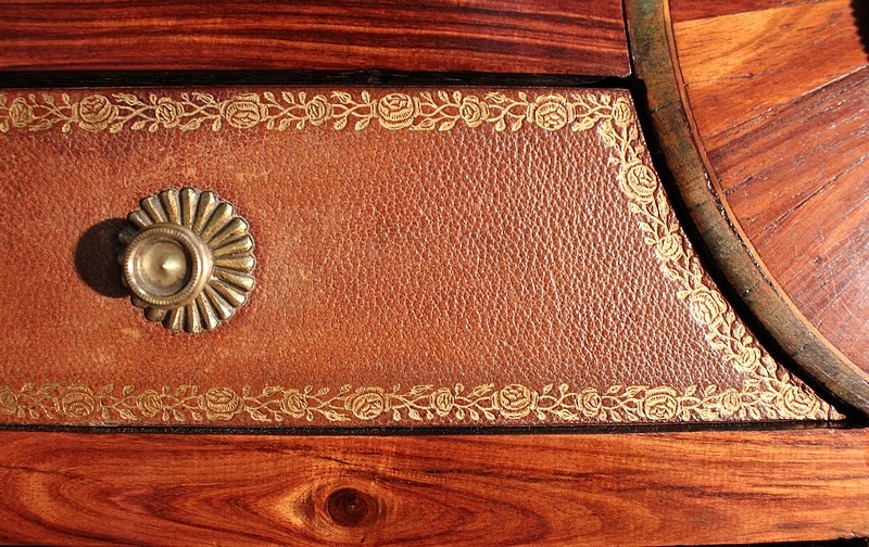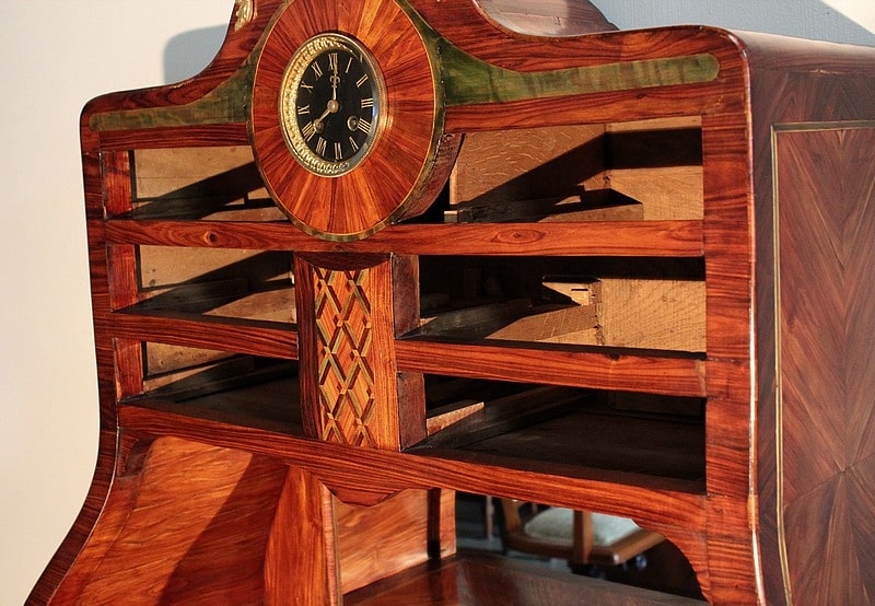 Le dessus de la partie basse de ce meuble offre une marqueterie composée de 4 rectangles encadrés d’une fine bordure. Ce 2ème corps ouvre en ceinture par un tiroir, agrémenté d’un décor marqueté rappelant celui de la partie haute. Il est orné de poignées de tirage et d’une serrure en laiton. Celle ci est en état de fonctionnement et est pourvue de sa clé. Sous ce tiroir on trouve une tablette, recouverte d’une pièce en cuir encadrée de subtils décors de fleurs. Elle s’ouvre par 2 poignées de tirage. Enfin, la dernière partie de ce 2ème corps offre 2 étagères de rangement, respectivement de 28.5 et 28 cm de hauteur et fermant par 2 portes, l’une équipée d’une serrure, l’autre d’un fermoir métallique dans le bas. Les façades de ces portes sont ornementées de marqueteries en bois de Rose représentant des damiers avec un pourtour en bois d’amarante.