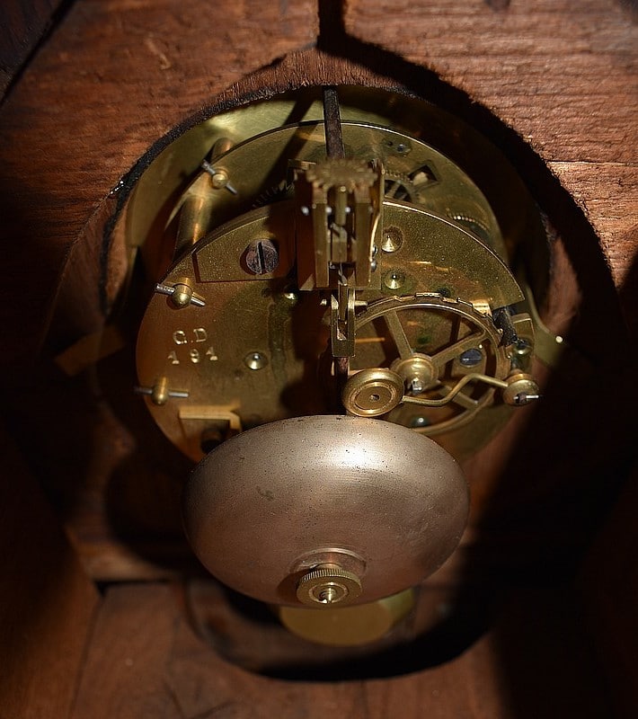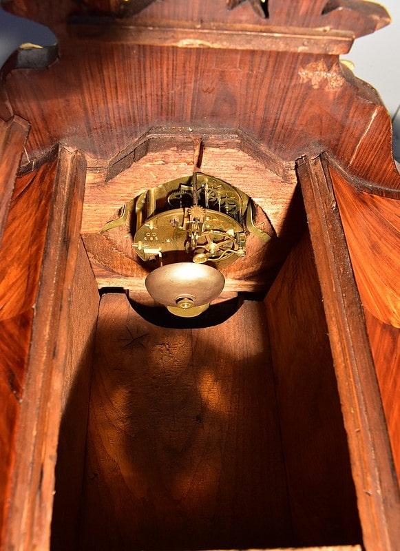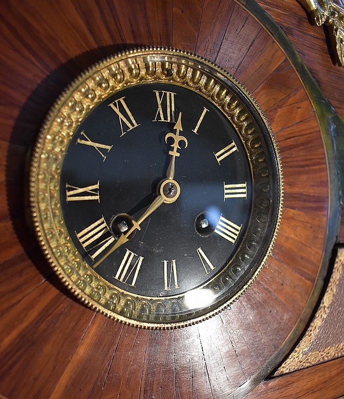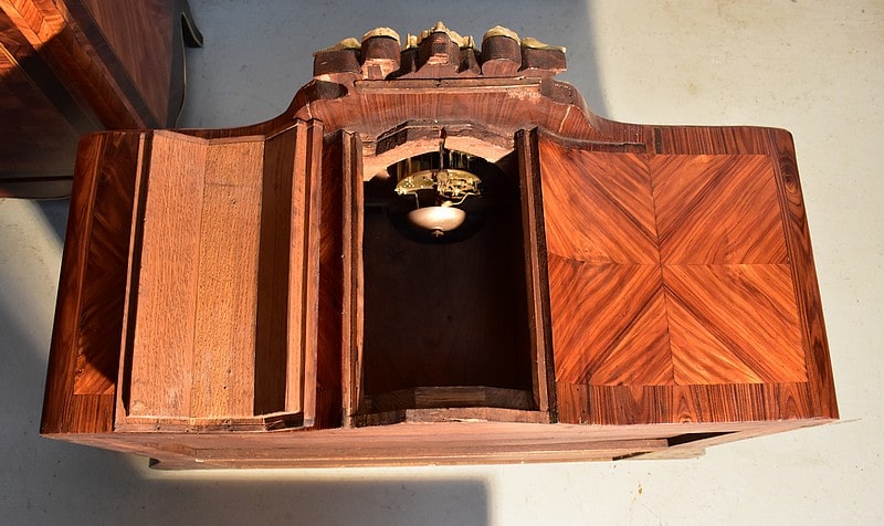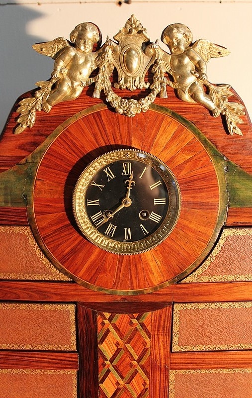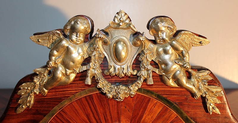 Il est orné à son sommet d’un décor en bronze représentant 2 angelots. En dessous, il est pourvu d’une horloge avec fond noir et pourtour doré, équipée de son mécanisme d’origine. Elle est entourée de part et d’autre d’une marqueterie en bois teinté vert, couleur que l’on retrouve également en dessous du cadran, dans une marqueterie à formes géométriques de tons divers. Un miroir rectangulaire, en retrait, vient compléter ce 1er corps de ce buffet.