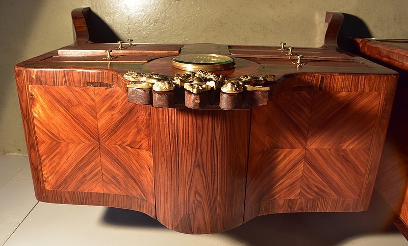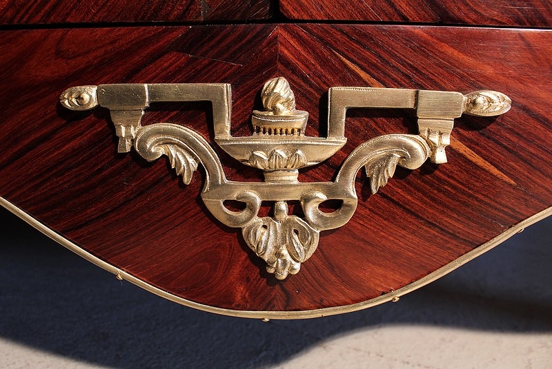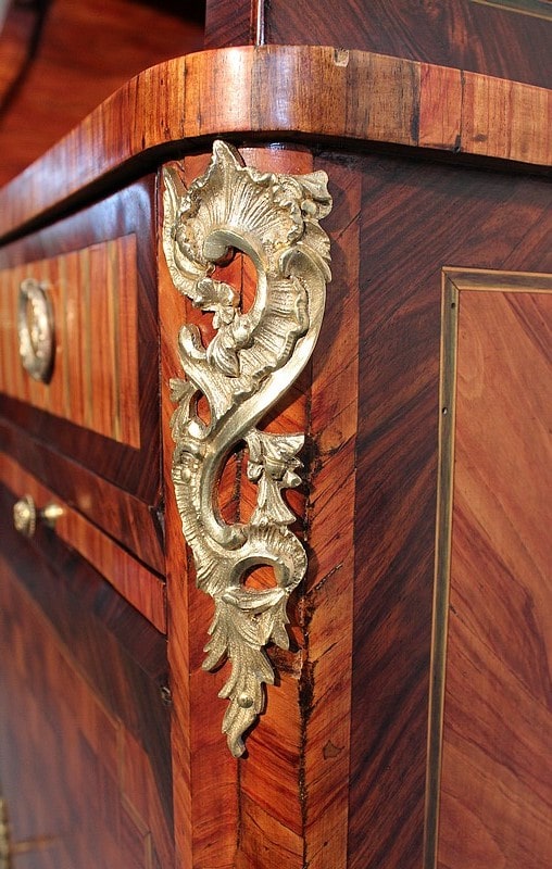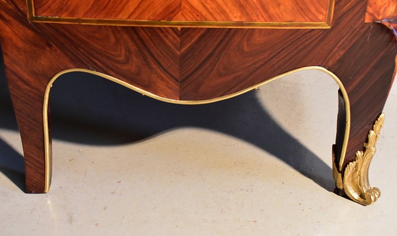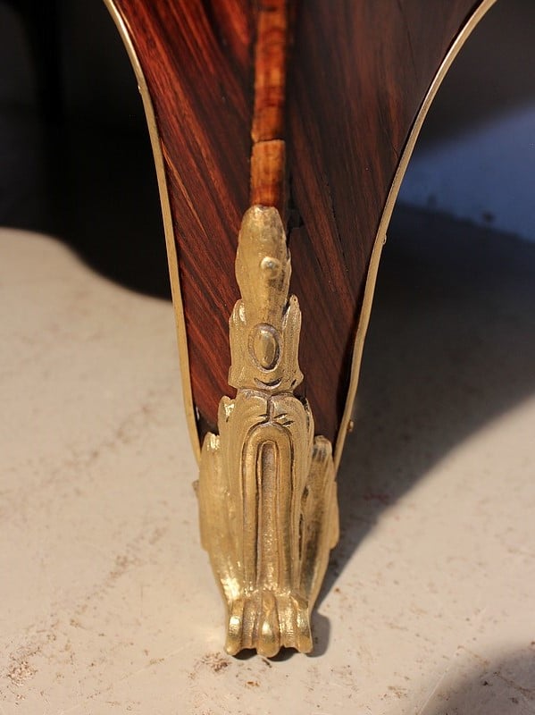 En ses côtés, des marqueteries en bois teinté viennent enjoliver ce buffet, tandis qu’en ses angles et dans le bas, ce sont des chutes en bronze. Enfin, des baguettes en laiton épousent les contours du bas du meuble et des sabots de bronze viennent ornementer ses pieds avant.
