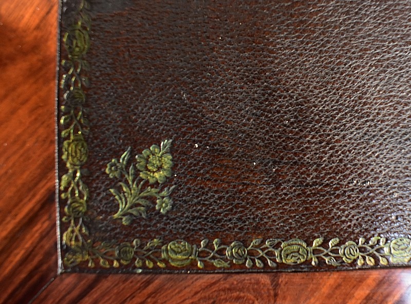 Il se compose en partie haute d’un Cartonnier, doté de 2 rangées de 3 petits tiroirs, avec boutons de tirage et façades en cuir bordées de frises dorées.