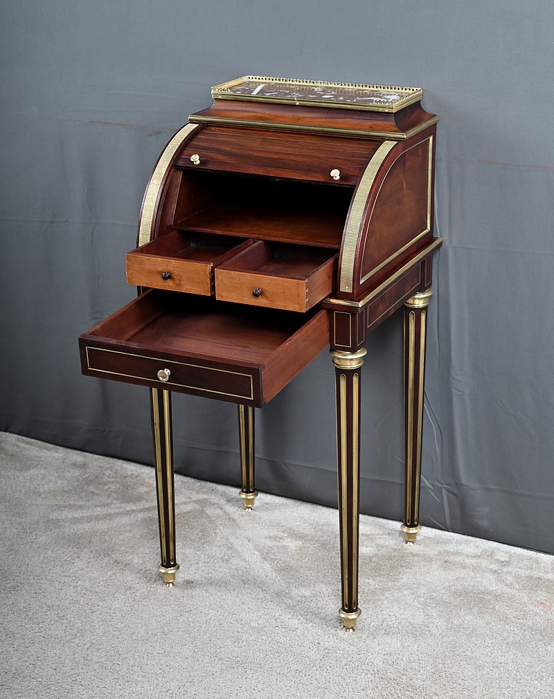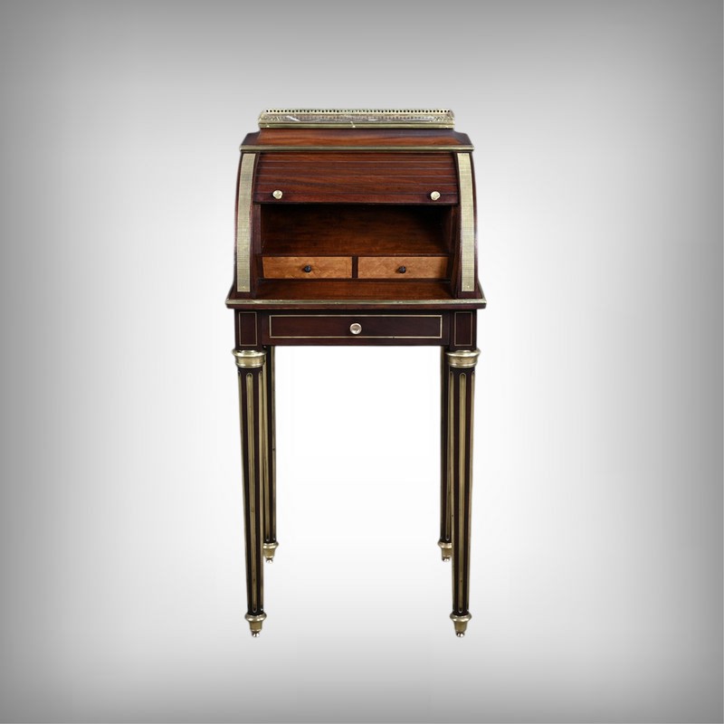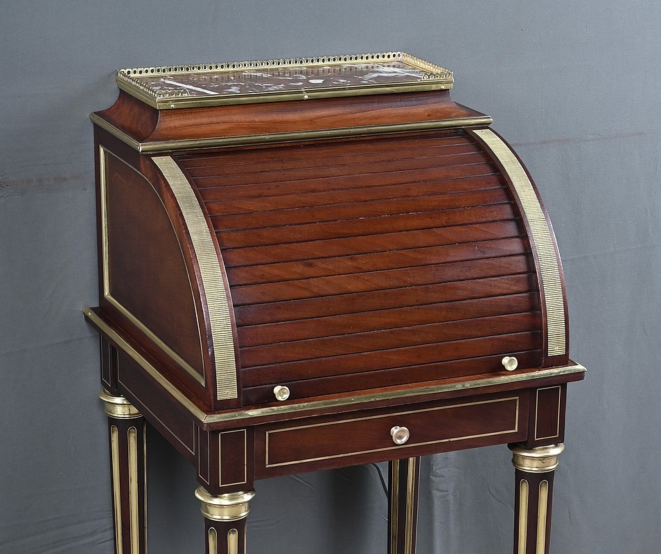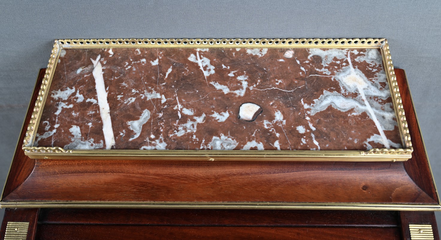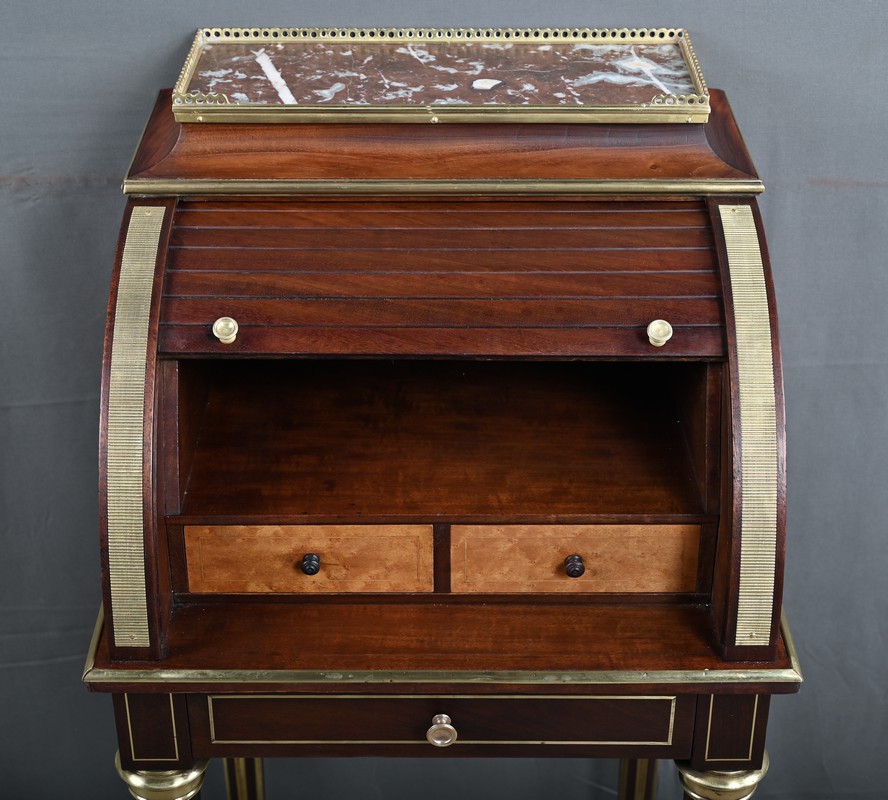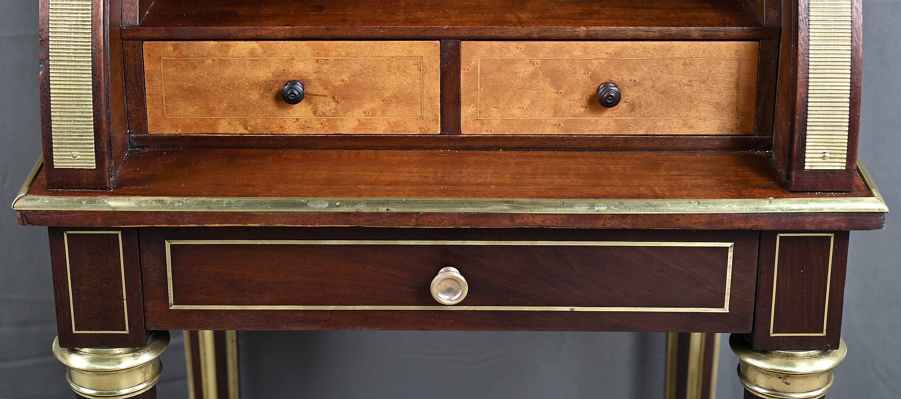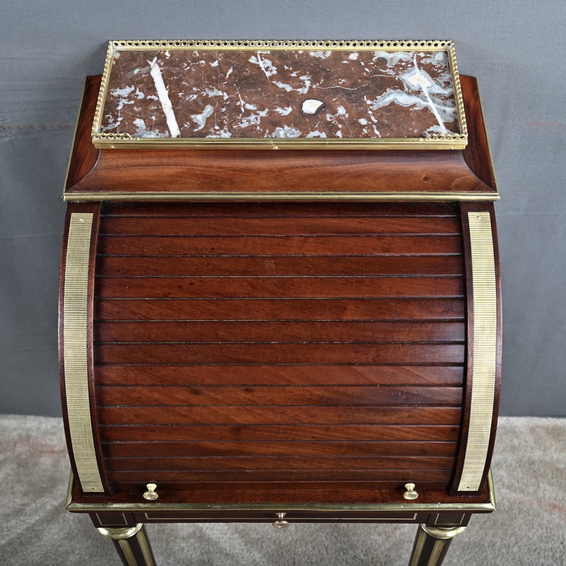 Petit Meuble de Salon en Acajou, de style Louis XVI, s’ouvrant par un rideau coulissant composé de fines lames horizontales, muni de boutons en laiton, dévoilant un espace de rangement. À l’intérieur, deux petits tiroirs symétriques à façade en érable moucheté, ornés de boutons en bois, sont surmontés d’une niche centrale. Chaque côté du cylindre est embelli d’une large applique en laiton strié, apportant une touche décorative précieuse. Le plateau en piédouche est souligné de lingotières et surmonté d’un marbre rouge du Maine, ceinturé d’une élégante galerie ajourée en laiton.