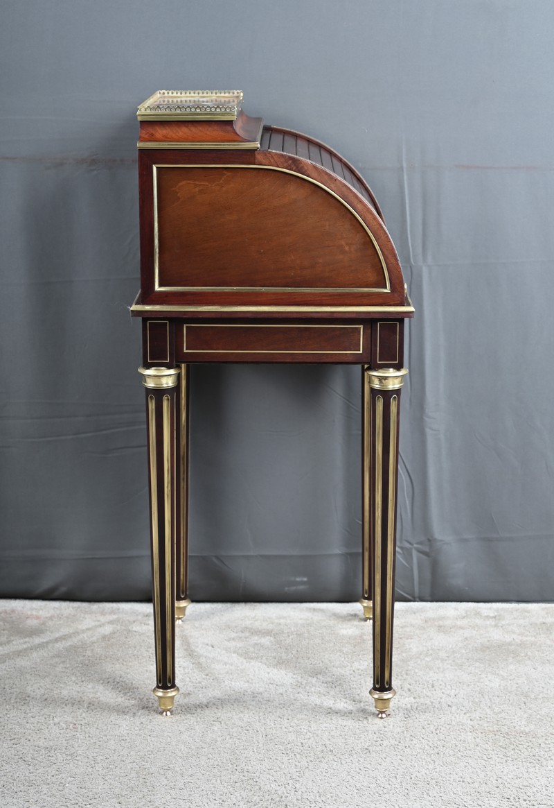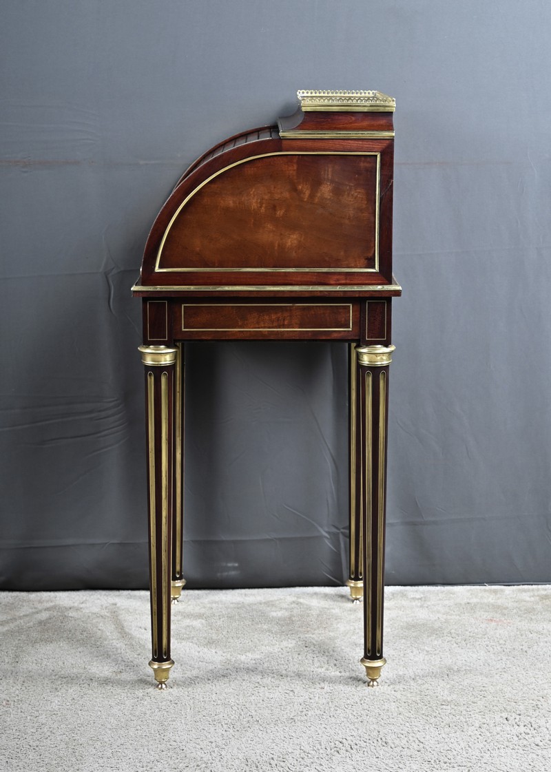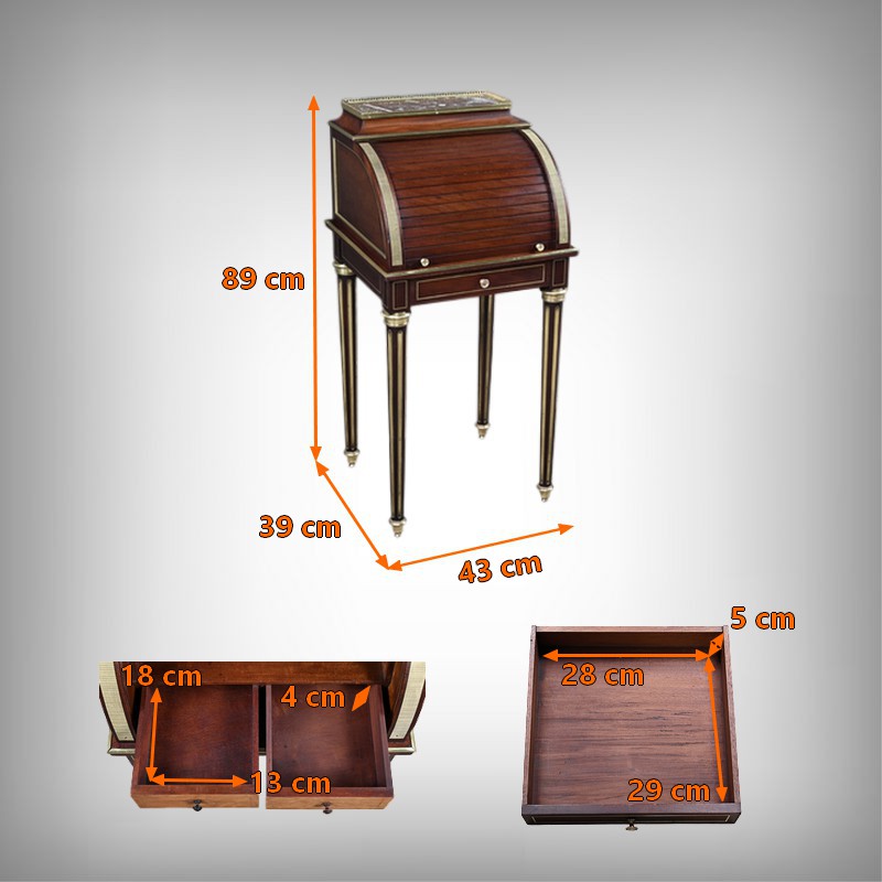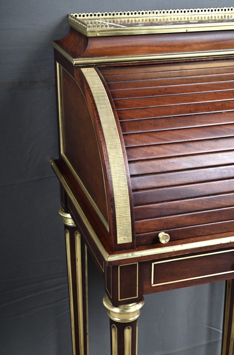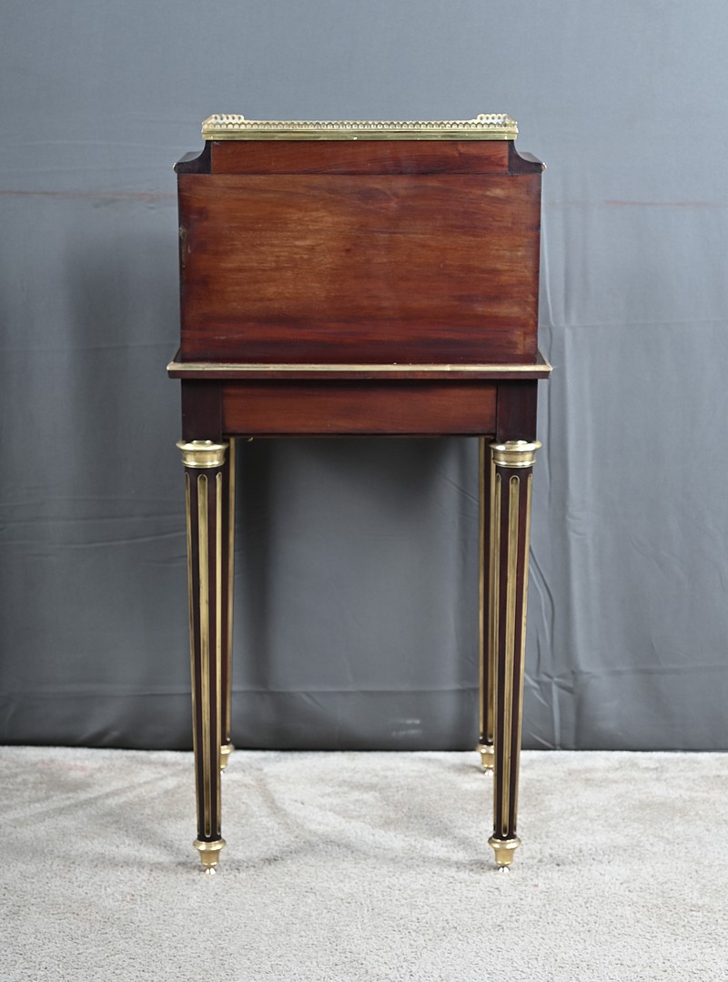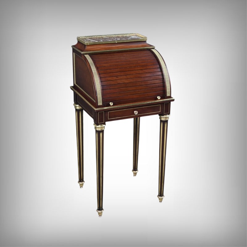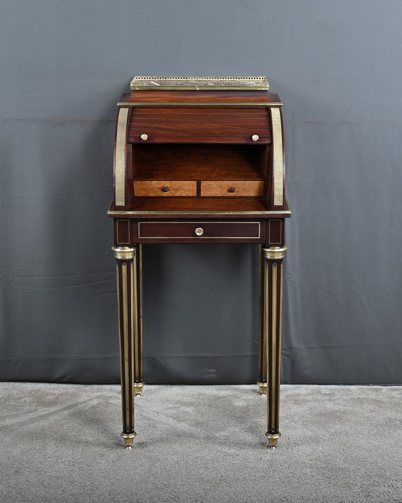 Petit Meuble de Salon en Acajou, de style Louis XVI, s’ouvrant par un rideau coulissant composé de fines lames horizontales, muni de boutons en laiton, dévoilant un espace de rangement. À l’intérieur, deux petits tiroirs symétriques à façade en érable moucheté, ornés de boutons en bois, sont surmontés d’une niche centrale. Chaque côté du cylindre est embelli d’une large applique en laiton strié, apportant une touche décorative précieuse. Le plateau en piédouche est souligné de lingotières et surmonté d’un marbre rouge du Maine, ceinturé d’une élégante galerie ajourée en laiton.
