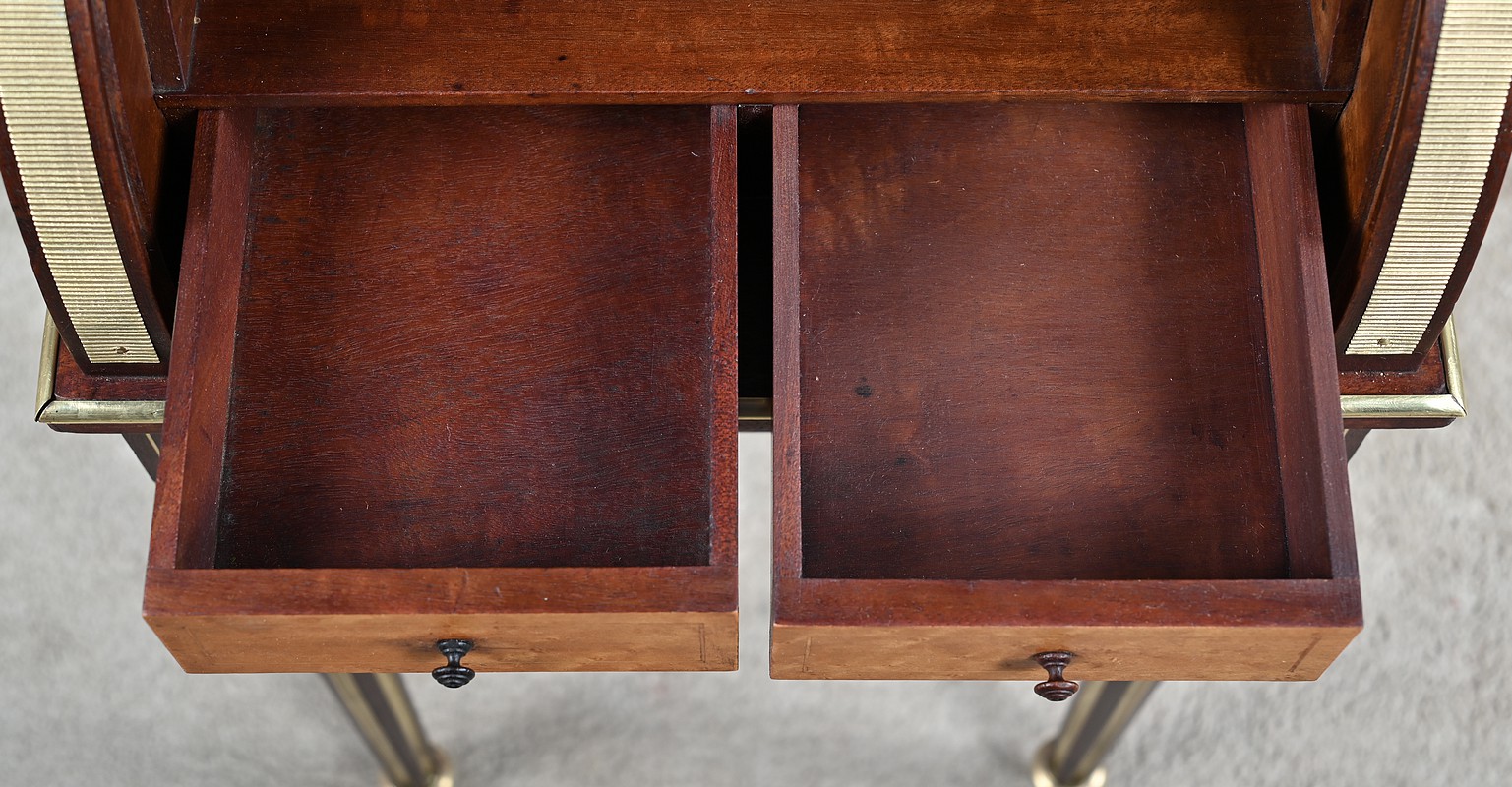 Ce meuble comprend également un tiroir dont la façade est rehaussée d’un filet de laiton et d’un bouton de tirage assorti. Il repose sur quatre pieds fuselés à cannelures laitonnées, agrémentés d’une large collerette en partie supérieure et terminés par des sabots en laiton.