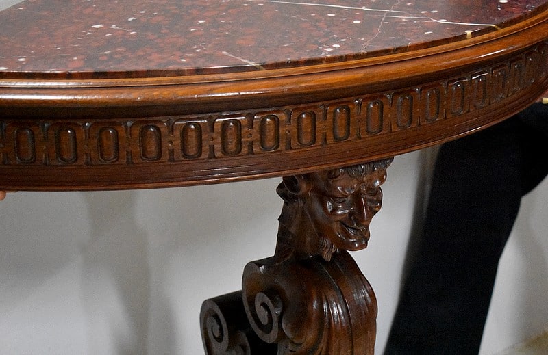 Elle repose sur un seul et unique pied à décor de tête de faune orné de rinceaux et de volutes sculptés terminé en patte de lion sur un socle carré et mouluré.