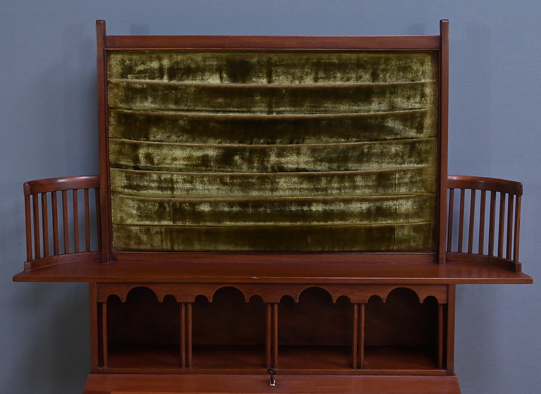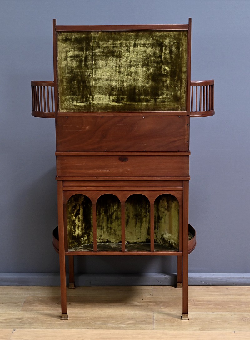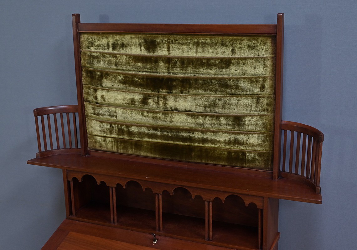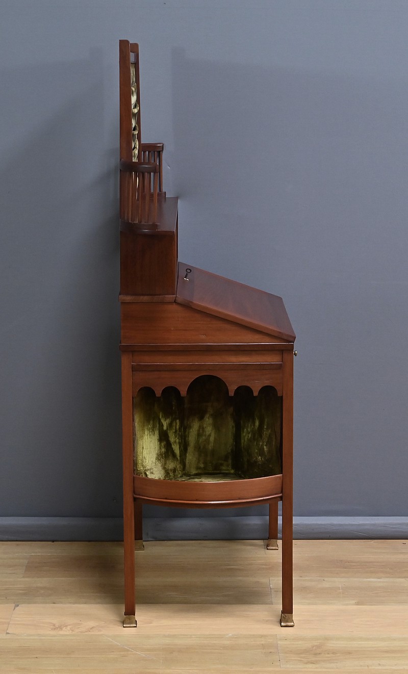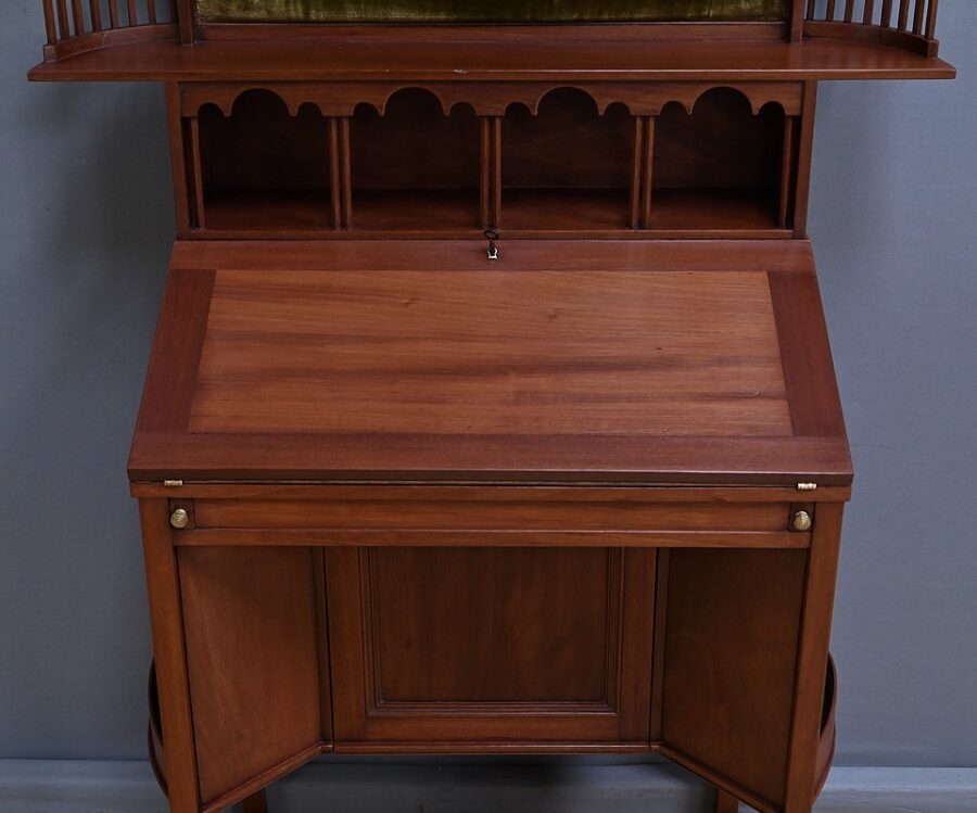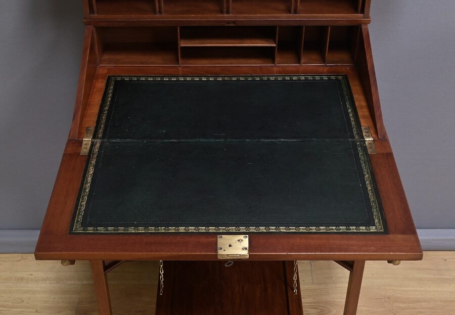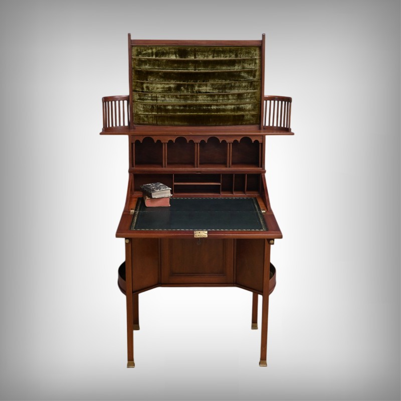 Ce Bonheur du jour anglo-indien en acajou et placage d’acajou est une pièce rare conçue avec un savoir-faire d’exception par la prestigieuse manufacture C. Lazarus & Cie de Calcutta. Ce meuble raffiné et fonctionnel dévoile en partie supérieure un range-courrier habillé d’un somptueux velours satiné vert. Juste en dessous, quatre niches en arcature allient finesse architecturale et praticité. La partie secrétaire de ce mobilier est dotée d’un abattant garni d’un cuir noir à vignette dorée. Elle révèle six compartiments de rangement, parfaits pour organiser documents et accessoires avec distinction. La partie inférieure s’ouvre par un vantail retenu par des chaînettes. Les côtés et le dos du meuble sont sublimés par de grandes niches tapissées de velours satiné. Enfin, ce petit mobilier repose sur des pieds de section carré à sabots de bronze. Ce bonheur du jour est un meuble d’exception tant par sa rareté que par la qualité se sa fabrication.