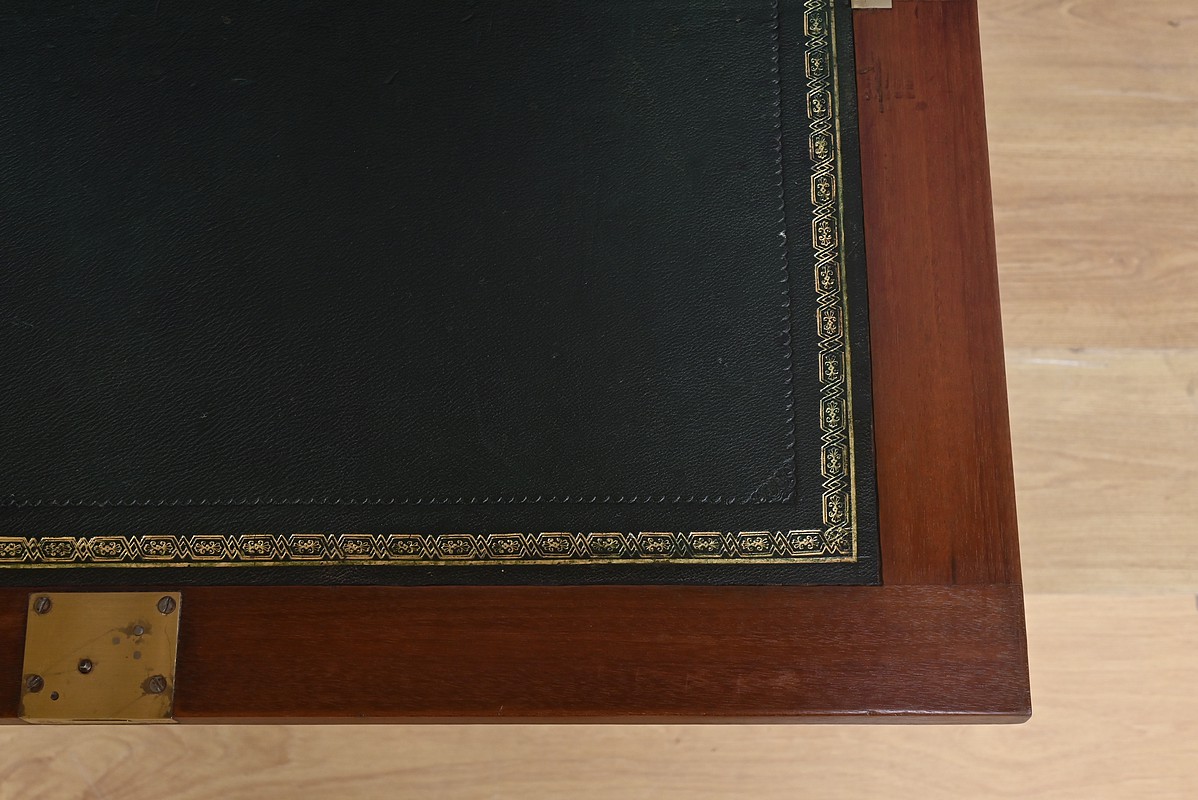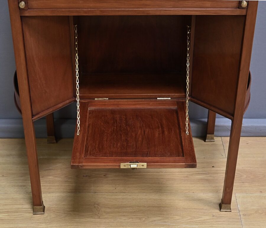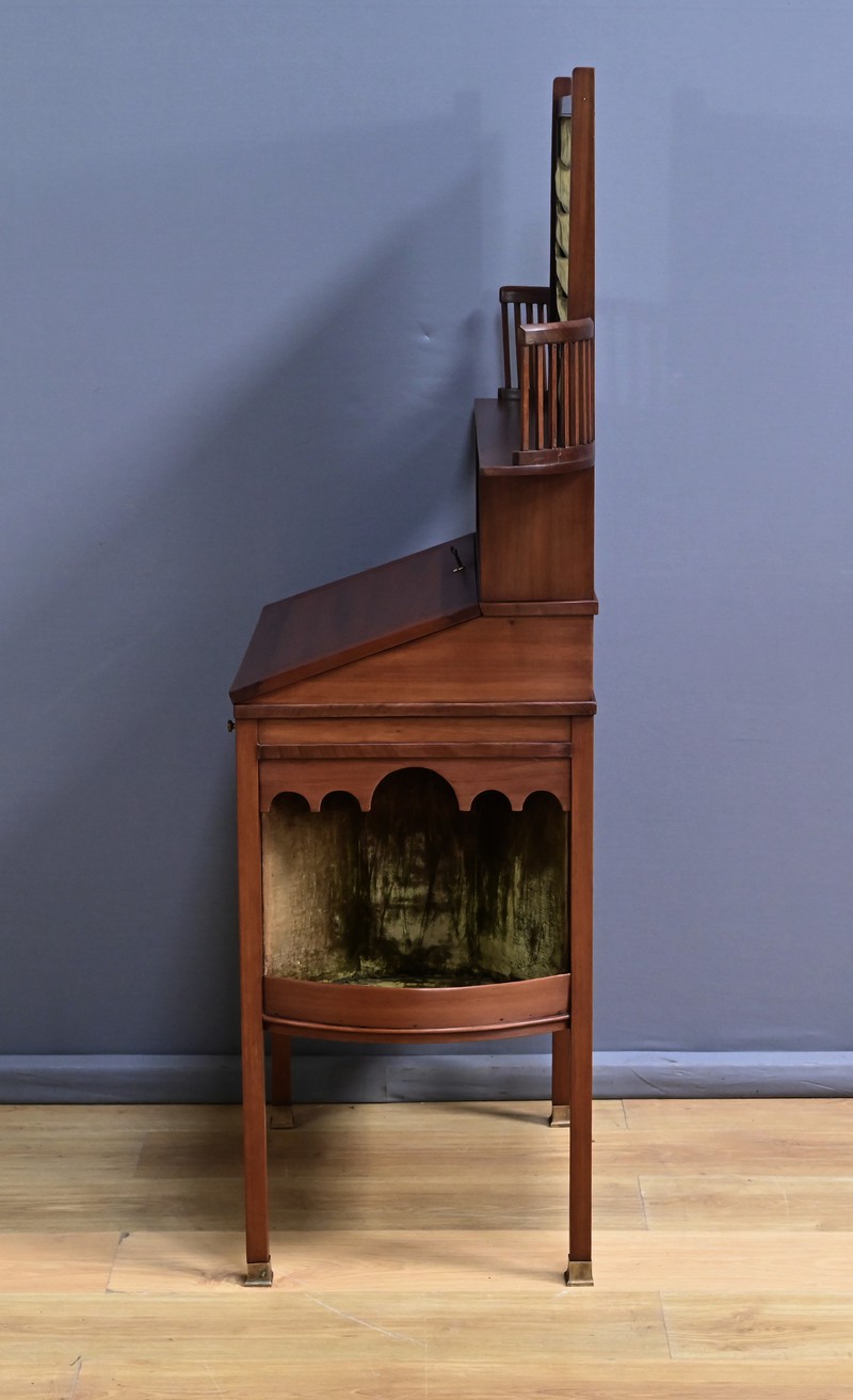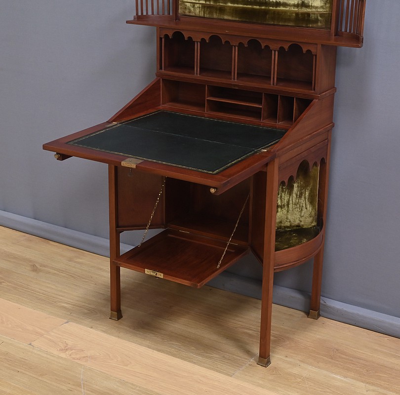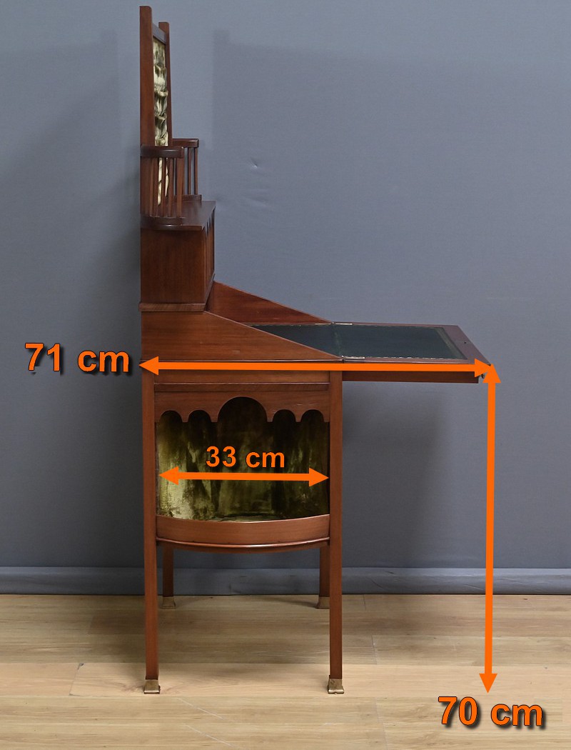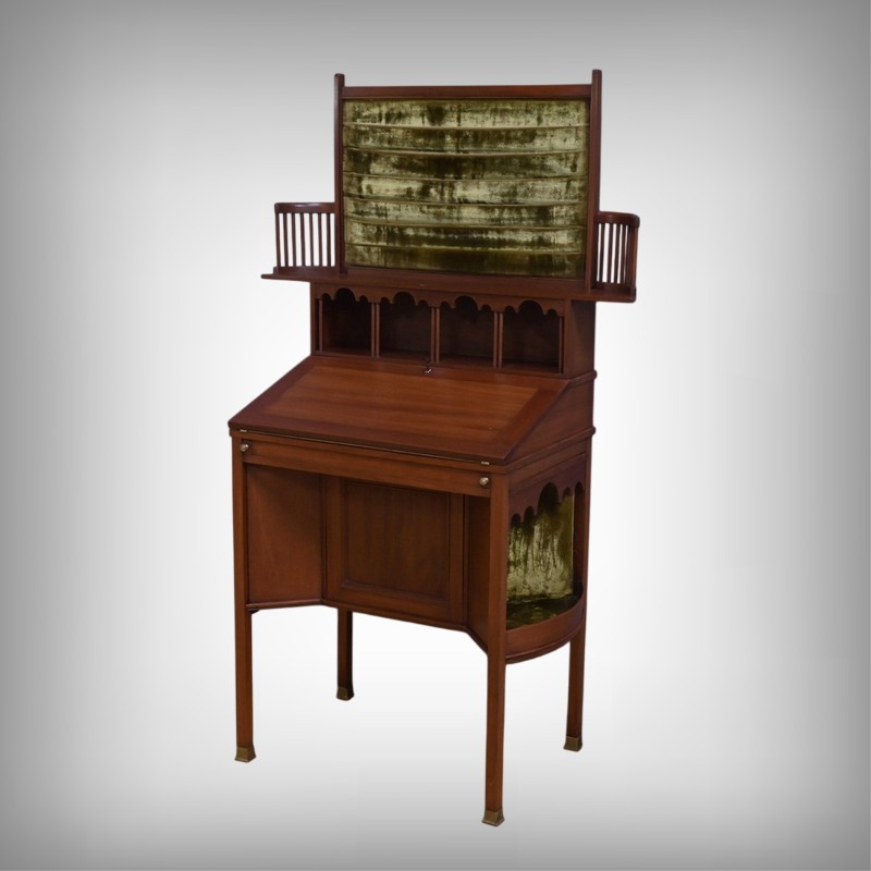 Ce Bonheur du jour anglo-indien en acajou et placage d’acajou est une pièce rare conçue avec un savoir-faire d’exception par la prestigieuse manufacture C. Lazarus & Cie de Calcutta. Ce meuble raffiné et fonctionnel dévoile en partie supérieure un range-courrier habillé d’un somptueux velours satiné vert. Juste en dessous, quatre niches en arcature allient finesse architecturale et praticité. La partie secrétaire de ce mobilier est dotée d’un abattant garni d’un cuir noir à vignette dorée. Elle révèle six compartiments de rangement, parfaits pour organiser documents et accessoires avec distinction. La partie inférieure s’ouvre par un vantail retenu par des chaînettes. Les côtés et le dos du meuble sont sublimés par de grandes niches tapissées de velours satiné. Enfin, ce petit mobilier repose sur des pieds de section carré à sabots de bronze. Ce bonheur du jour est un meuble d’exception tant par sa rareté que par la qualité se sa fabrication.