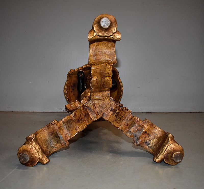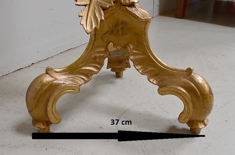 Il supporte sur sa tête un plateau au dessus noir bordé de dorures et repose sur une base tripode feuillagée.