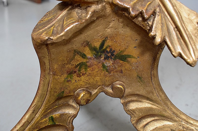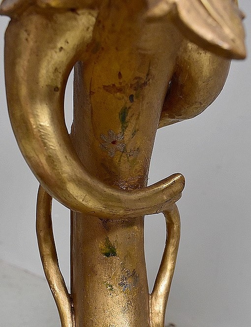 On distingue sur sa partie basse, presque dissimulés sous la peinture dorée, des motifs de fleurs colorés.