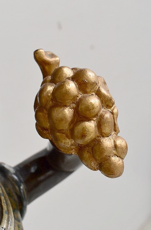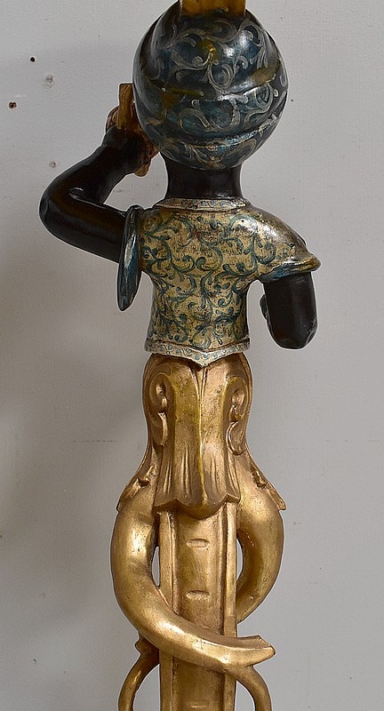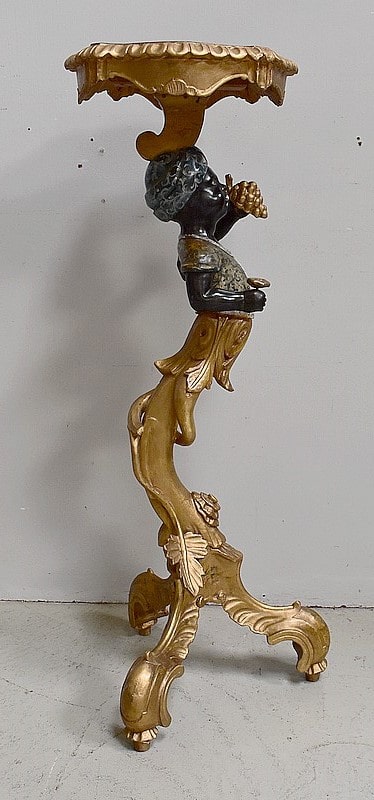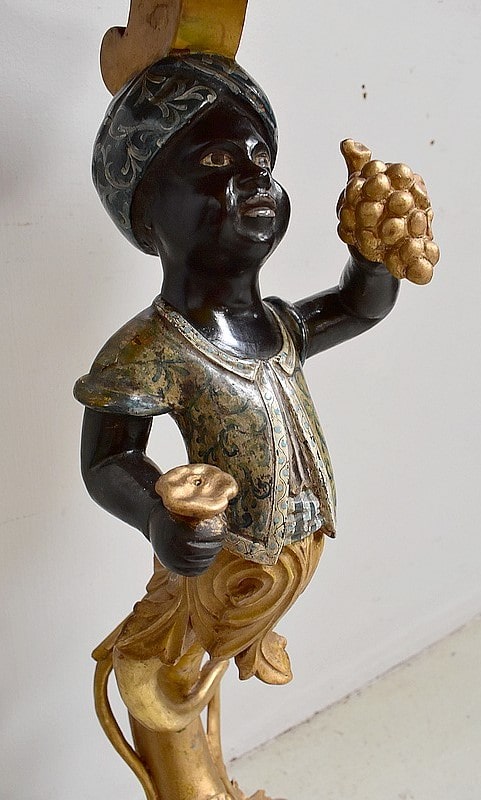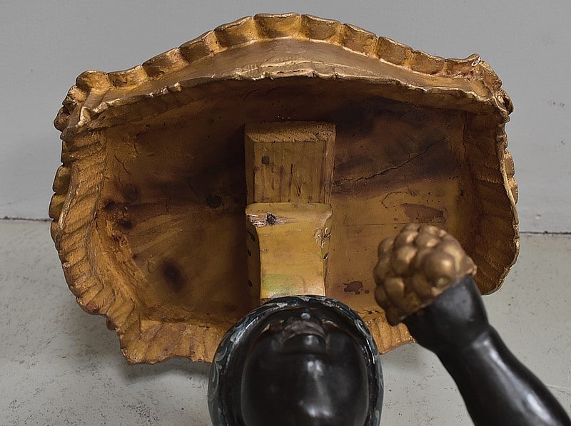 Sellette insolite en bois sculpté et peint, représentant un Maure vêtu d’une chemise imprimée et coiffé d’un turban. Il présente dans sa main gauche une grappe de raisin et tient une fleur dans celle de droite.