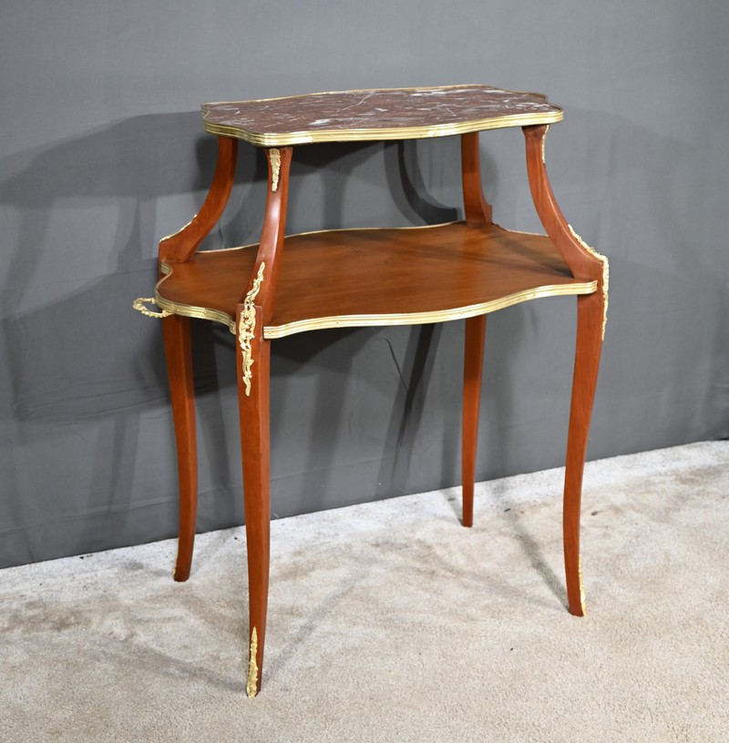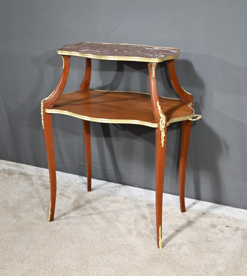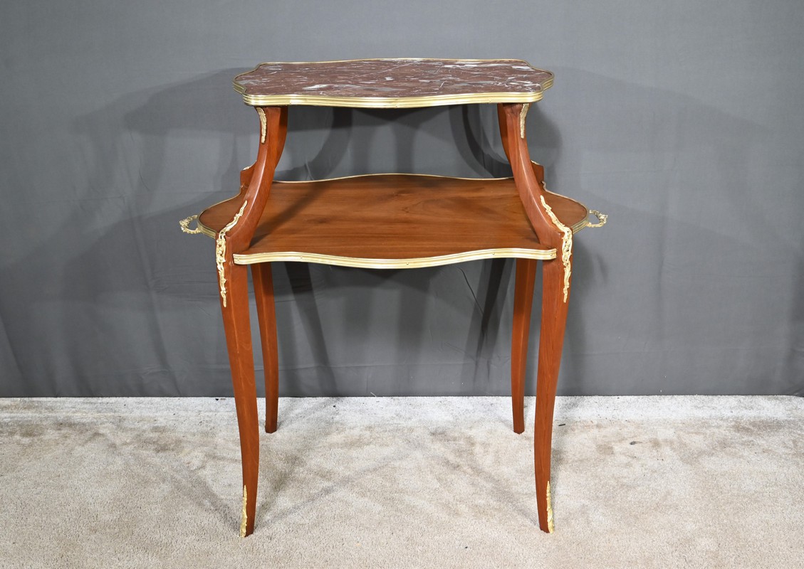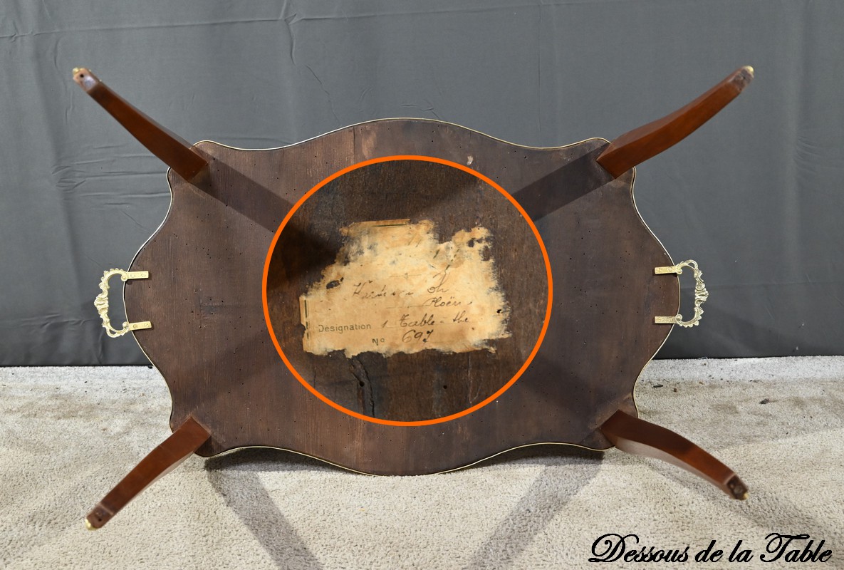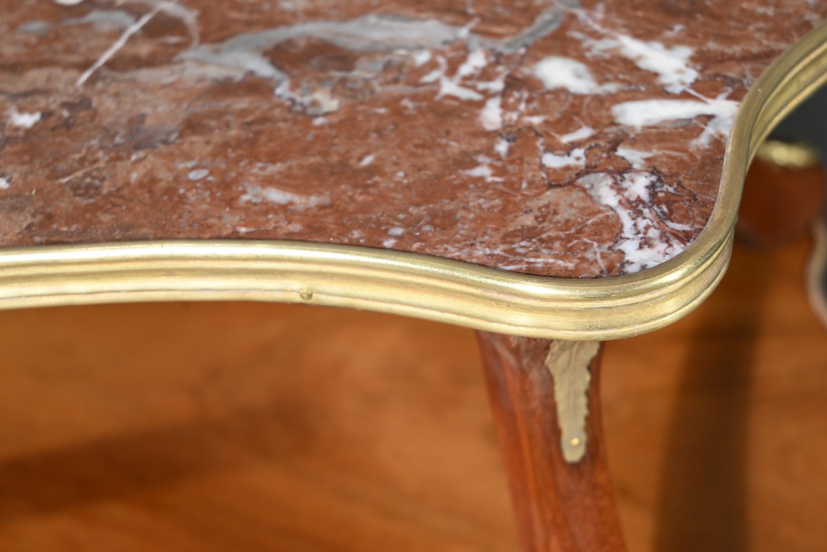 Cette table à thé en Acajou blond présente un plateau supérieur mouvementé à rétrécissement flanqué d’un marbre rouge griotte des Pyrénées et ceint au chant d’une large baguette en laiton appelée lingotière.