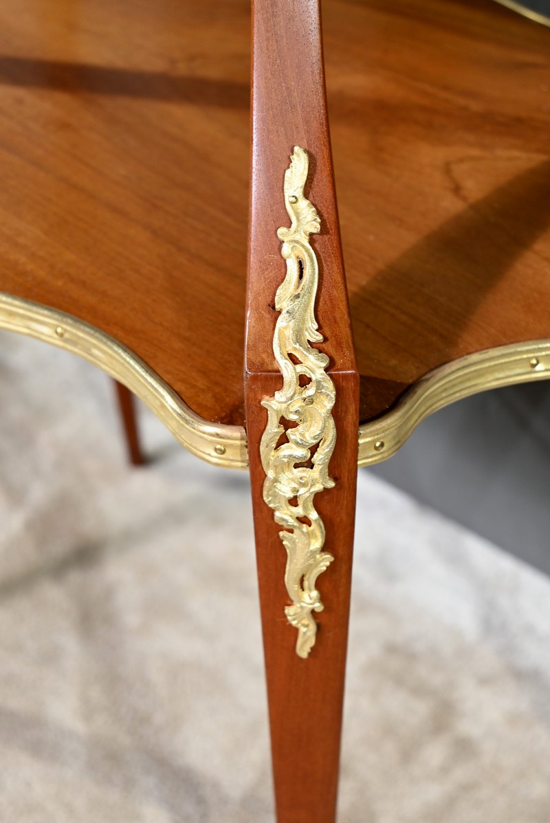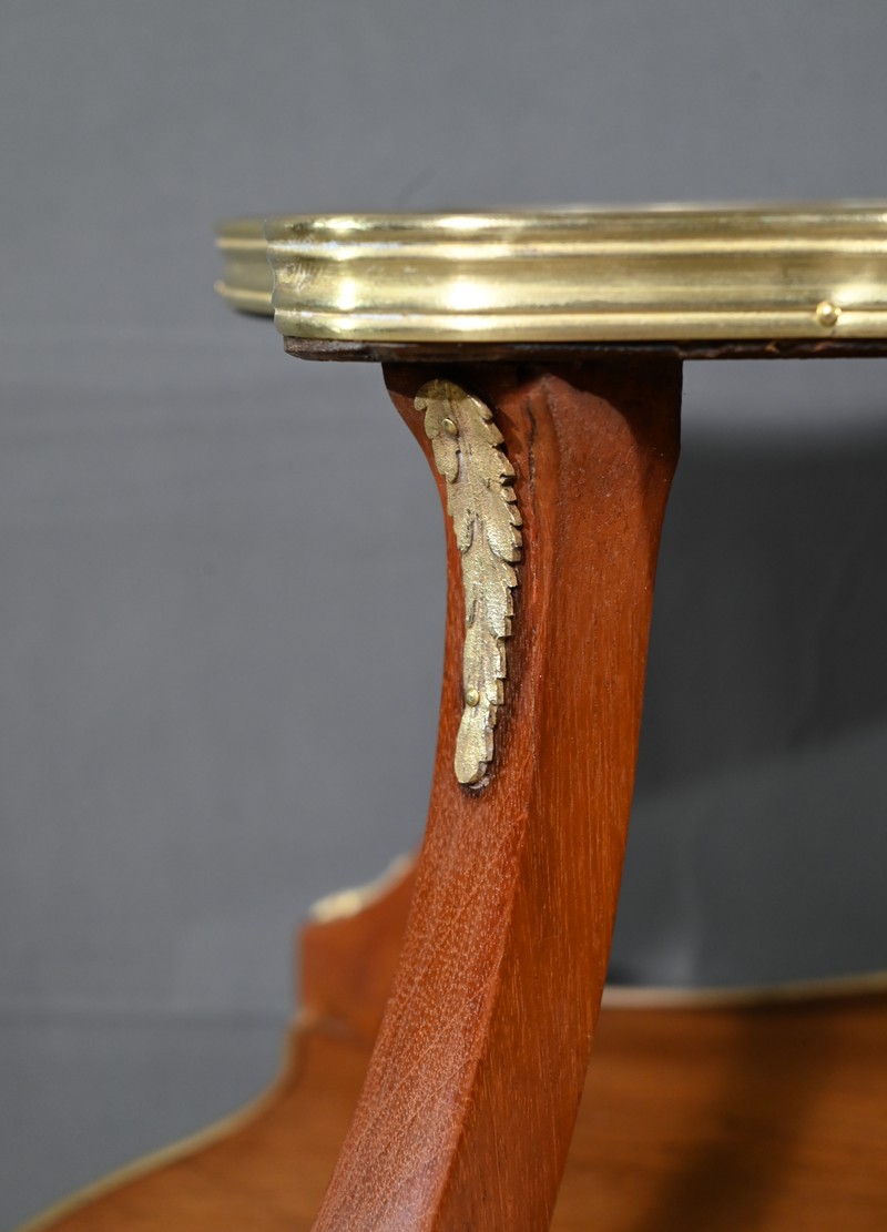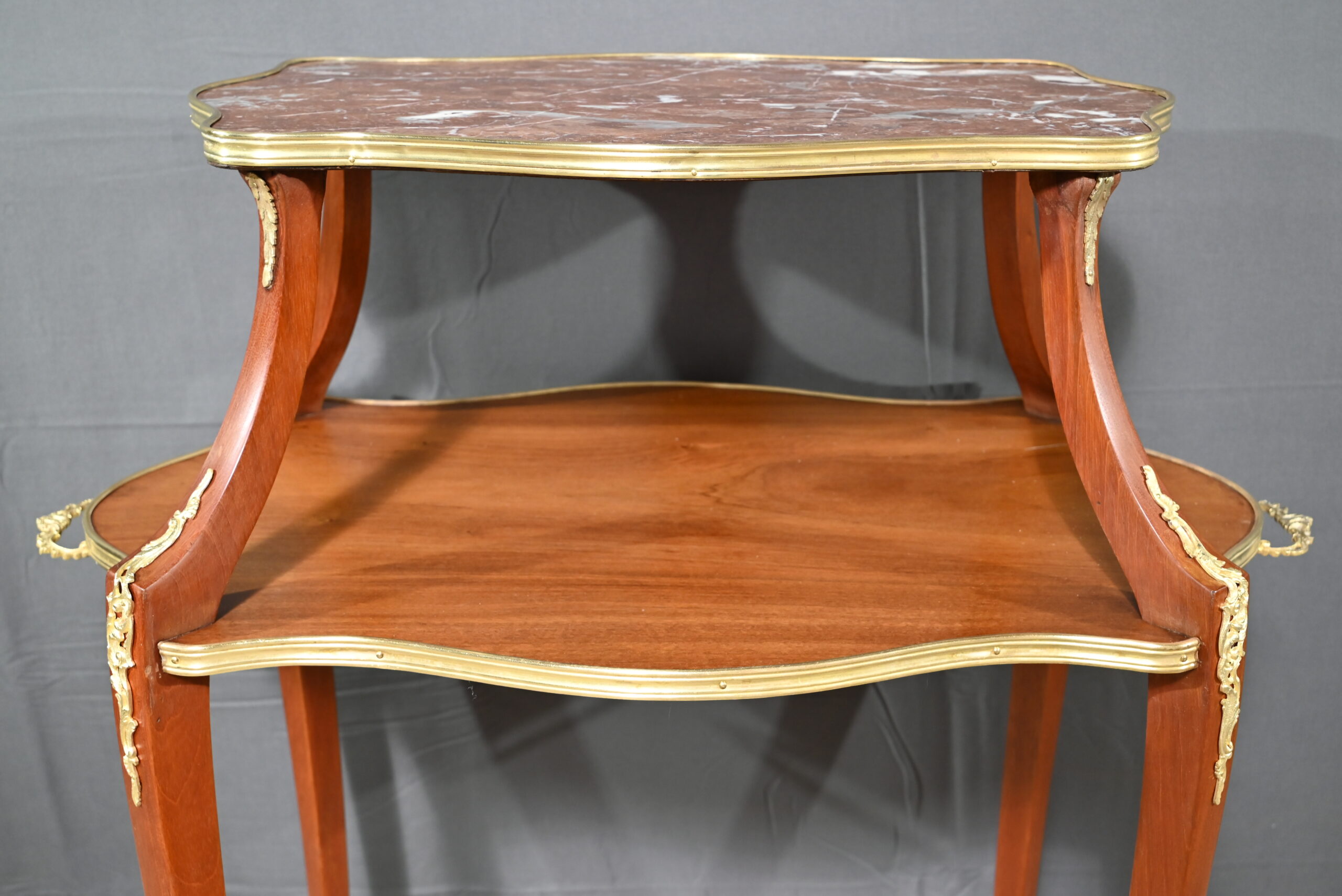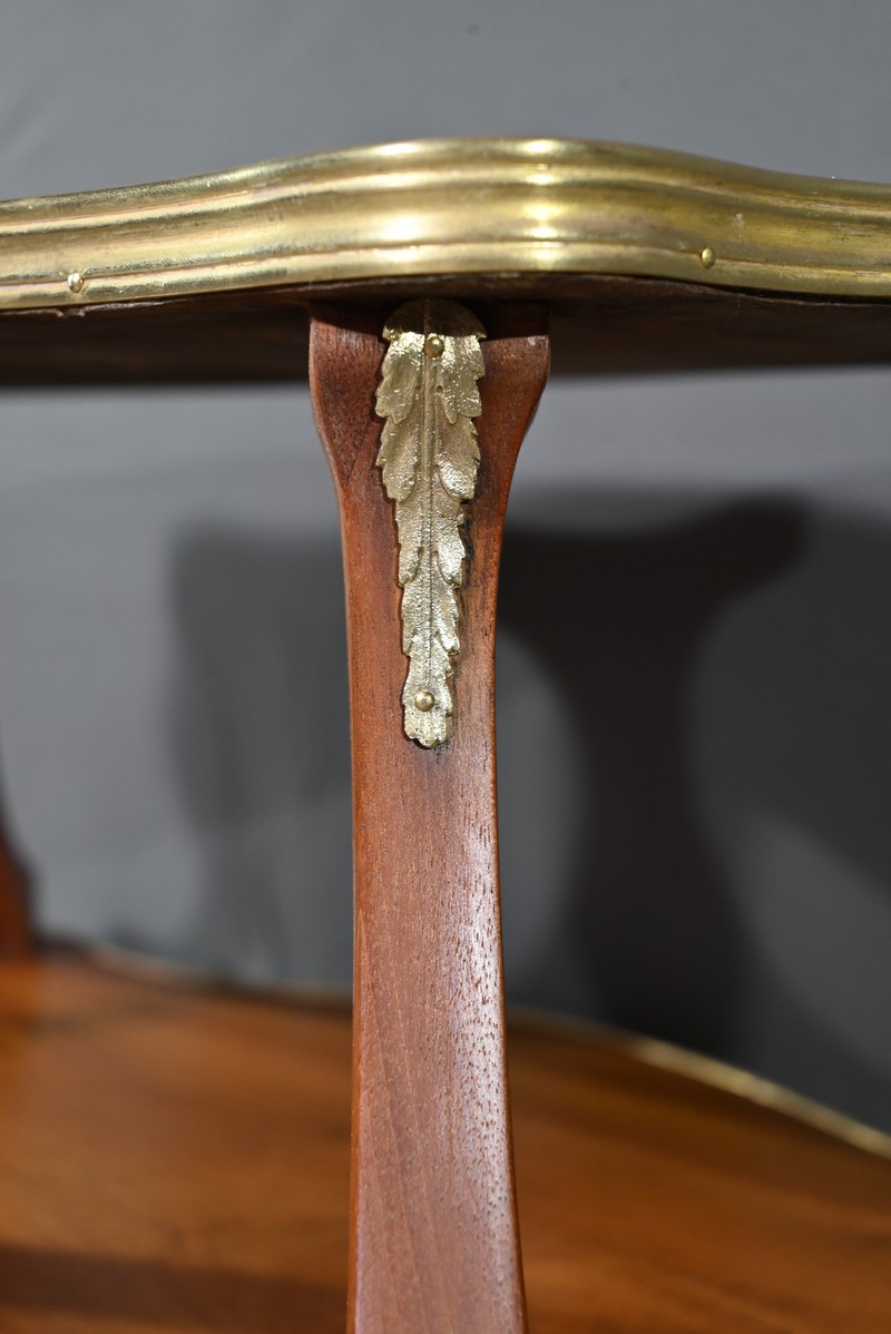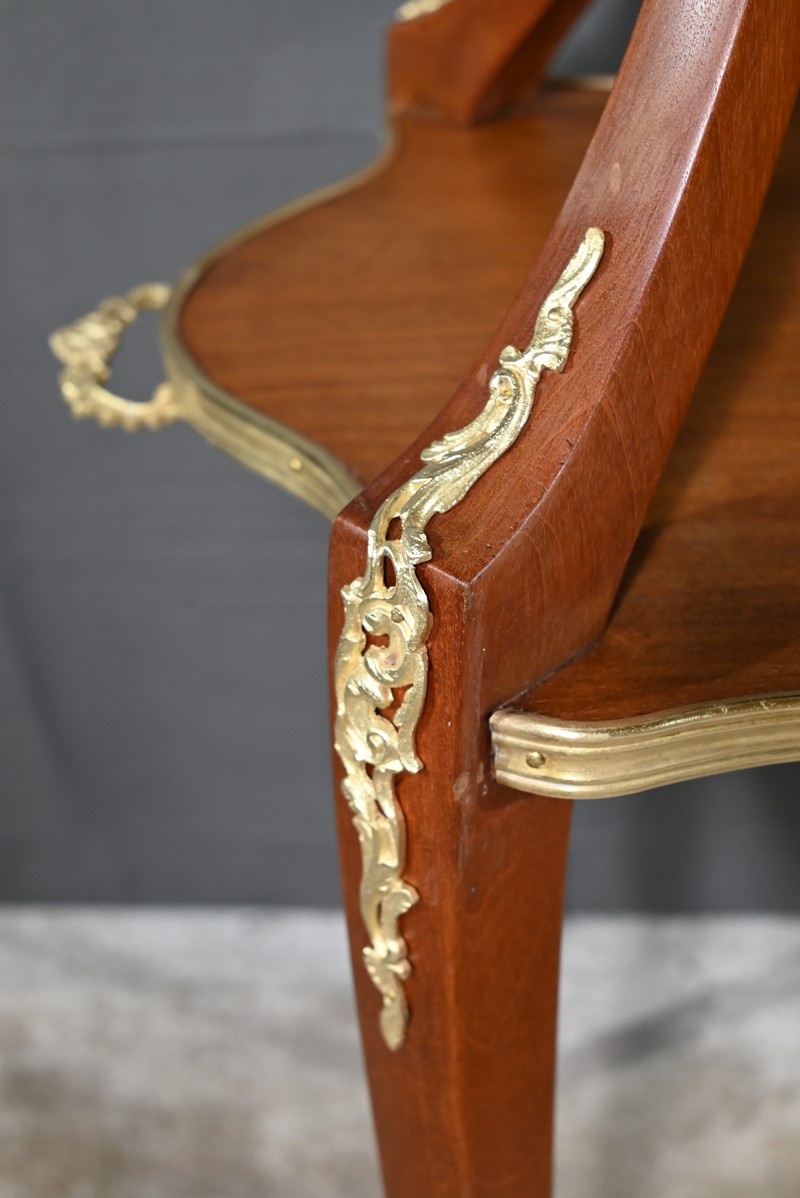 Le plateau inférieur plus grand, en bois, est agrémenté des mêmes attributs et munis de poignées à décors de feuille d’acanthe et de rinceaux.