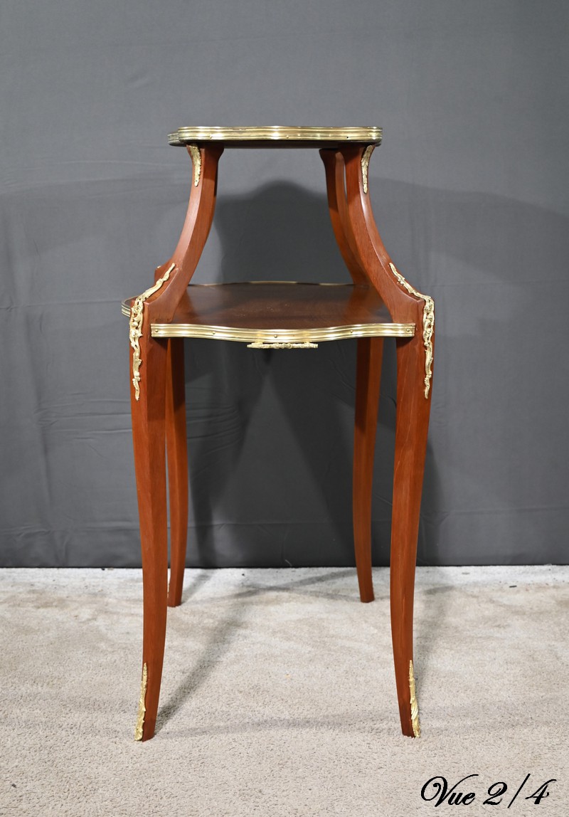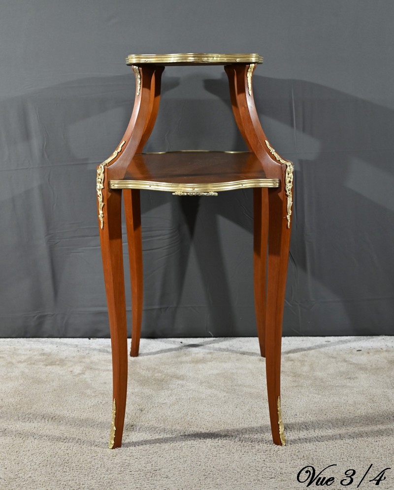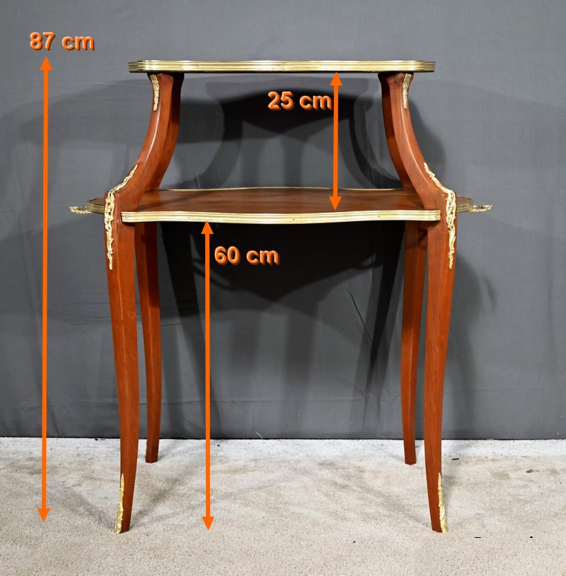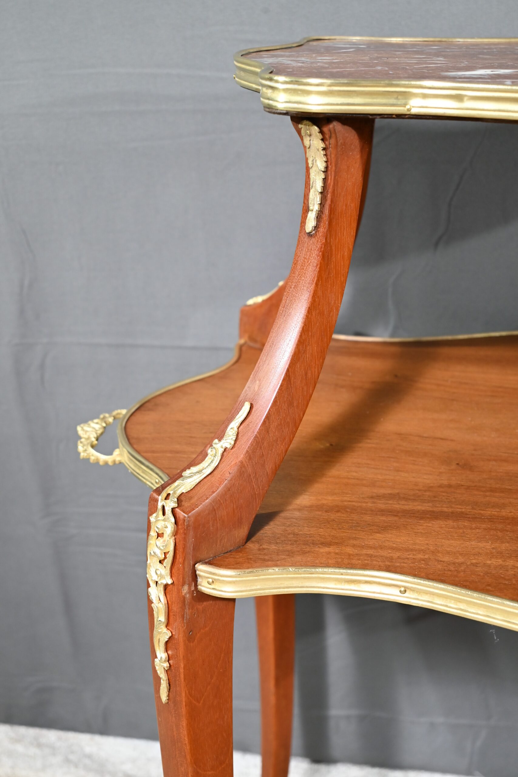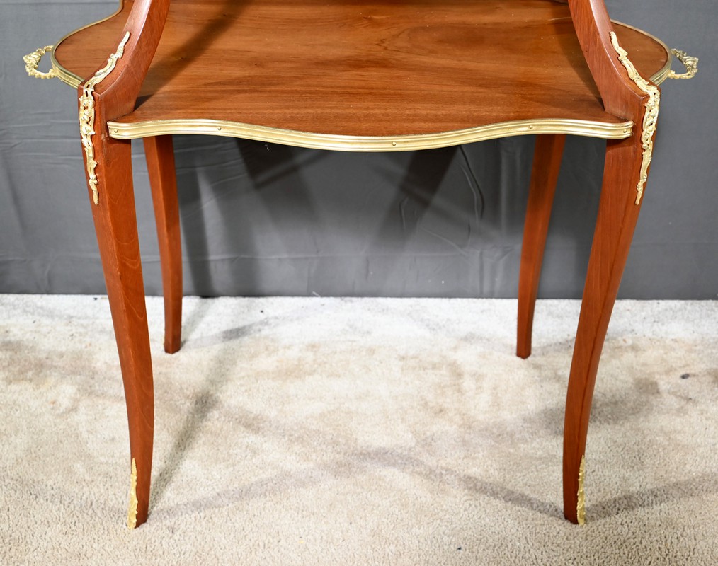 Le plateau inférieur plus grand, en bois, est agrémenté des mêmes attributs et munis de poignées à décors de feuille d’acanthe et de rinceaux.