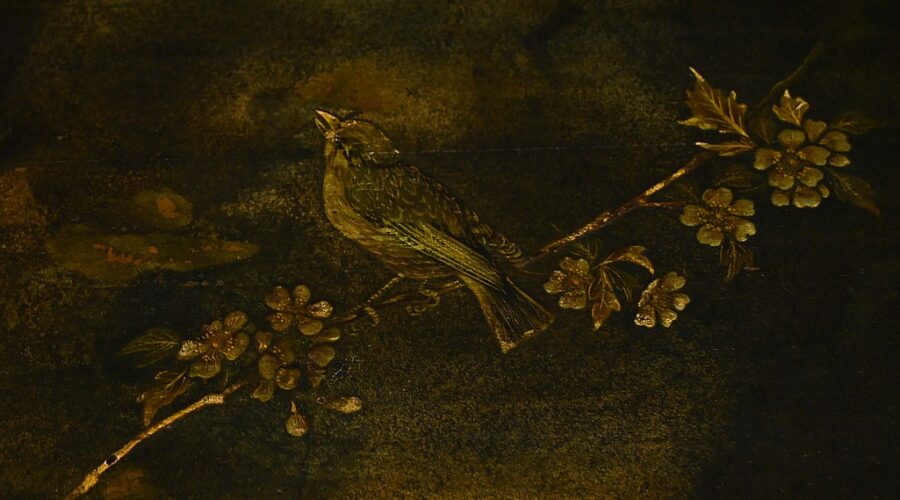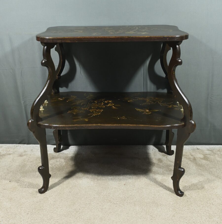 Table d’appoint dotée de deux plateaux mouvementés à décors japonisant en relief d’oiseaux de fleurs et de feuillage. Le grand plateau inférieur est muni de poignées en bronze ciselé. Le piétement en bois laqué est agrémenté d’arabesques dorées suivant les courbes et volutes formant les pieds. Cette table à thé est un pièce raffinée portant les signes de l’âge, parfaite pour une décoration élégante.