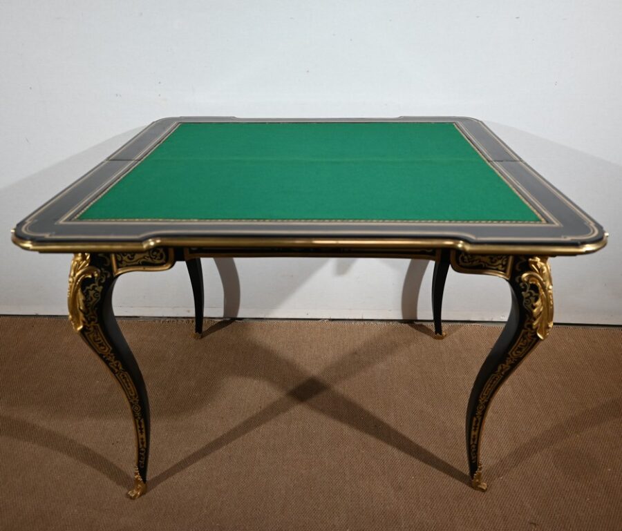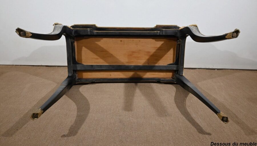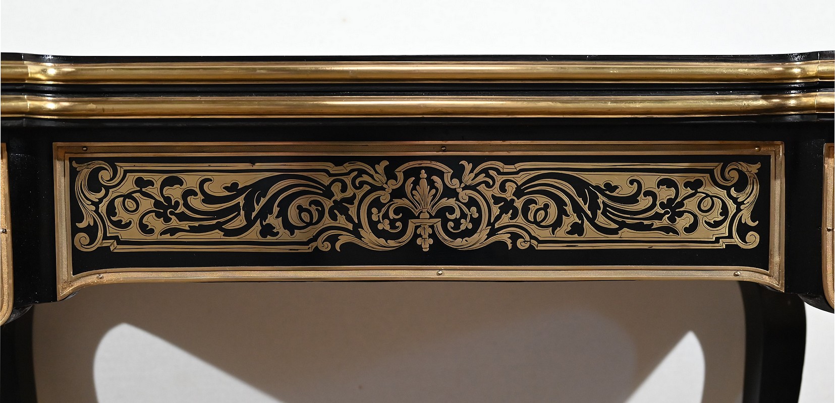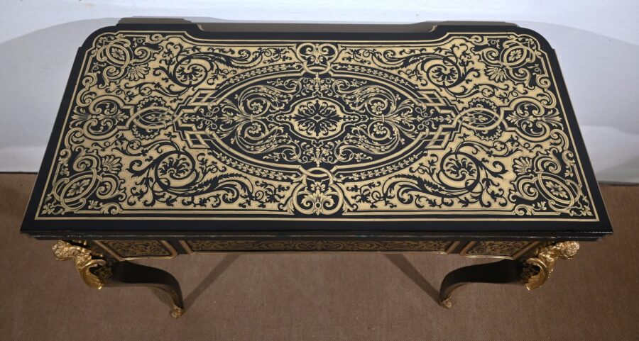 Son dessus portefeuille arbore en son centre un décor marqueté de volutes, de rinceaux, de feuillage et de fleurs en laiton finement ciselé. Ce double plateau est bordé d’une moulure en façade et sur les côtés.