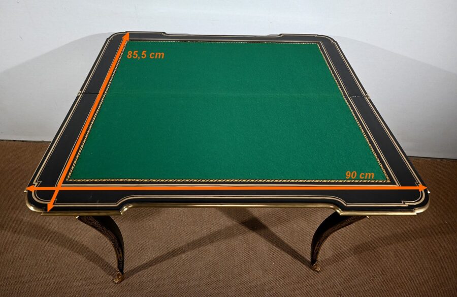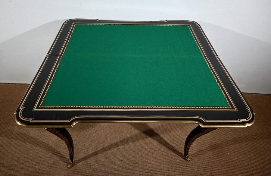Ouvert, ce dernier présente un encadrement à décrochement à l’avant et à l’arrière, des côtés droits et des angles à ressaut légèrement arrondis. Le centre est foncé d’une feutrine verte, entourée d’un galon à motifs dorés.