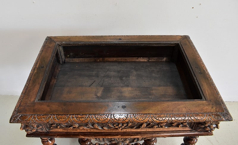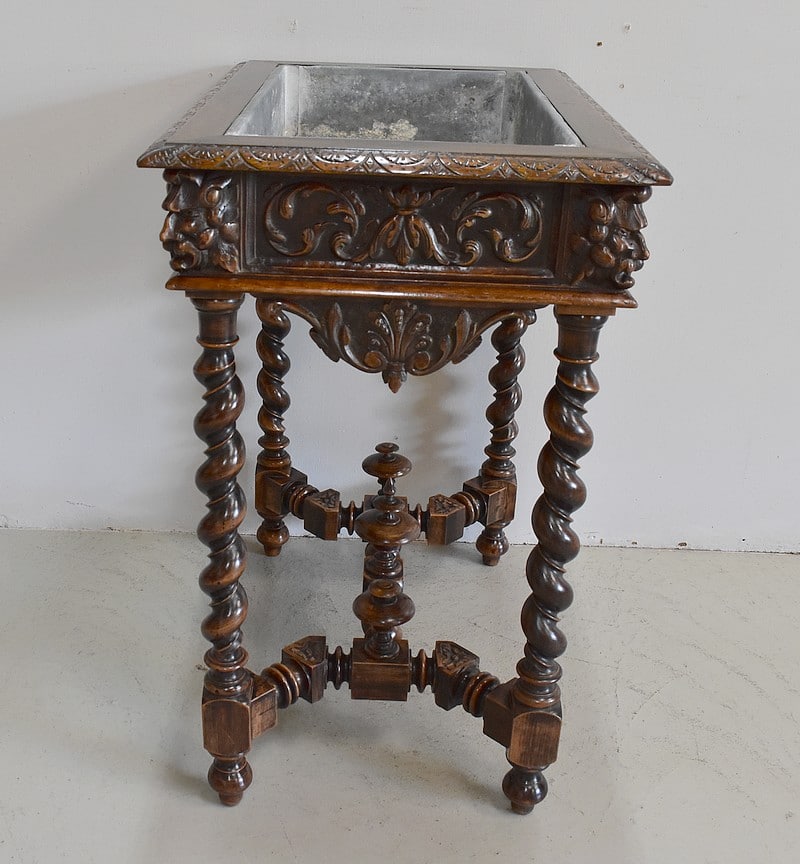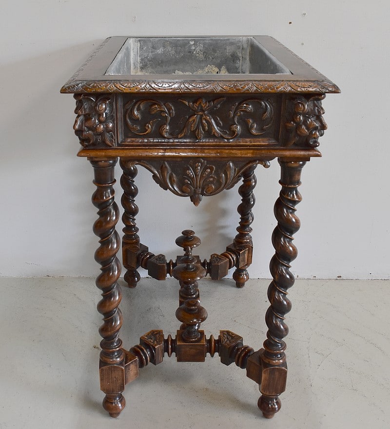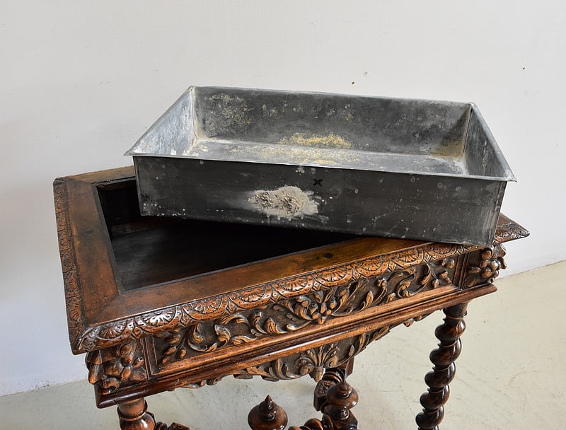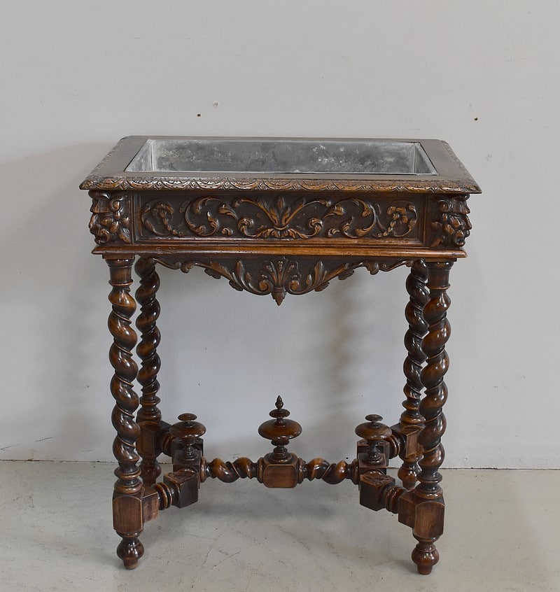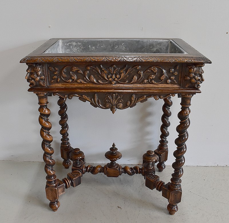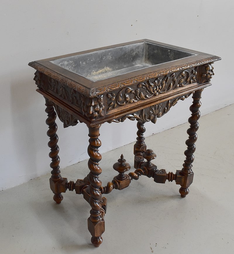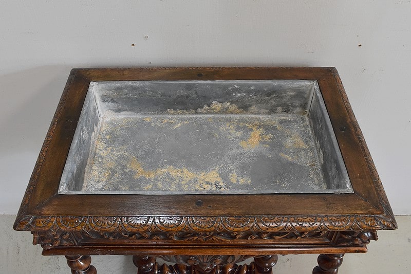Table rafraîchissoir de style Louis XIII en chêne tourné et sculpté. Son plateau est une cavité dans laquelle est incorporé un bac en zinc d’une profondeur de 11cm.