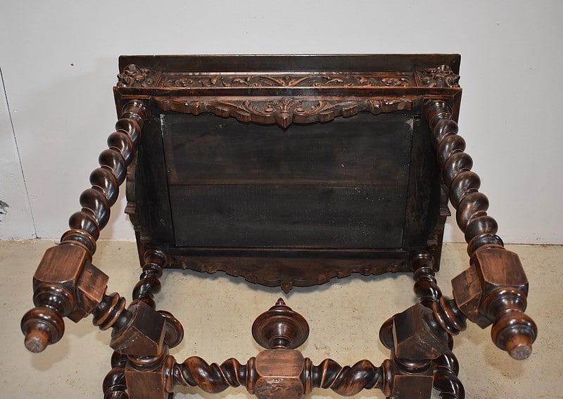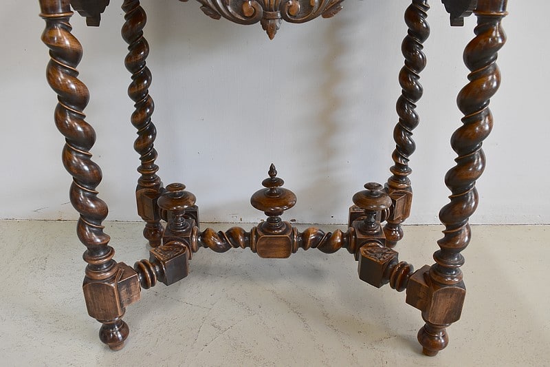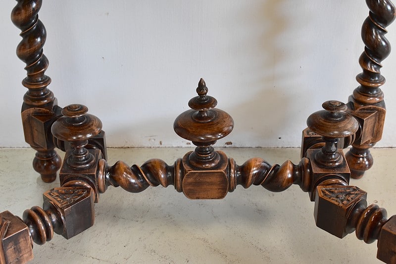 Elle repose sur 4 pieds torsadés et reliés par une entretoise à décor de toupies.
