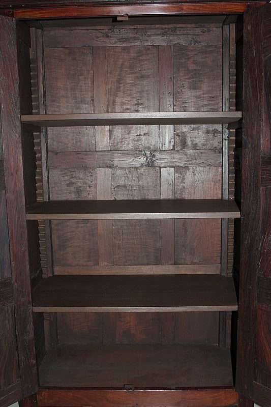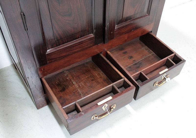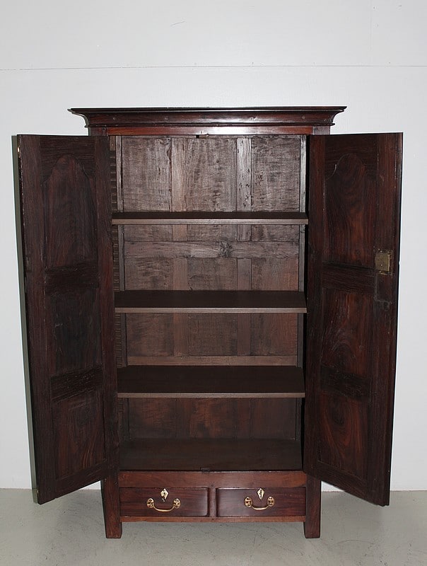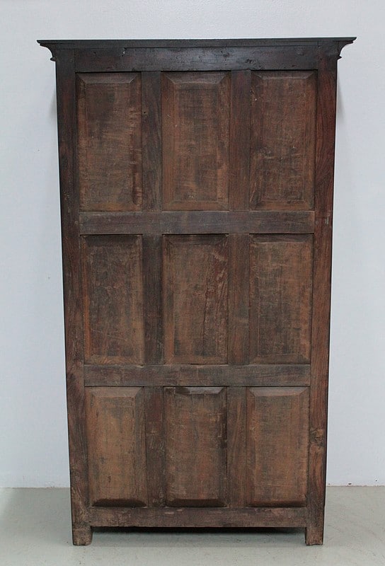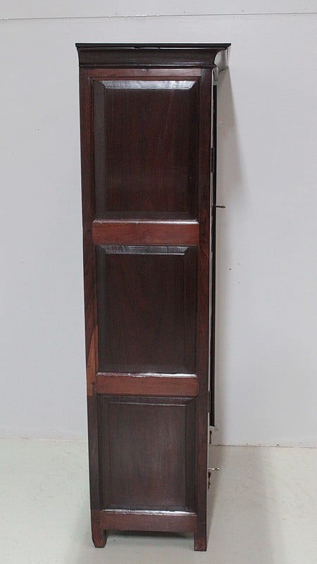 Armoire en Palissandre des Indes, dans le goût Louis XIV, ouvrant à 2 portes à 3 panneaux, celui du haut à découpe, et 2 tiroirs compartimentés fermant à clé, avec poignées en laiton, en partie basse.