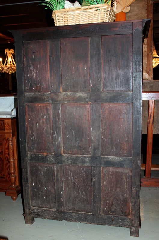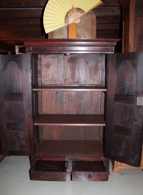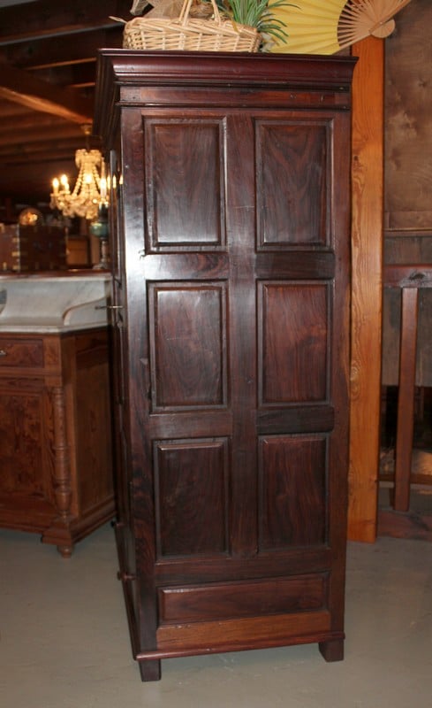 Petite Armoire dans le goût Louis XIV en palissandre ouvrant par 2 portes et 2 tiroirs en partie basse. L’intérieur est garni de 2 étagères en acajou, et ses côtés sont à 6 panneaux. Région de Pondichéry (Inde). Époque : seconde moitié du XIXe.