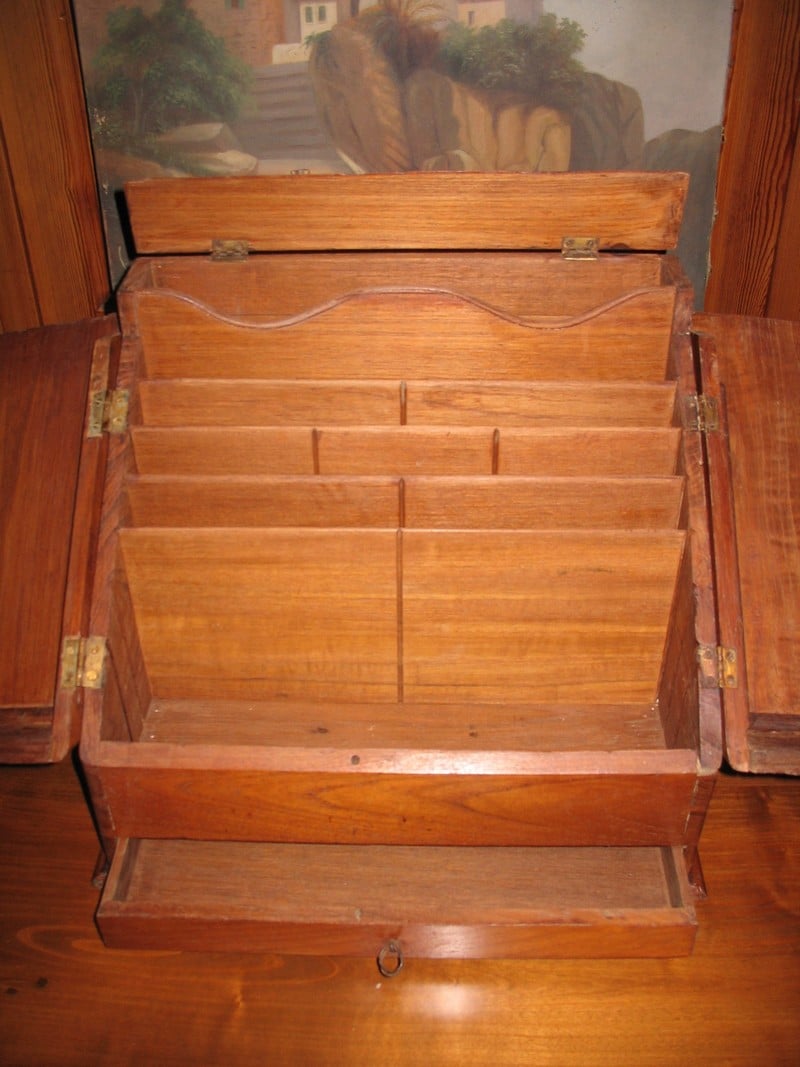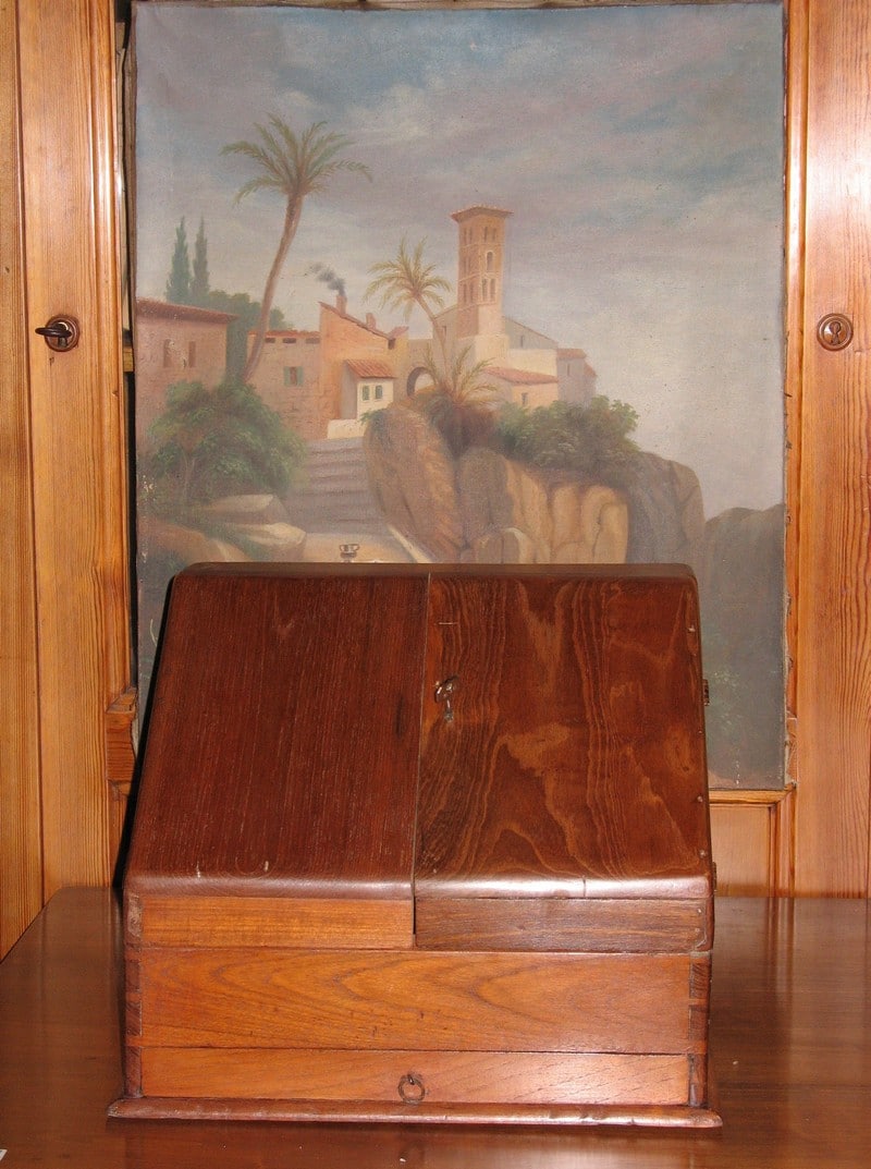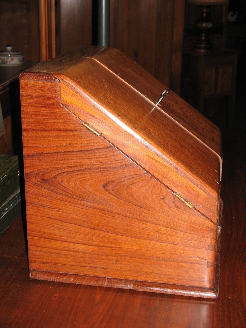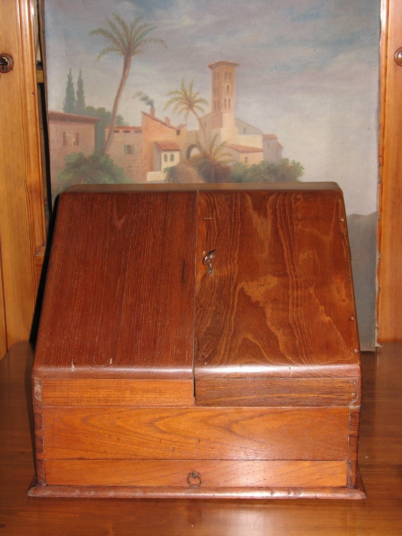 Coffret à courrier en teck fermant à clé. Intérieur compartimenté et petit tiroir en partie basse. Région de Pondichéry (Inde), Fin XIXe