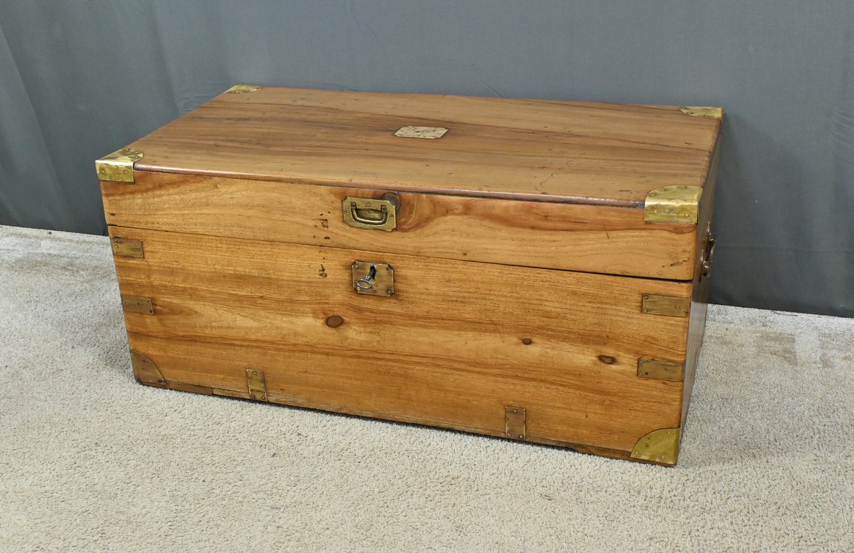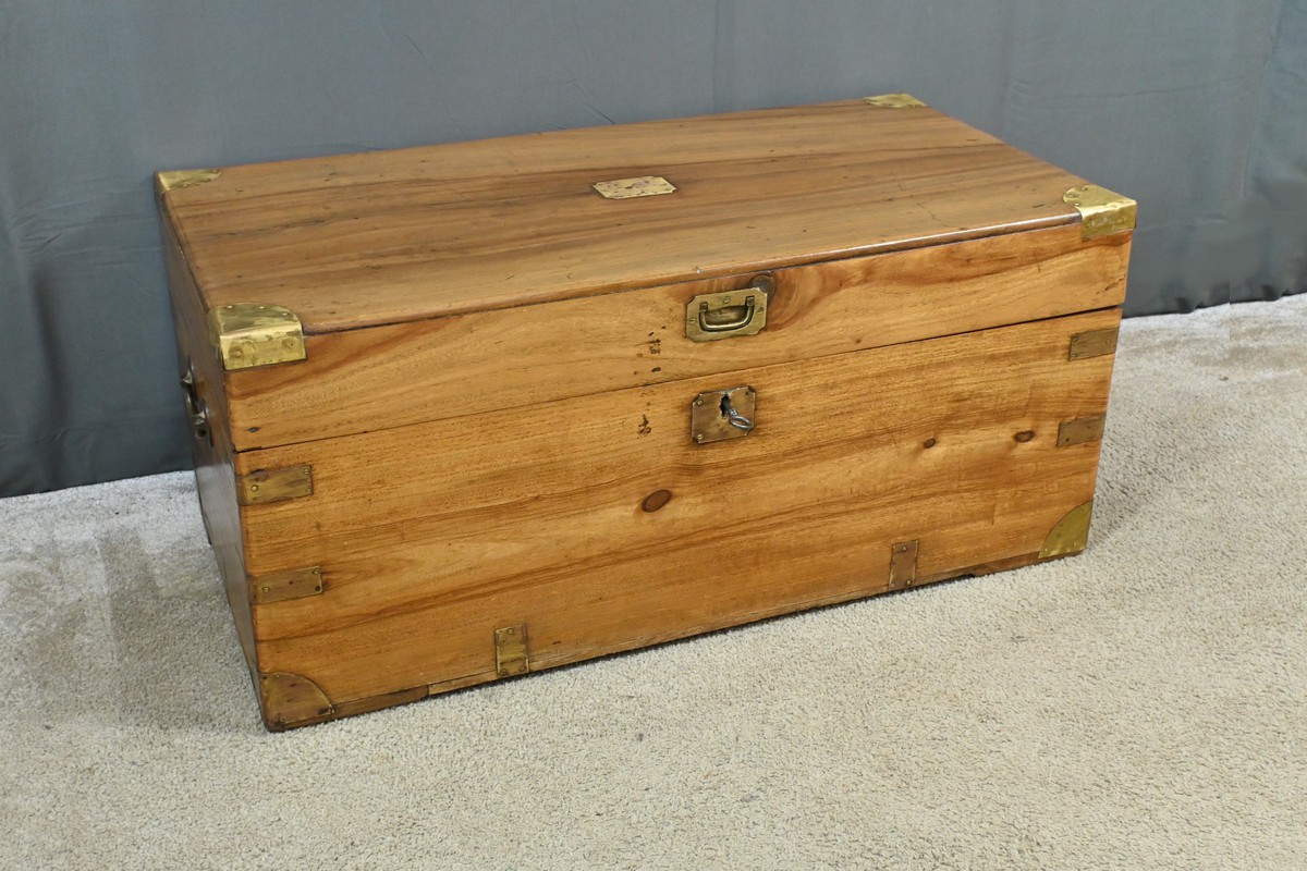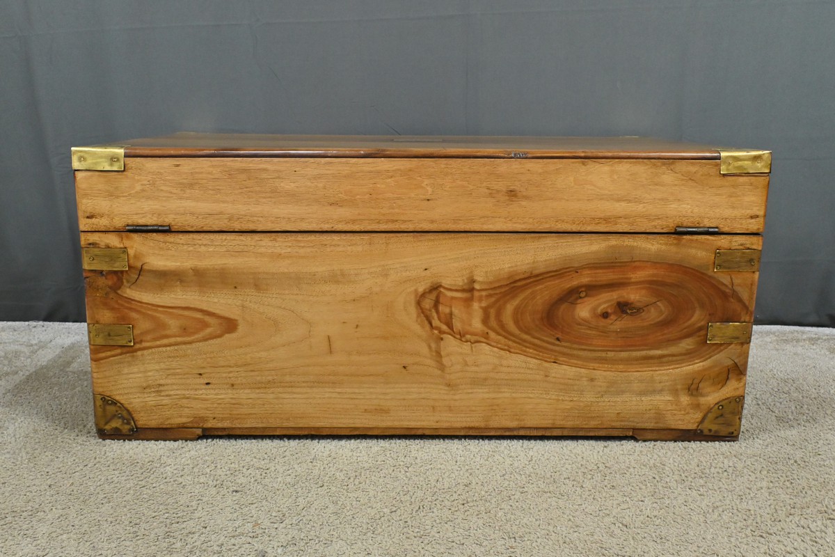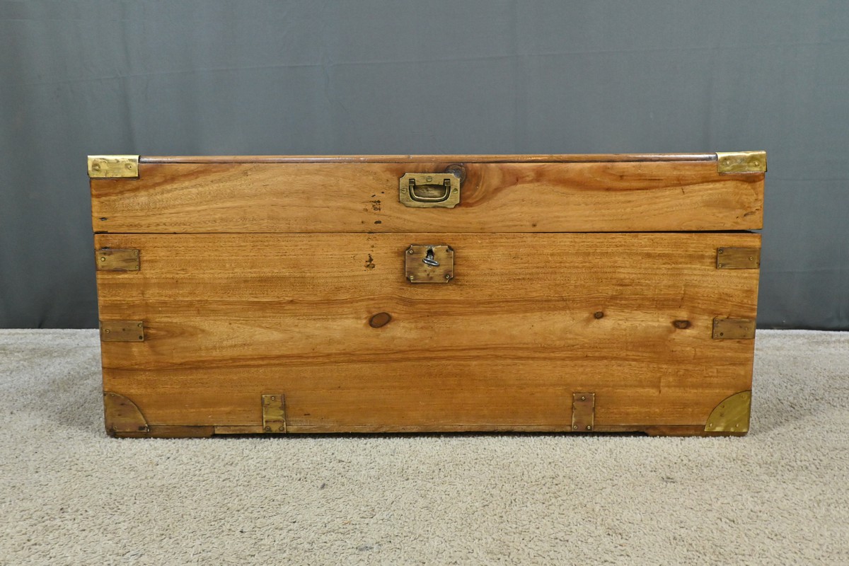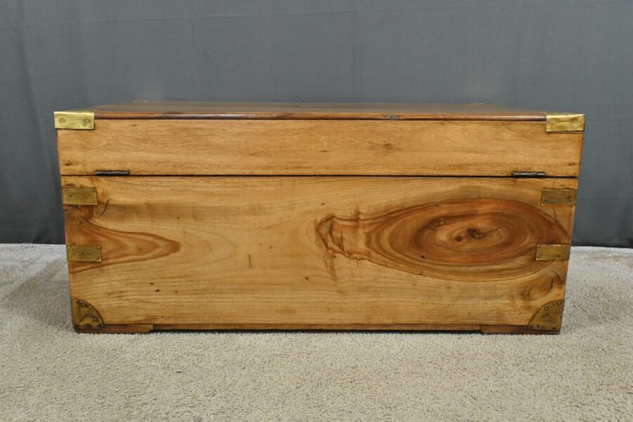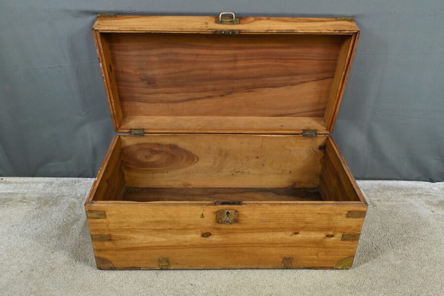Dans le tumulte de la mer, cette malle était bien plus qu’un simple contenant : c’était un véritable compagnon de route, témoin silencieux des voyages maritimes du XIXe siècle, une malle de marine en camphrier fabriquée en Indes des périples des marins et des explorateurs.
