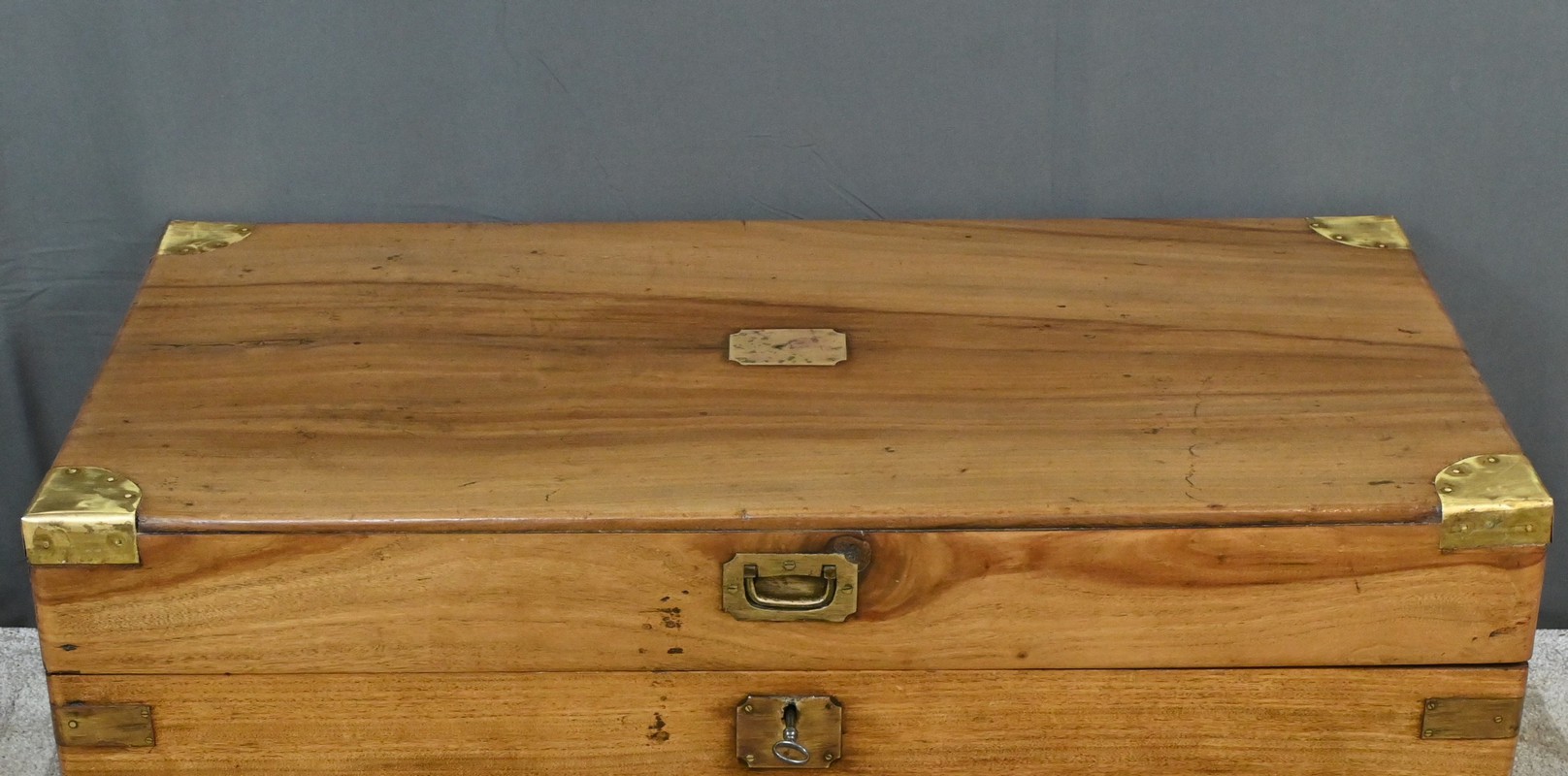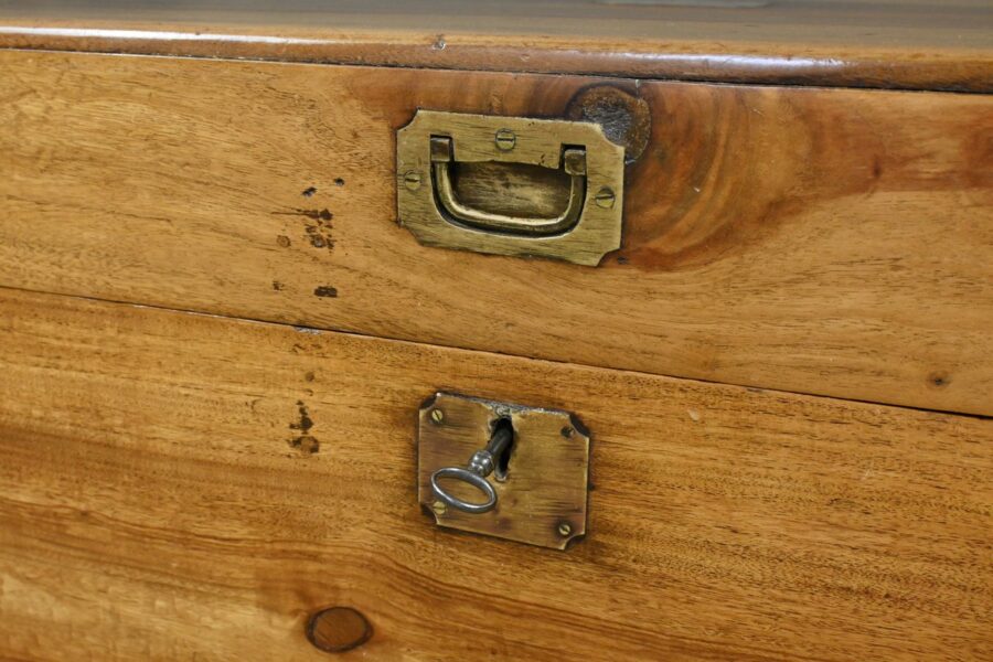 L’authenticité de cette pièce est confirmée par sa serrure d’époque, garantissant la sécurité de son contenu, et par sa poignée bateau incrustée, typique des accessoires marins.