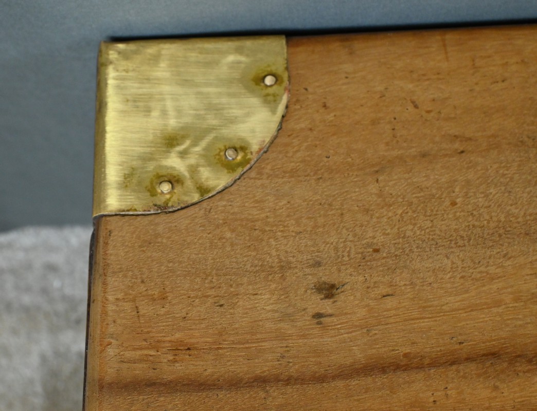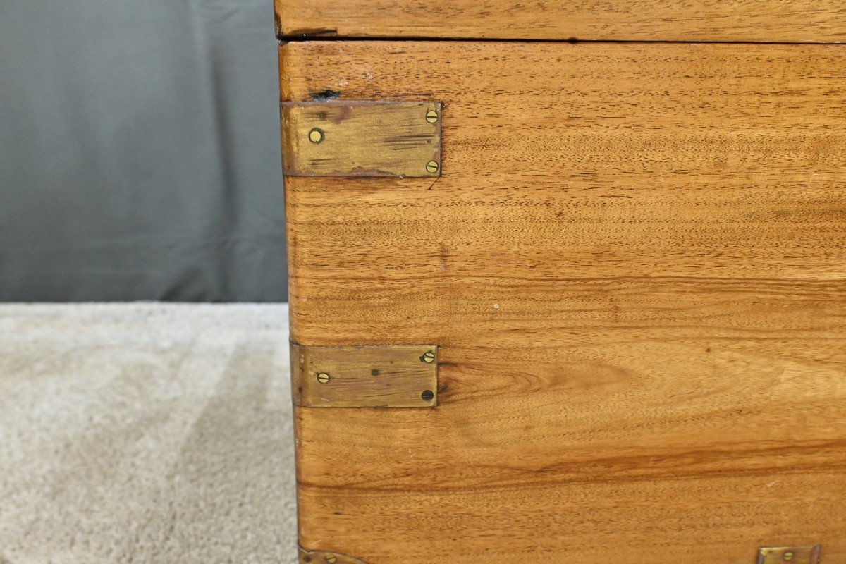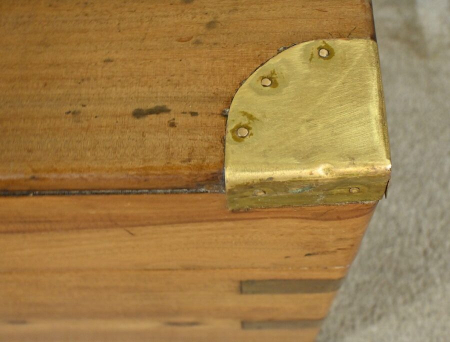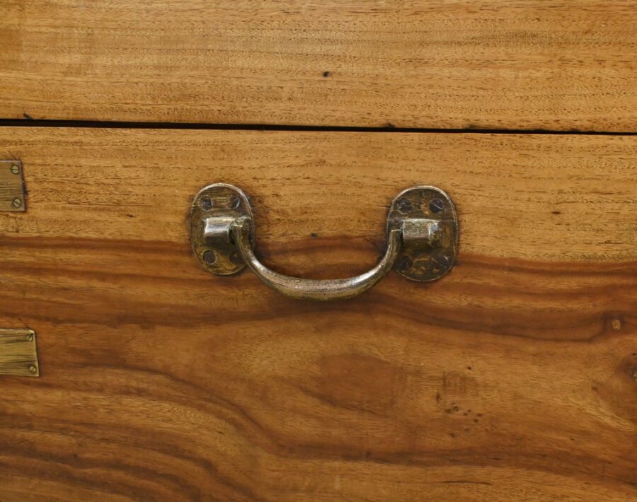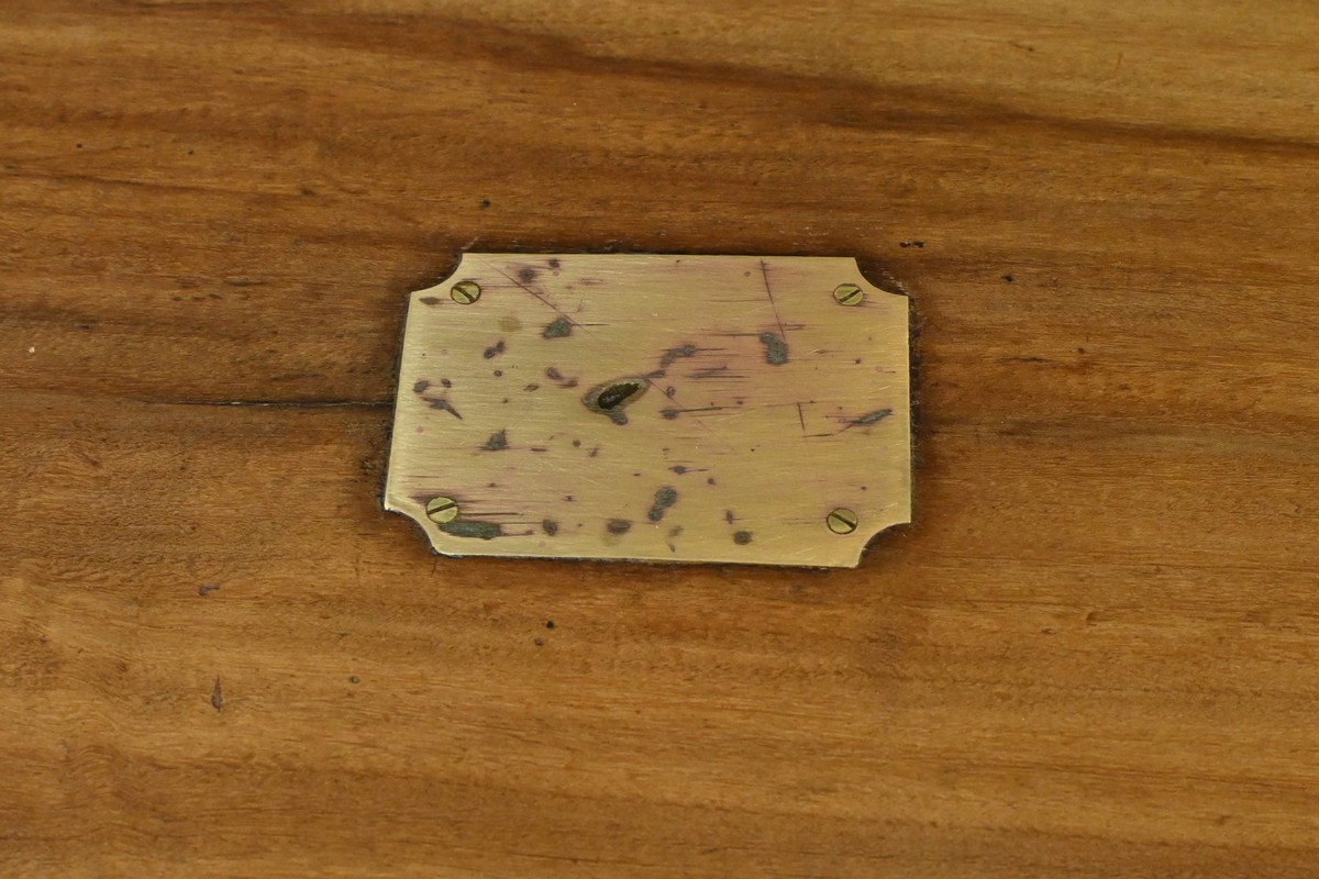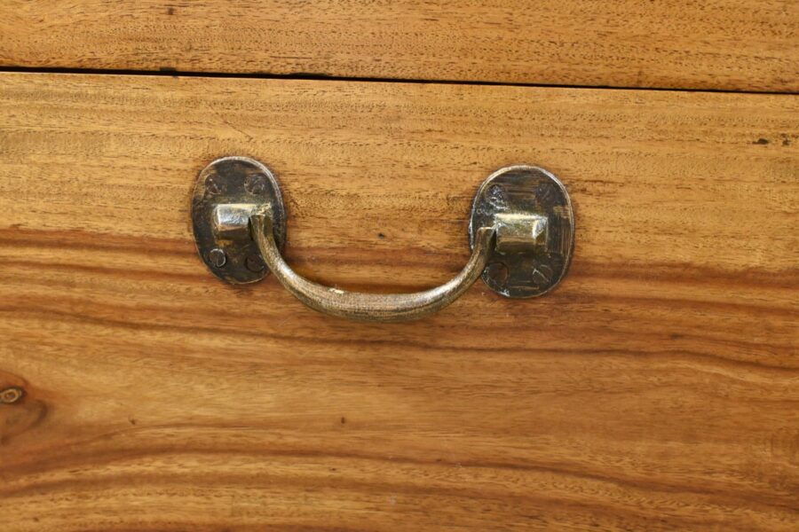Chaque côté présente des poignées en bronze afin d’offrir une prise sûre et confortable, facilitant le transport de ce meuble de marine.