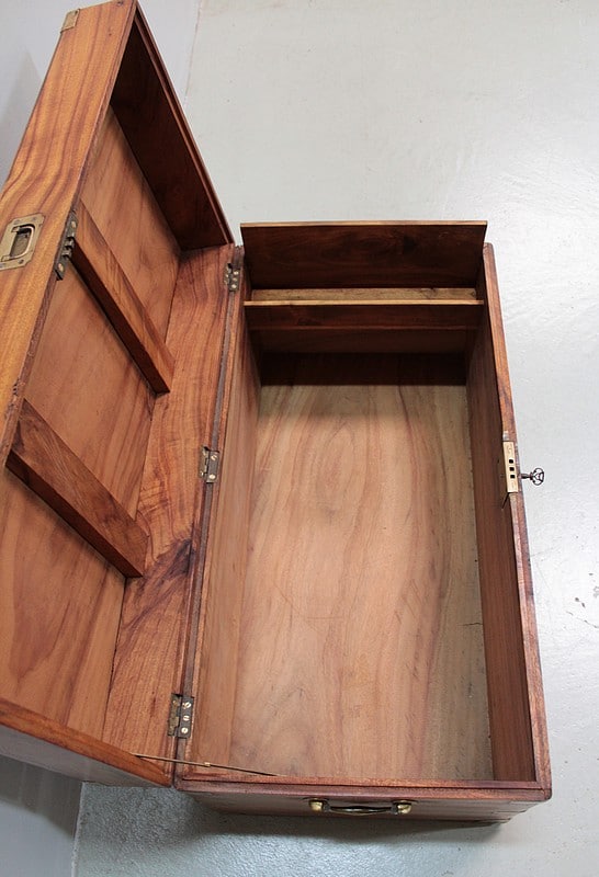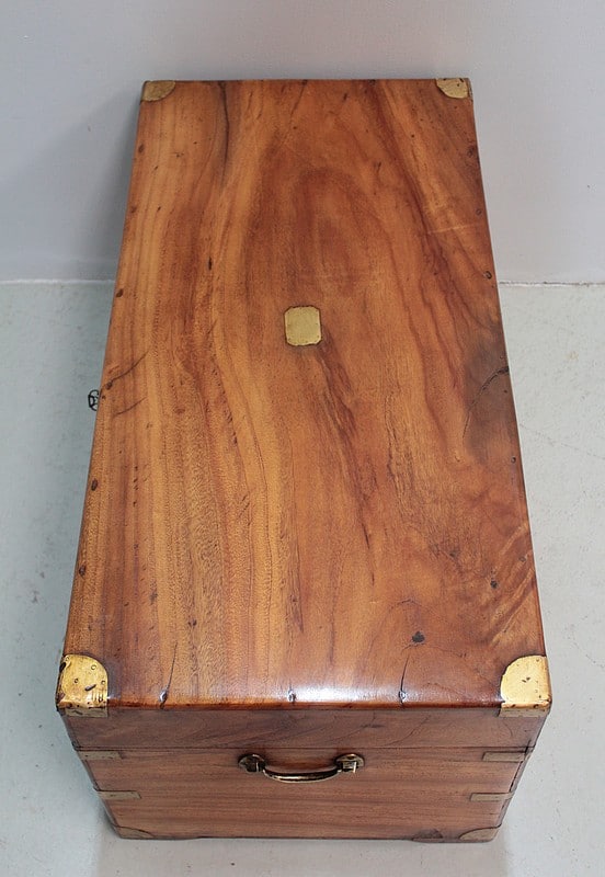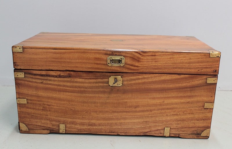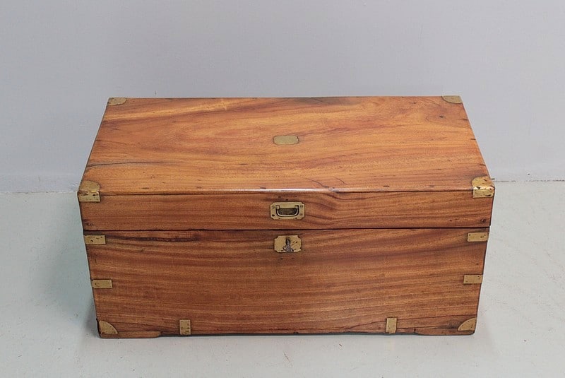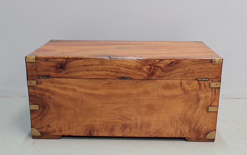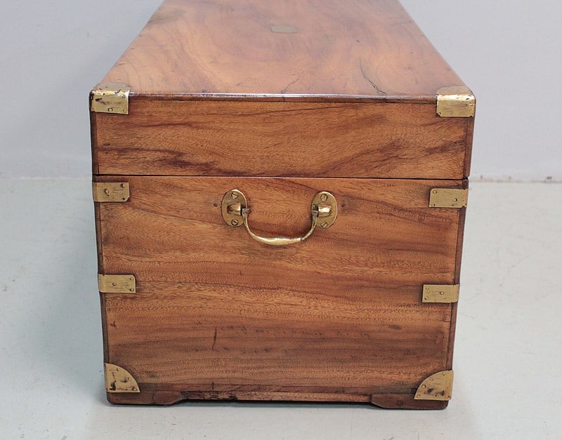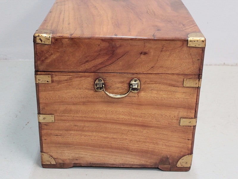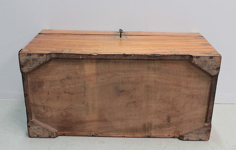 Malle de voyage en camphrier blond en provenance de Pondichéry, ancien comptoir français des Indes.
