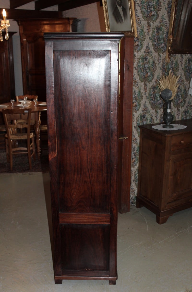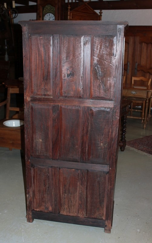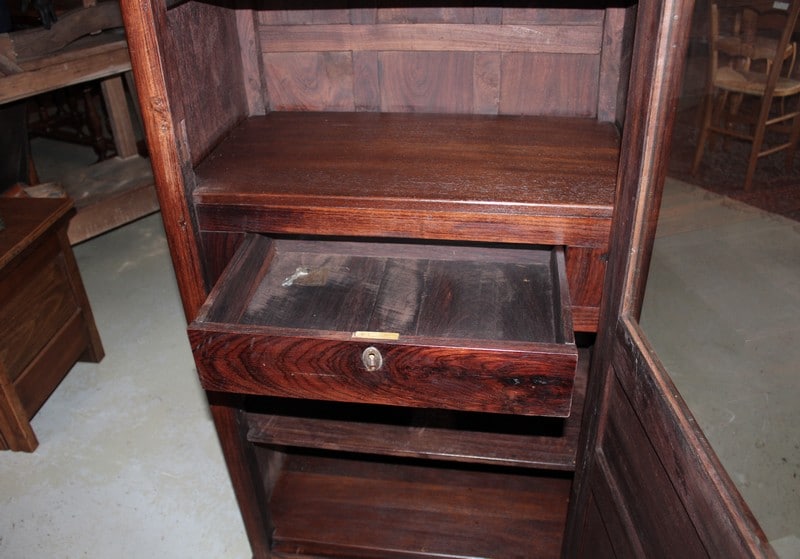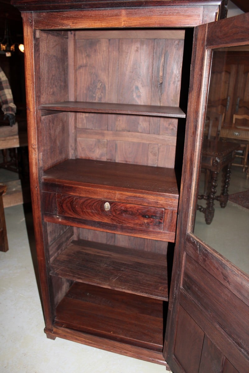 Petit meuble en palissandre ouvrant par une porte vitrée en partie haute. A l’intérieur : 1 tiroir au milieu et 3 étagères. Région de Pondichéry (Inde)