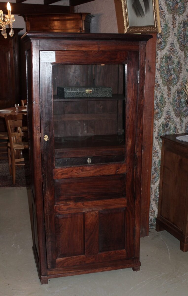 Petit meuble en palissandre ouvrant par une porte vitrée en partie haute. A l’intérieur : 1 tiroir au milieu et 3 étagères. Région de Pondichéry (Inde)