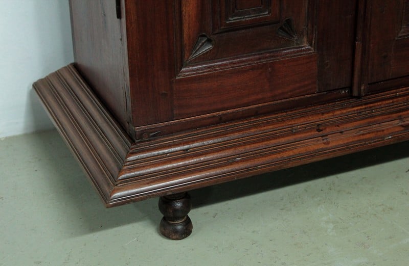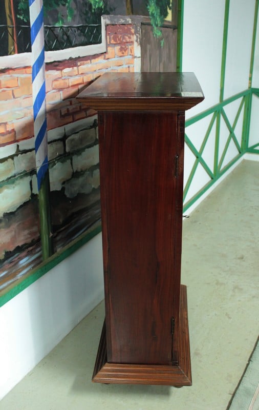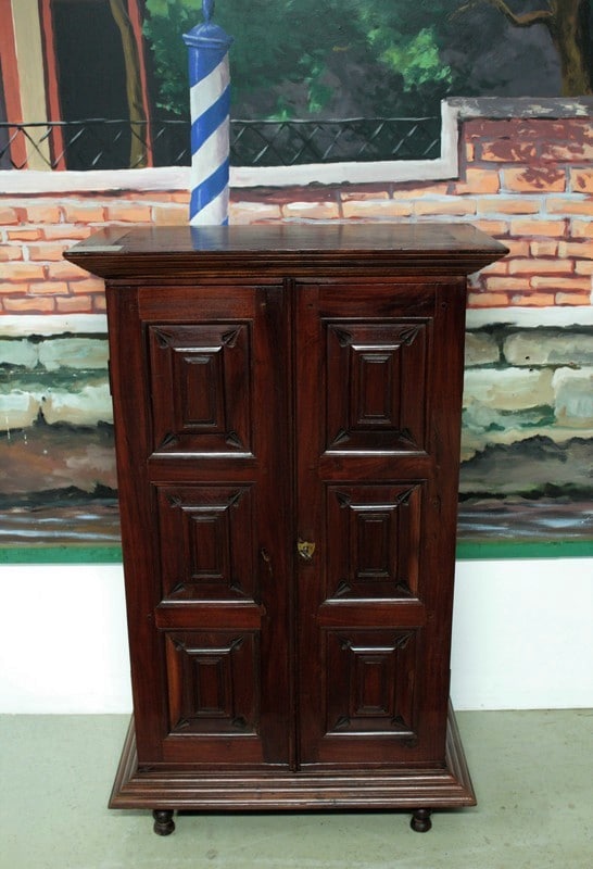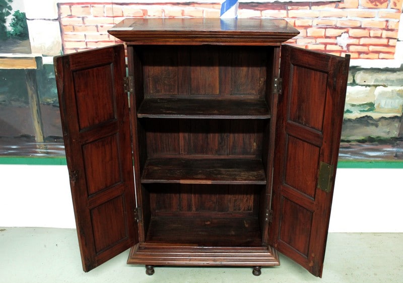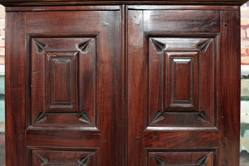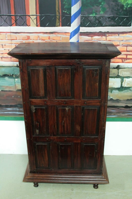 Petit meuble d’appui en acajou dans le goût Louis XIII ouvrant à 2 portes décorées de 3 panneaux. L’intérieur est garni de 2 étagères. Région de Pondichéry, ancien comptoir français de l’Inde. Époque : fin XIXe