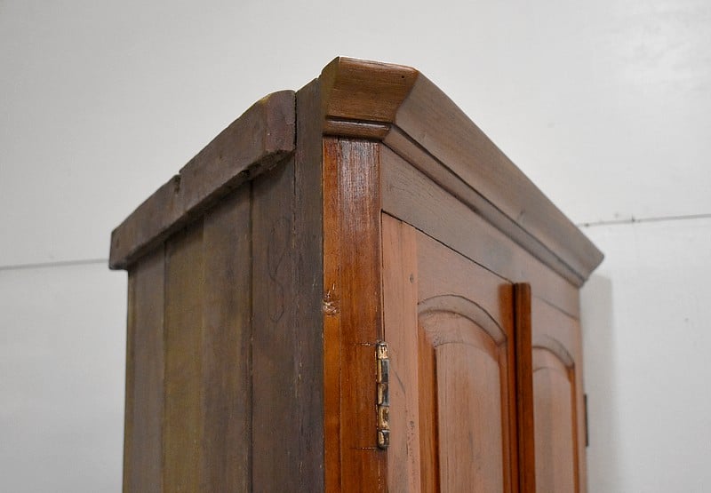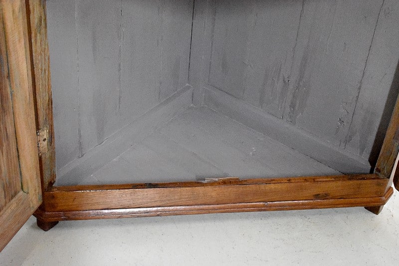 Il ouvre par deux portes panneautées fermant à clef donnant accès à deux étagères triangulaires posées sur tasseaux fixes. L’intérieur et les étagères sont peints en gris.