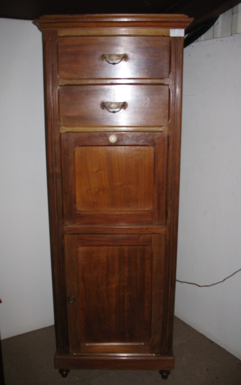 Meuble-lavabo de cabine de bateau en Acajou blond. 2 tiroirs en partie haute, 1 cuvette en faïence fixée sur porte basculante, 1 bac de récupération des eaux usées en partie basse. Début XXe.