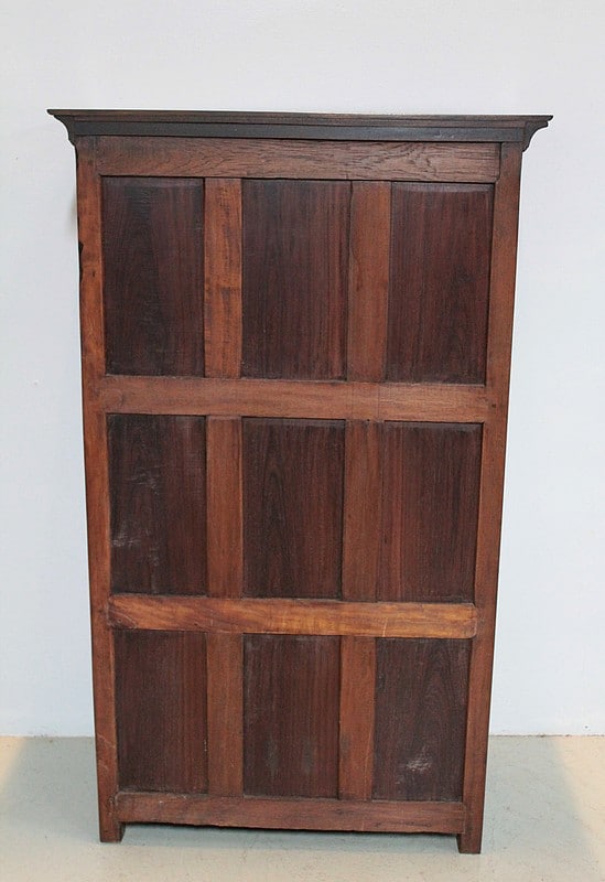Les portes sont à 3 panneaux – en palissandre – celui du haut à découpe Louis XIV. Les côtés sont également à 3 panneaux en palissandre.