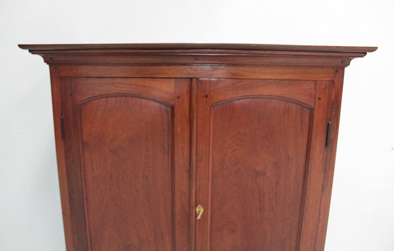 Petite armoire en teck ouvrant par 2 portes à 2 panneaux, celui du haut cintré, et fermant à clé. Les côtés sont également à 2 panneaux. Dessus en teck, entouré d’une corniche moulurée.